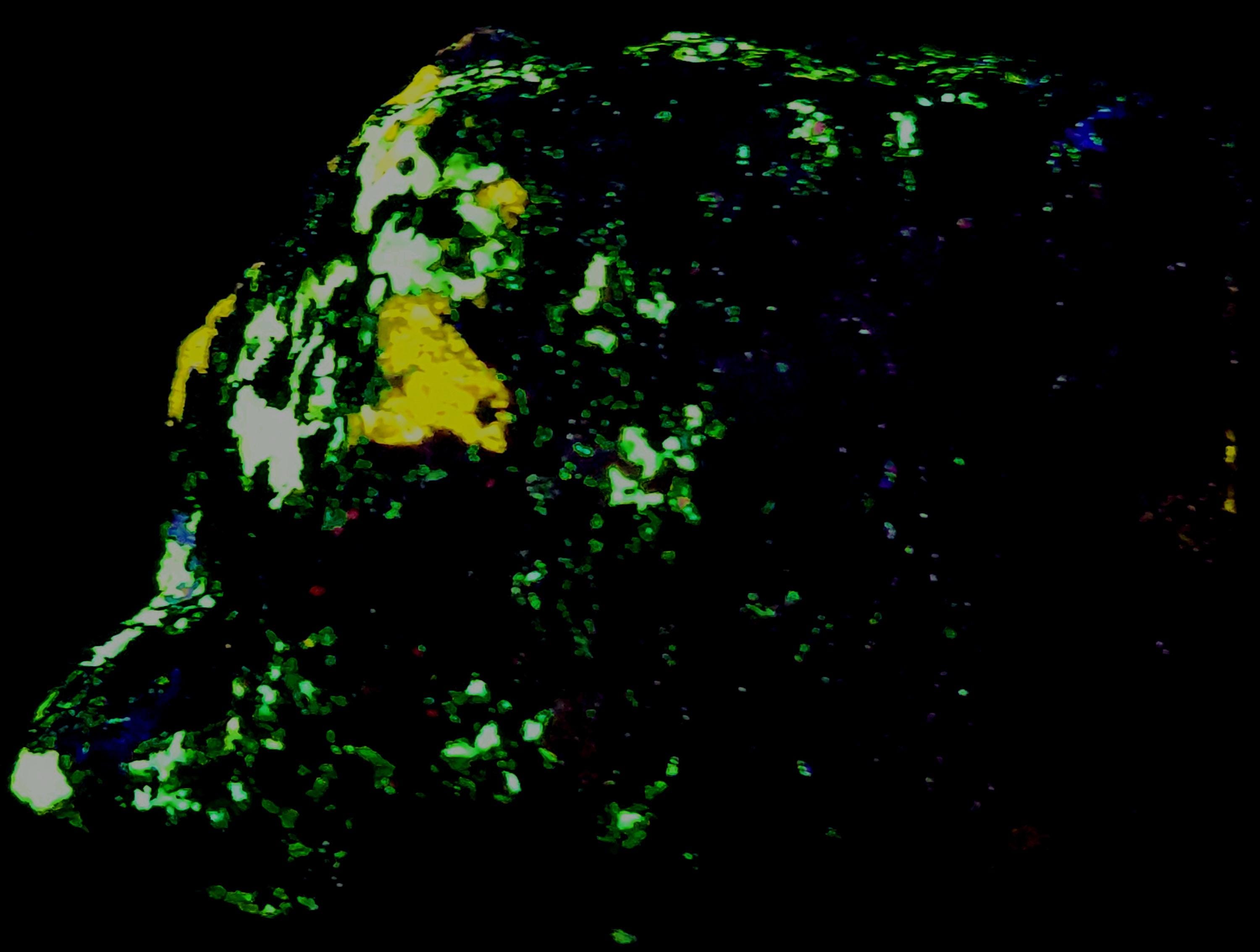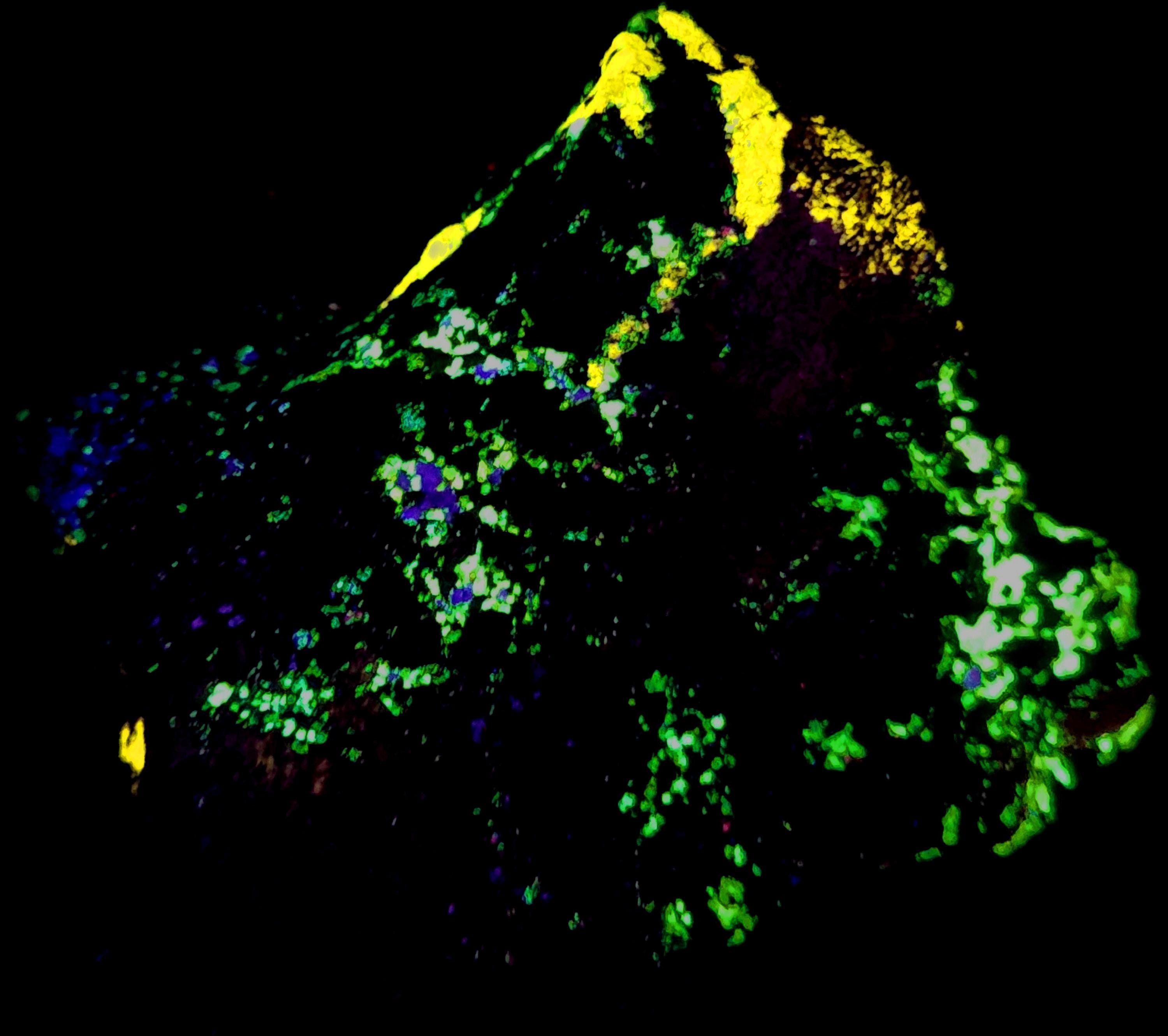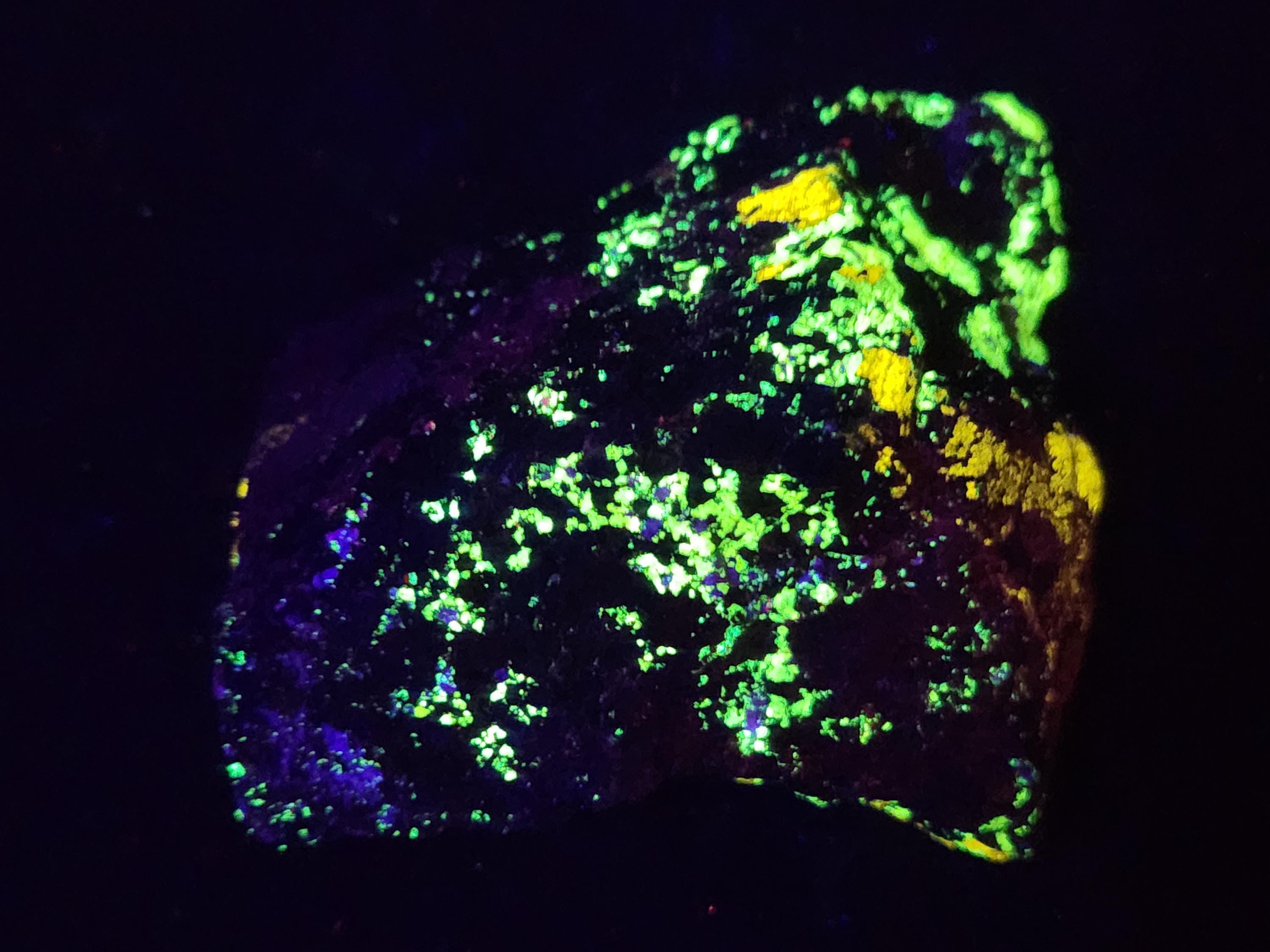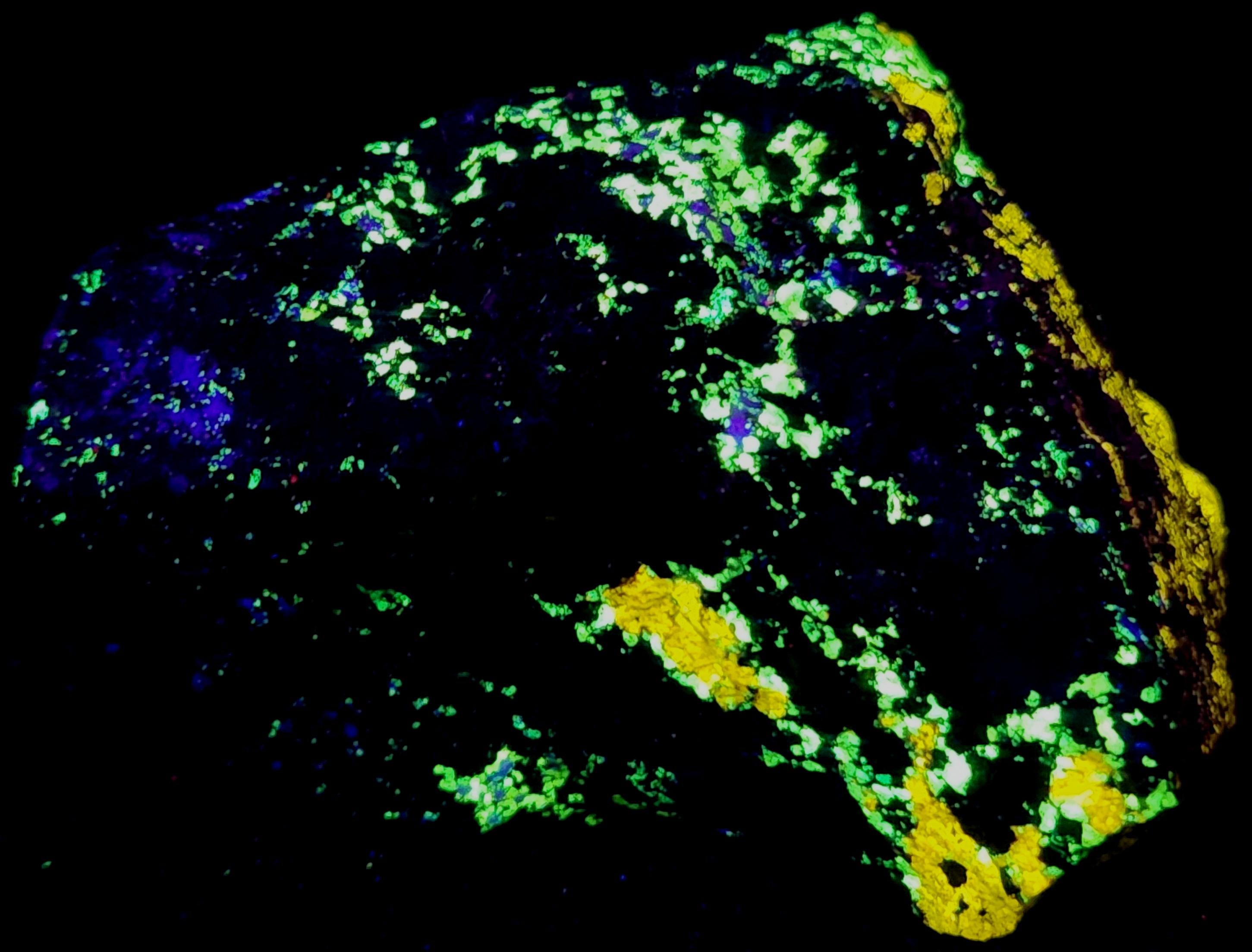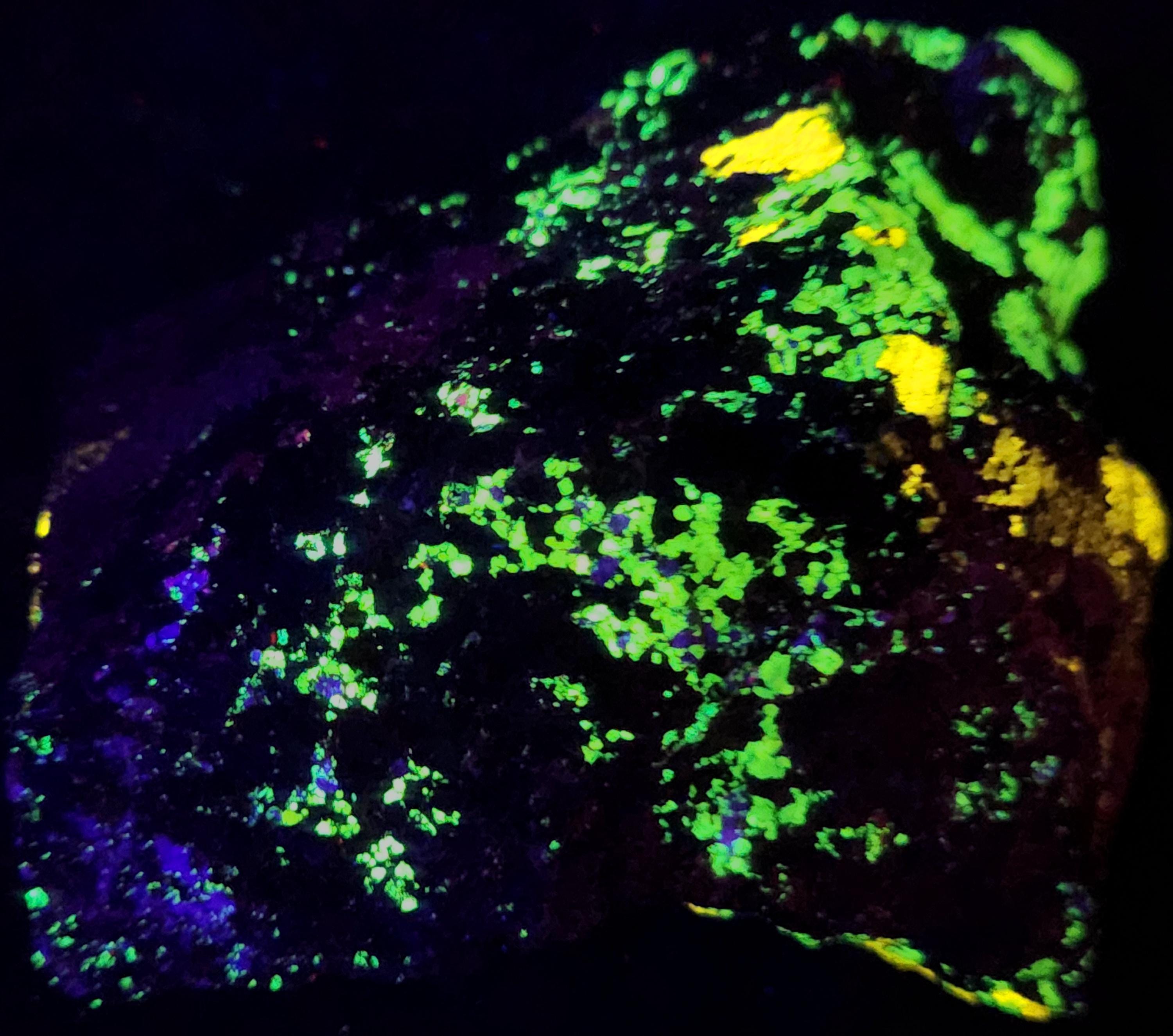 Fluorescent Willemite (Bright Green SW & LW), Esperite (Bright Yellow SW) & some minor Hardystonite (Blue / Violet SW)