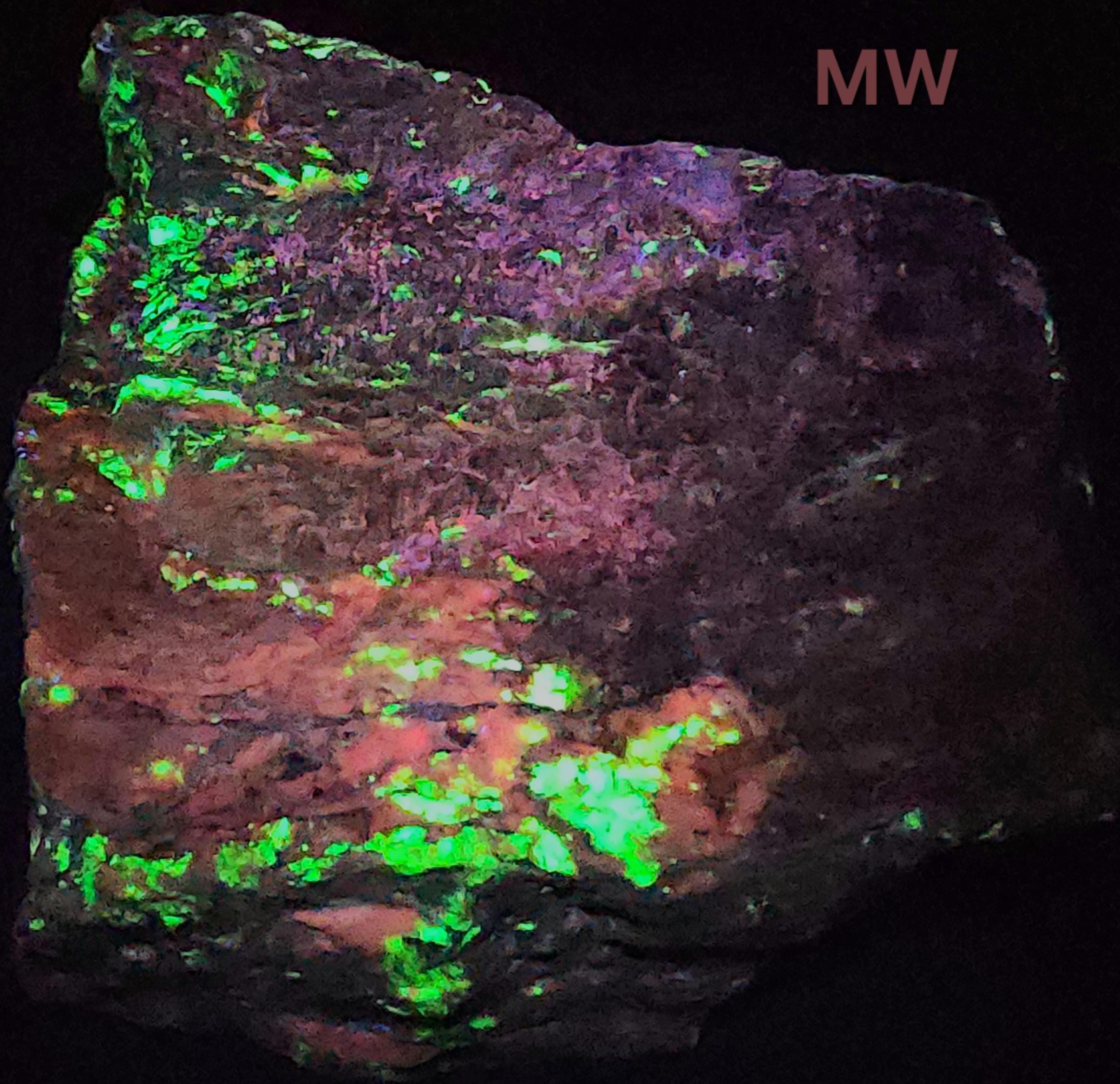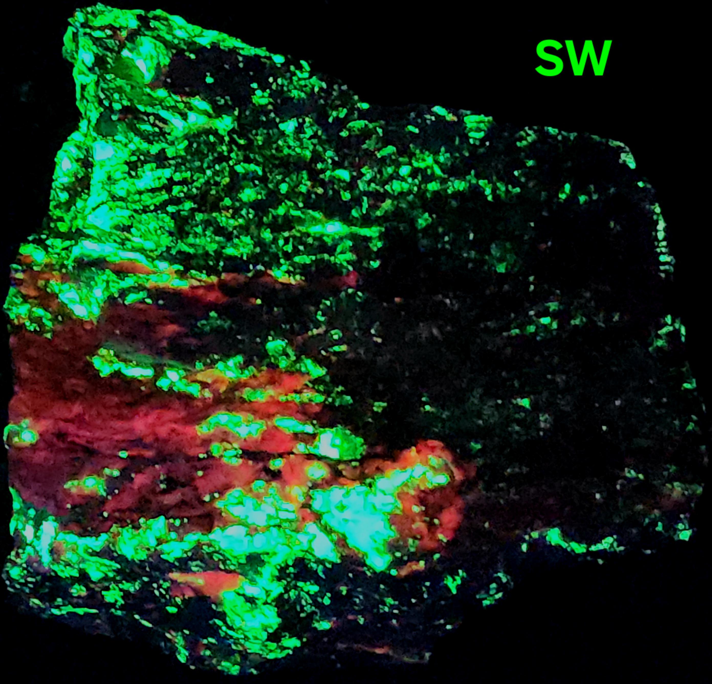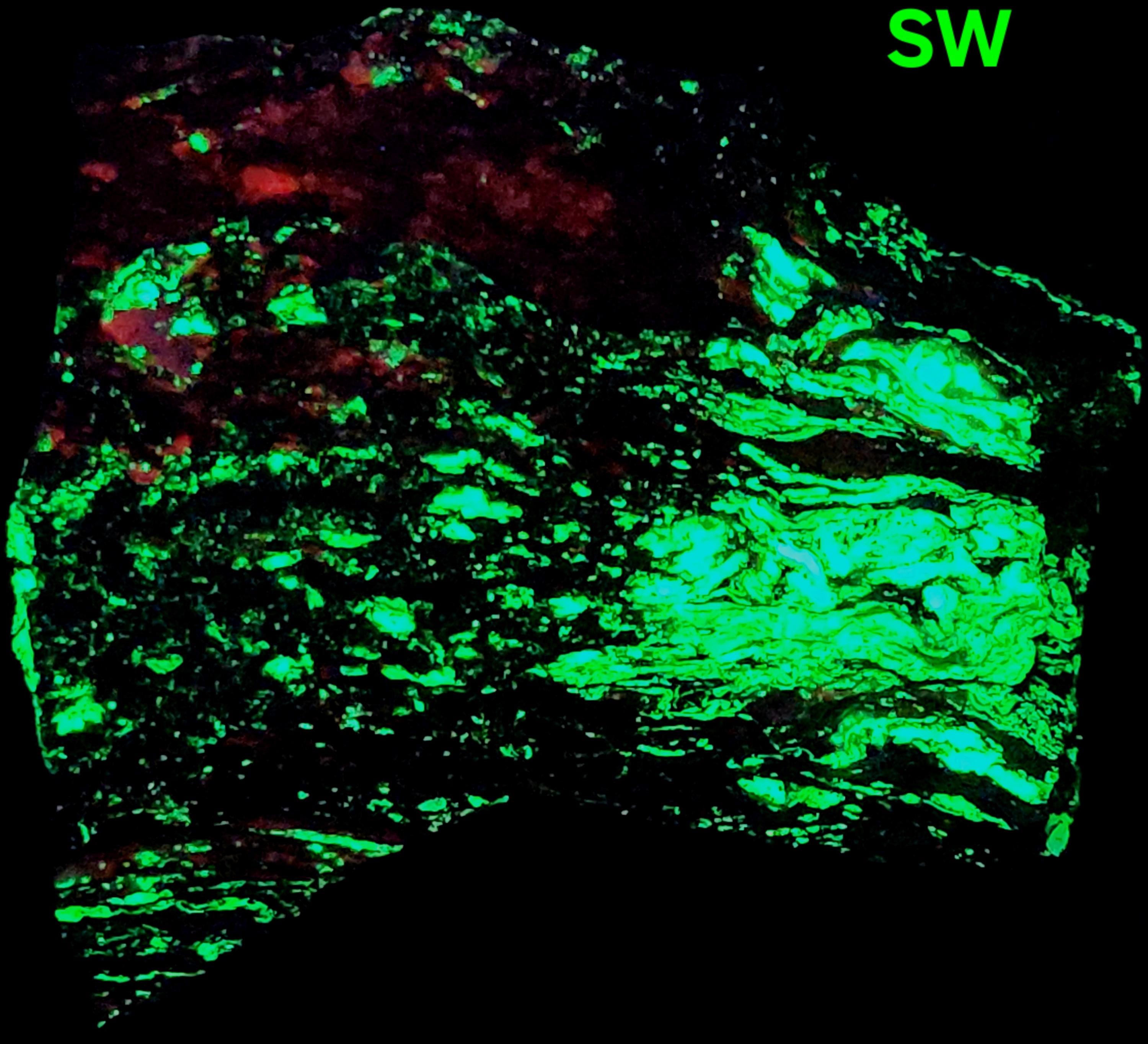 Fluorescent Willemite (Bright Green SW, MW & LW), Calcite (Bright Red/Orange SW + Dull Pink/Red MW/LW) & Sphalerite (Pink/Purple MW & LW)