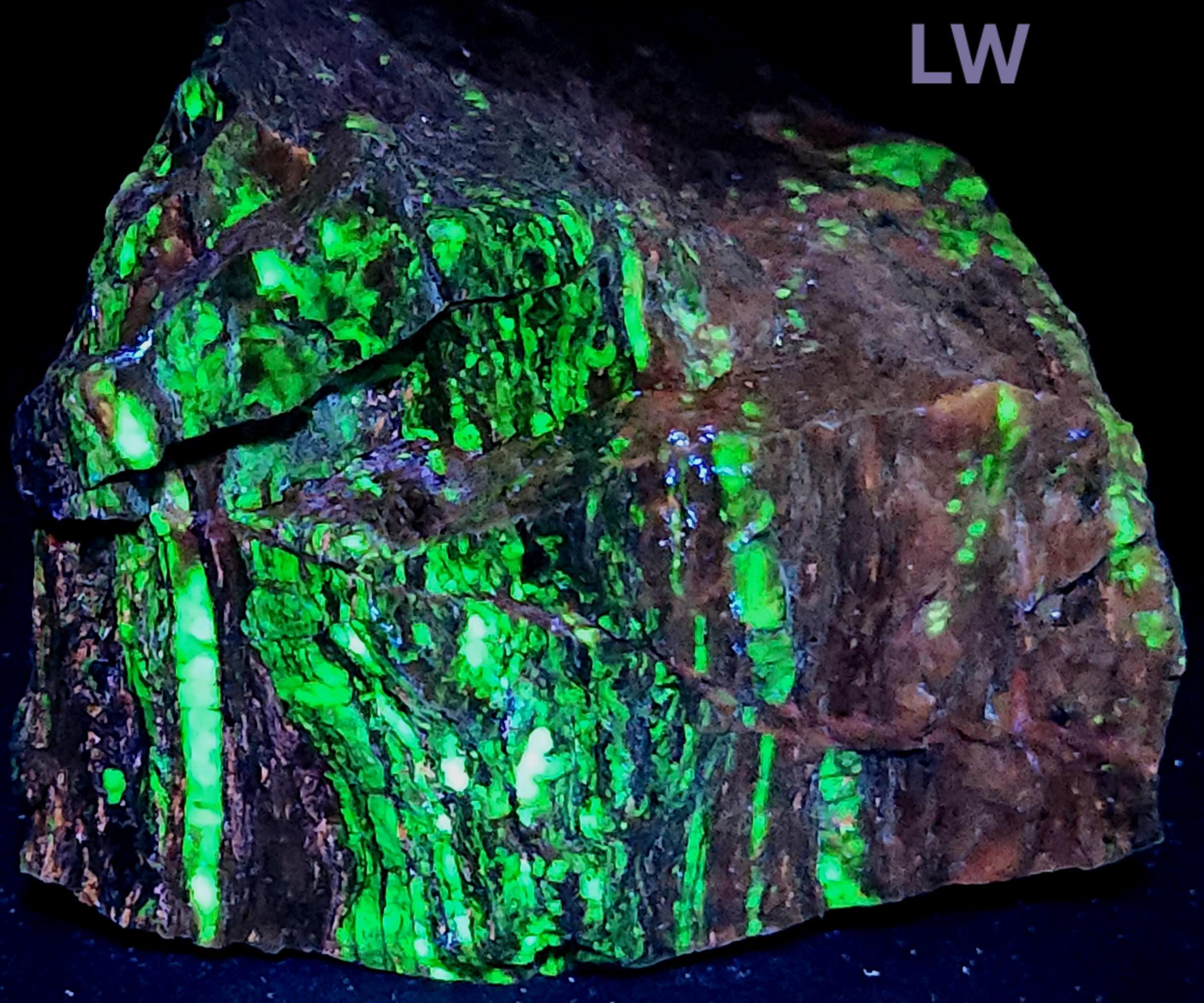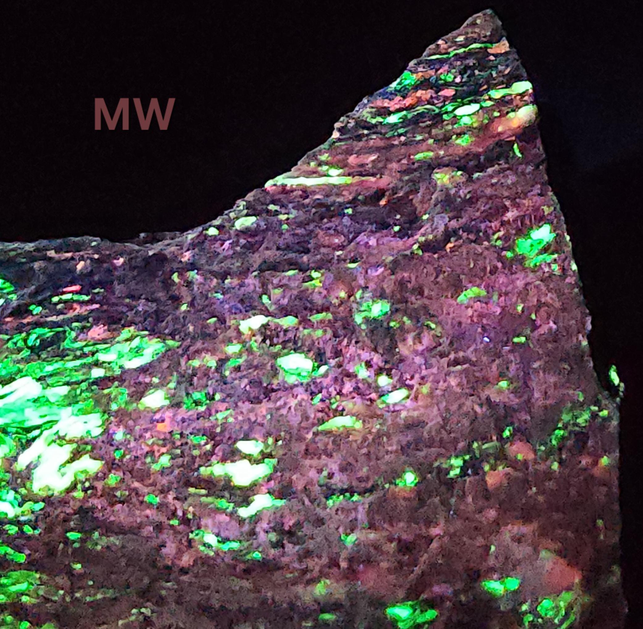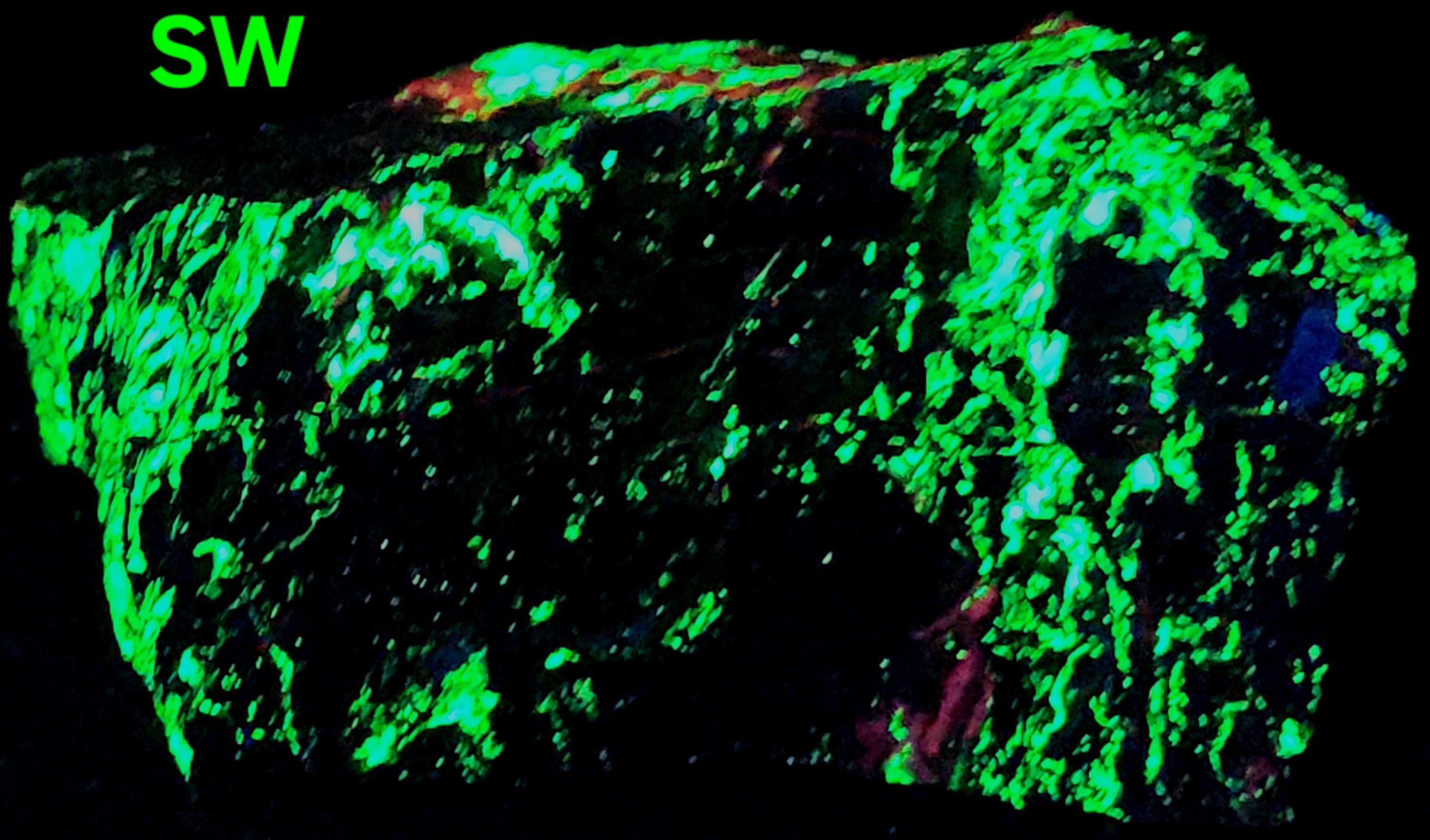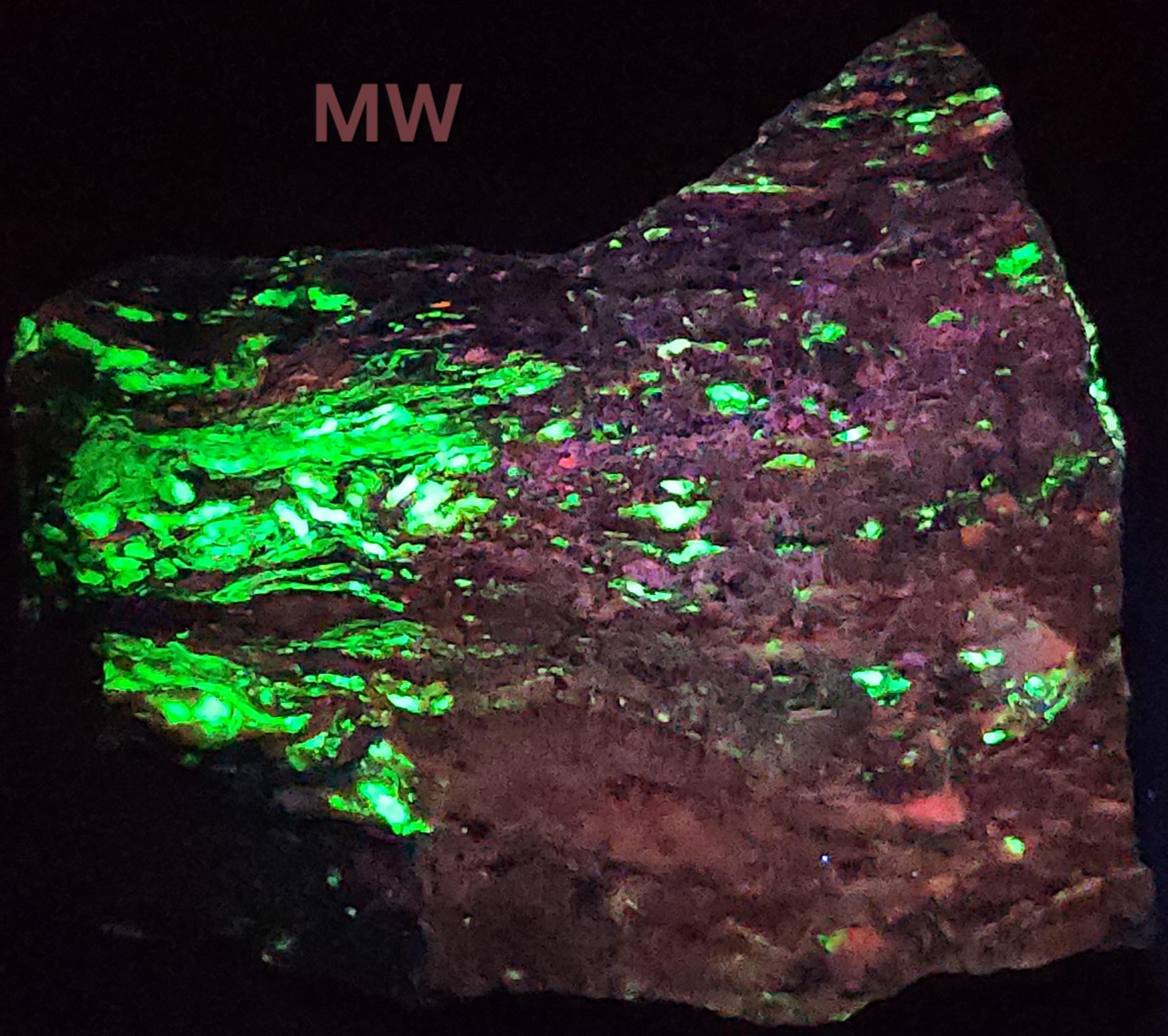 Fluorescent Willemite (Bright Green SW, MW & LW), Calcite (Bright Red/Orange SW + Dull Pink/Red MW/LW) & Sphalerite (Pink/Purple MW & LW)