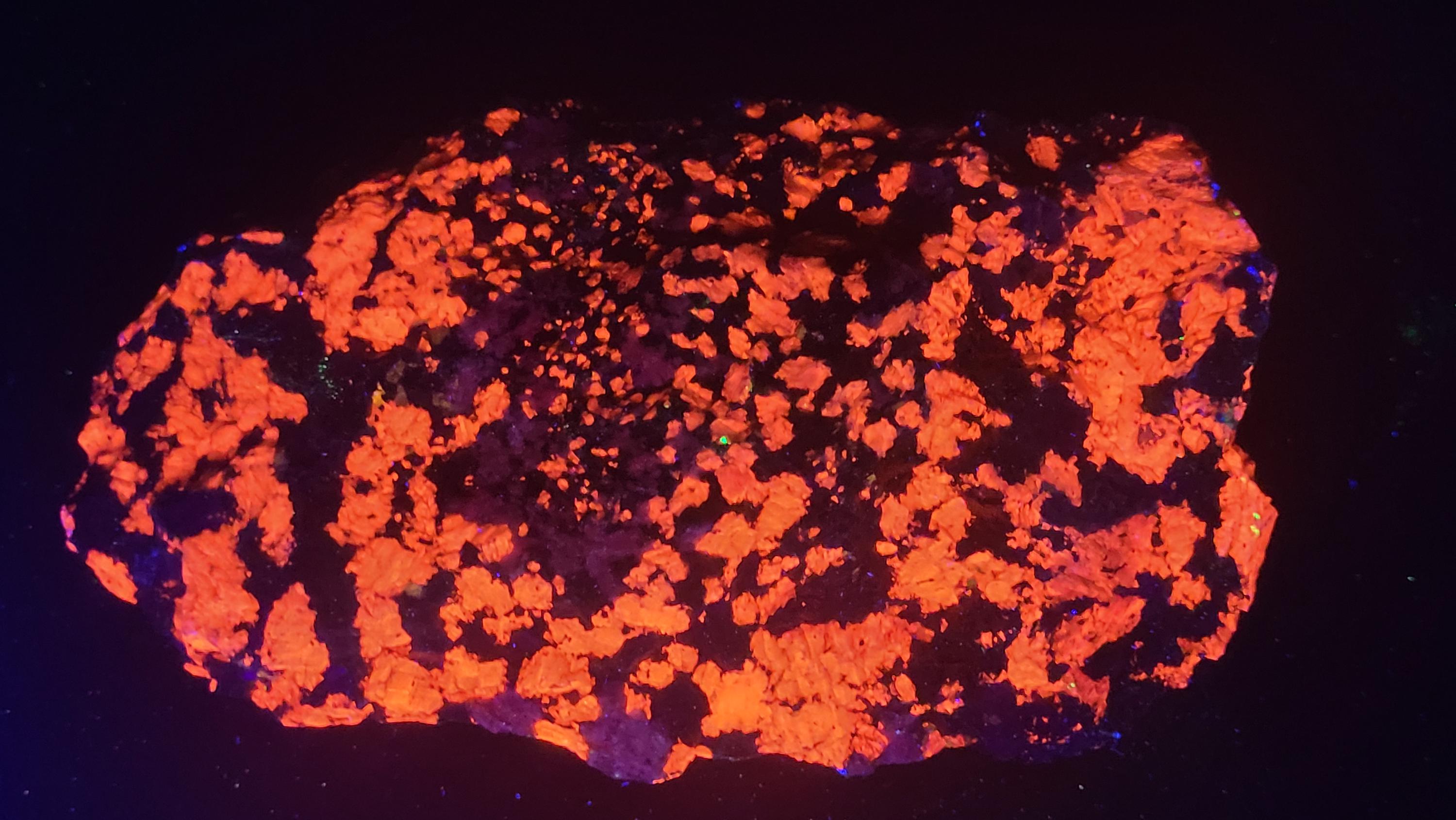 Fluorescent Genthelvite (Bright Mint Green LW & Very Dull Light Greenish-Blue SW) & Calcite (Bright Red/Orange SW & Pink LW) & Fluorapatite (Orange/Yellow SW)