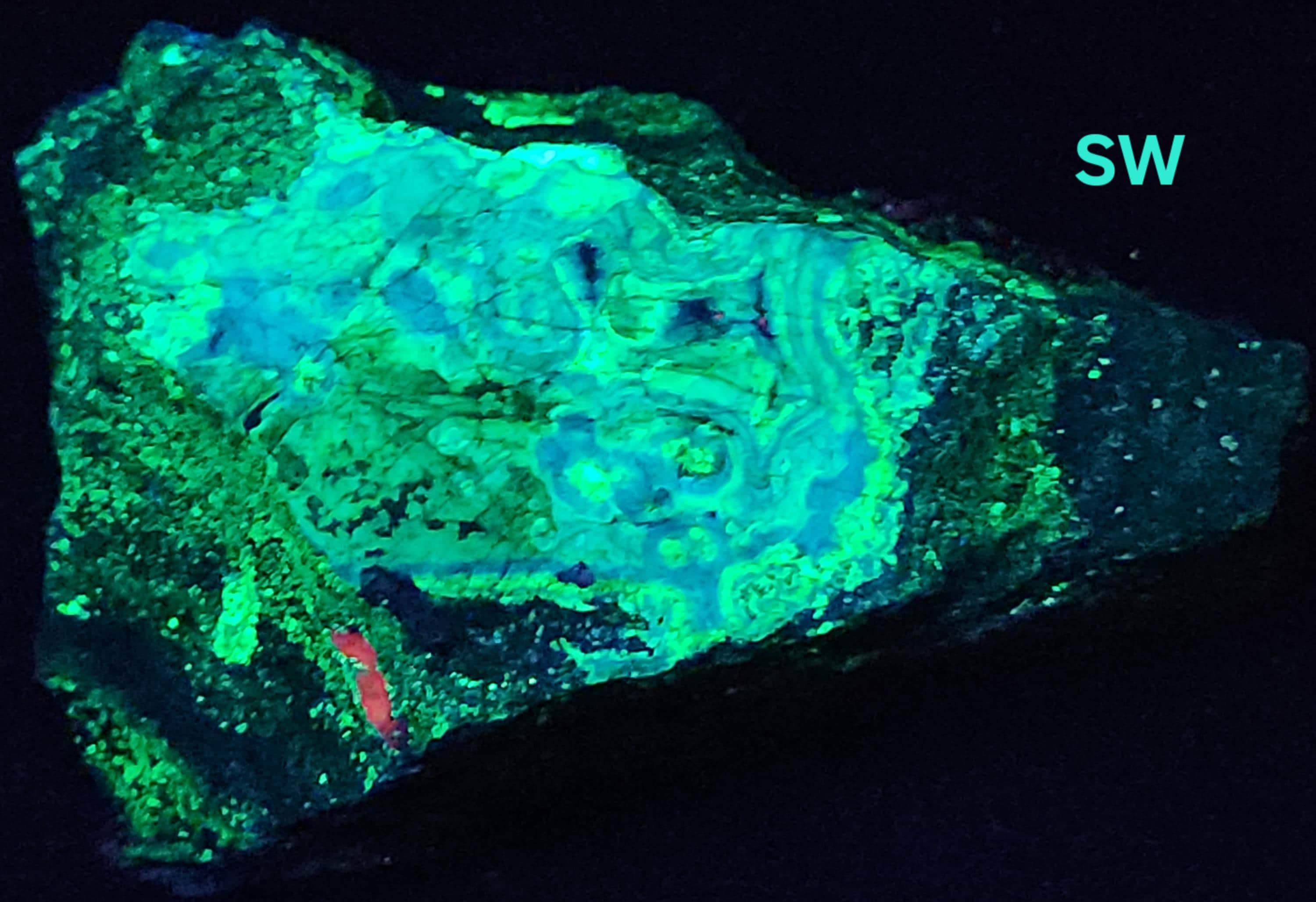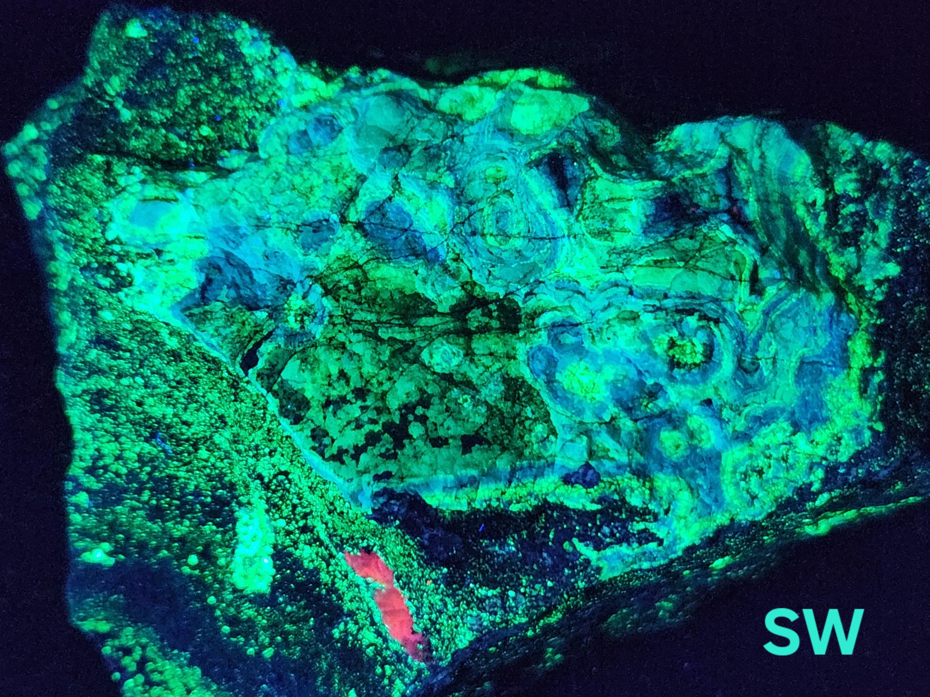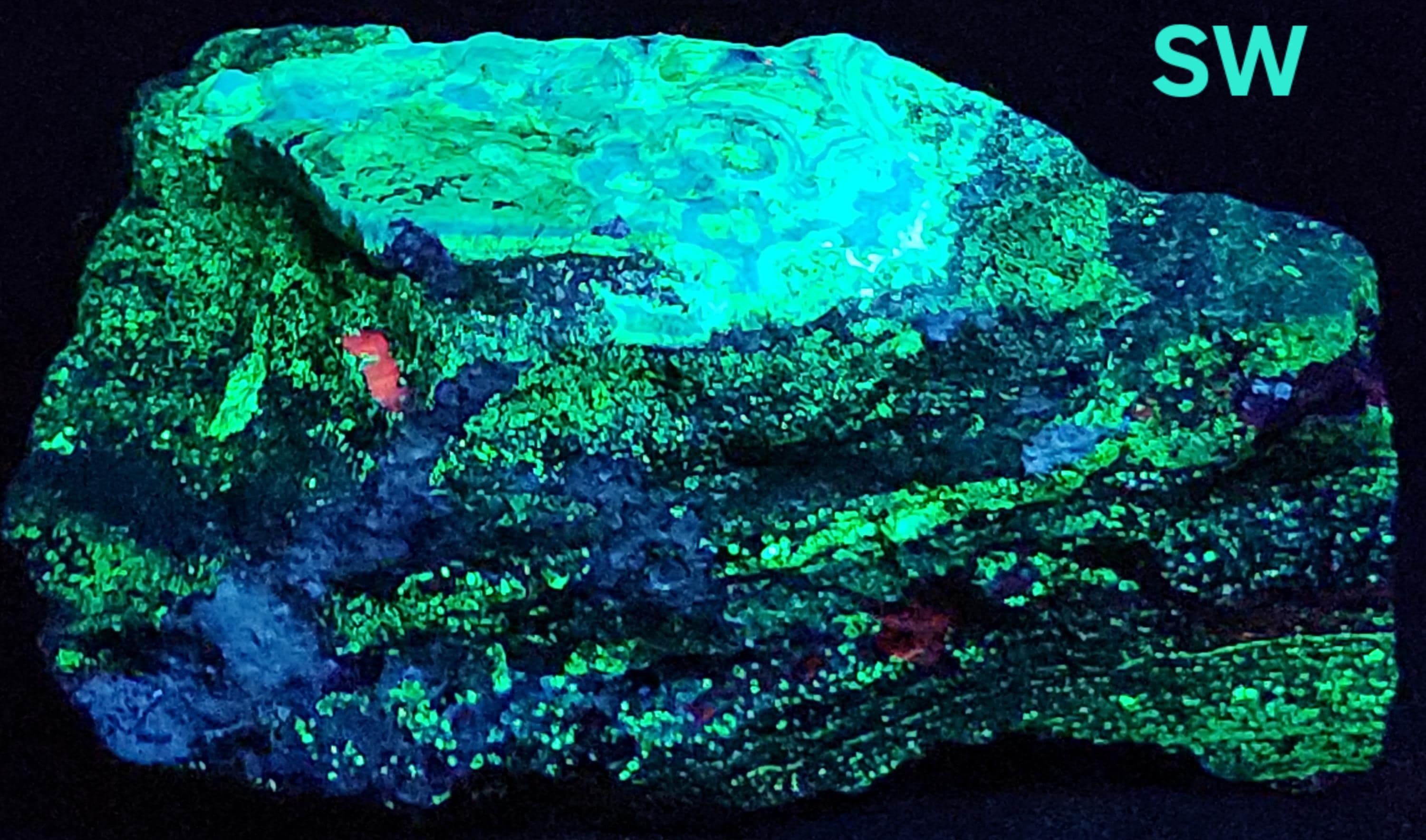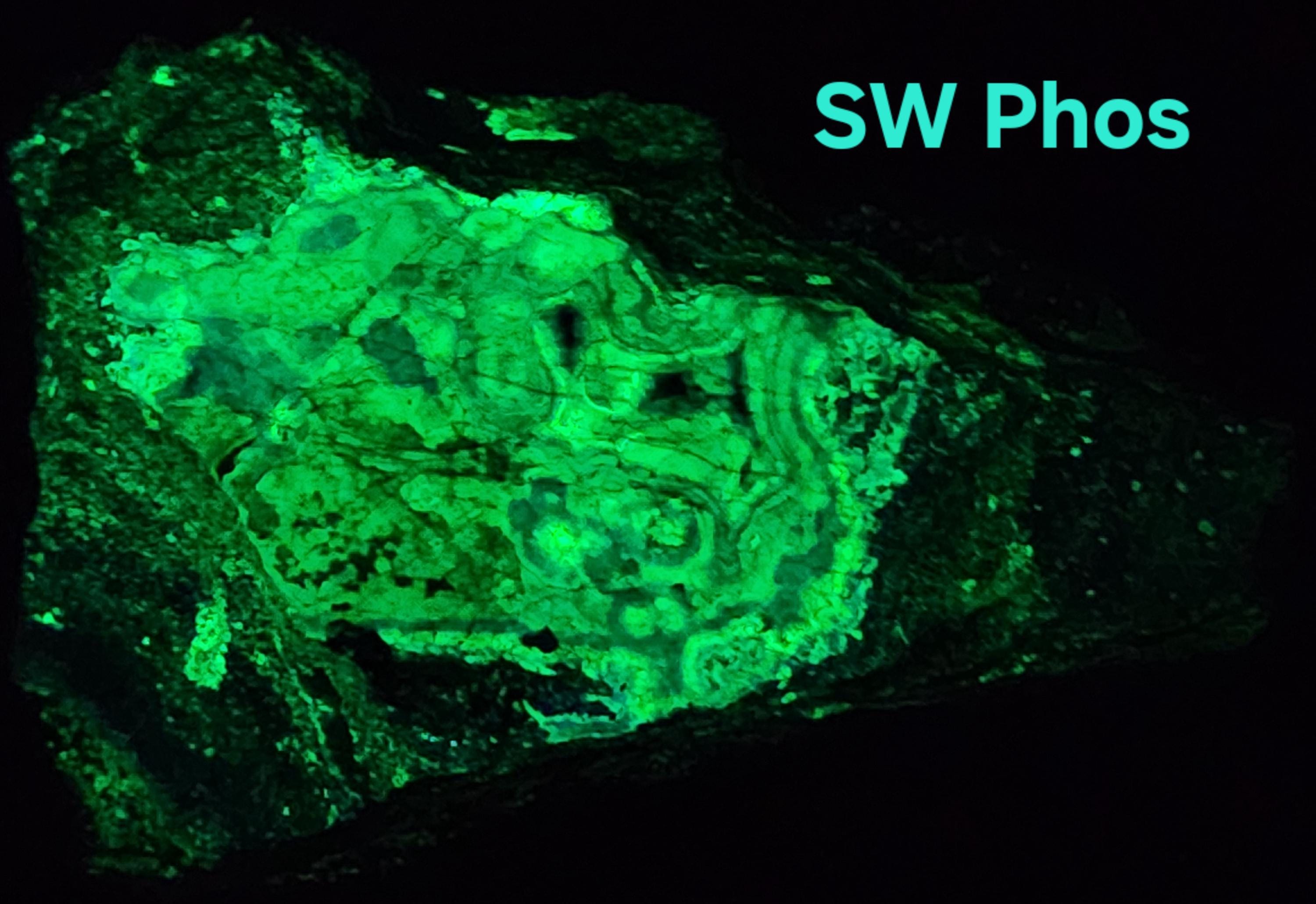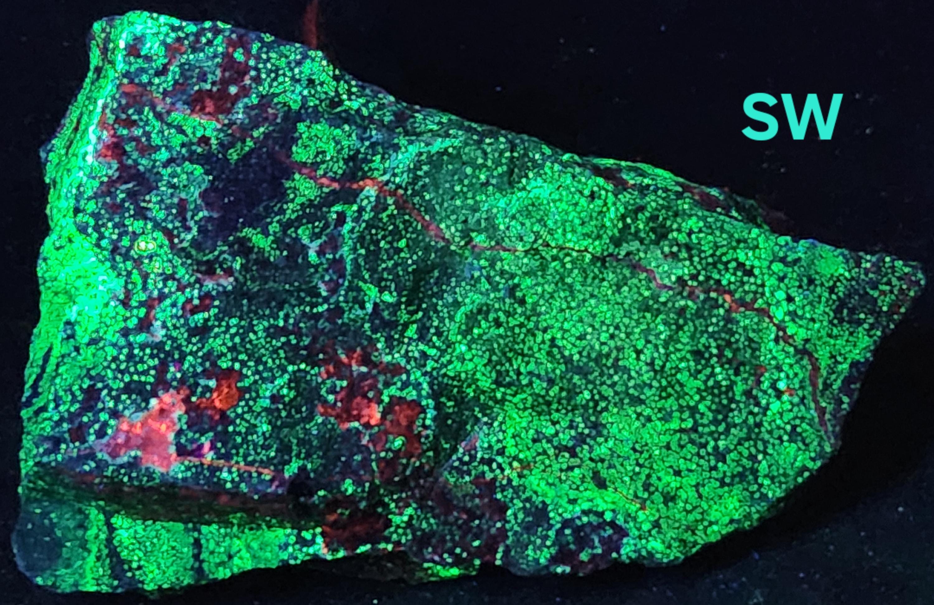 Fluorescent Willemite (Bright Green & Blue SW + SW Phosphorescent / Yellow, Green & White MW + MW Phosphorescent) & Calcite / Dolomite (Bright Red SW)