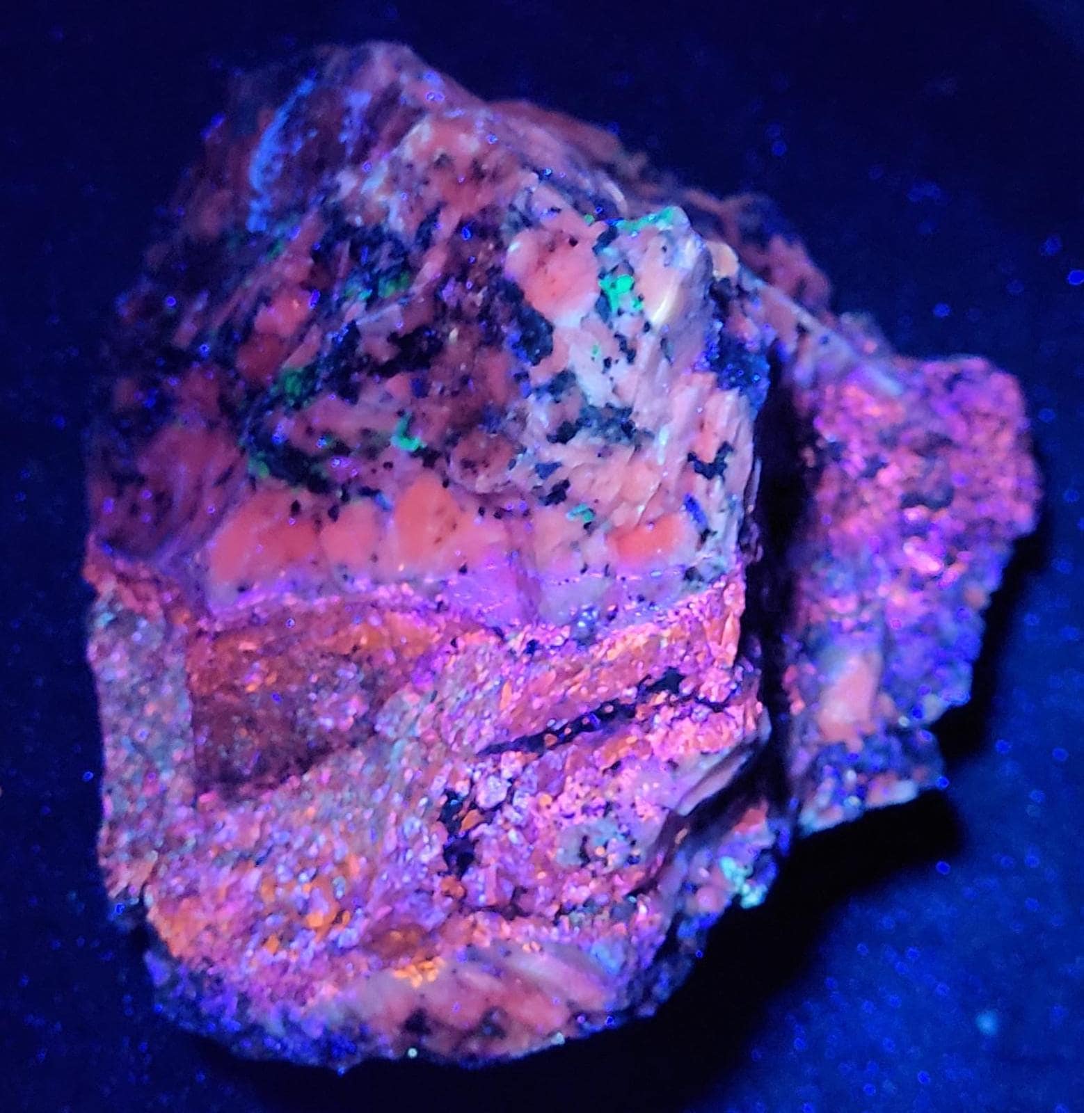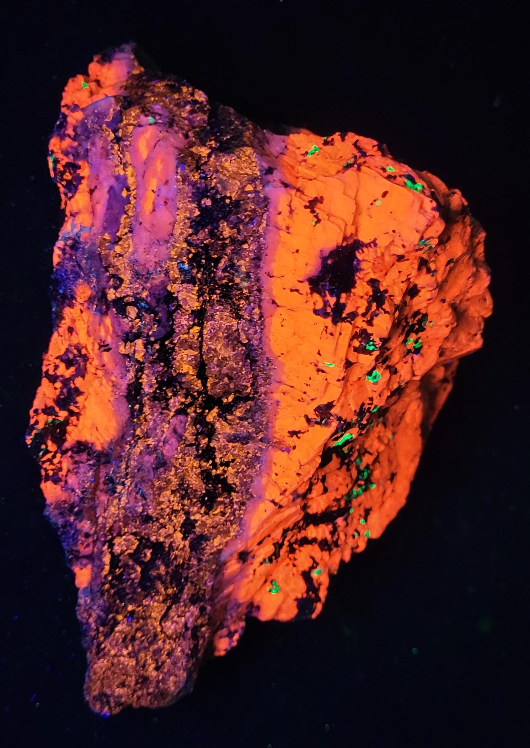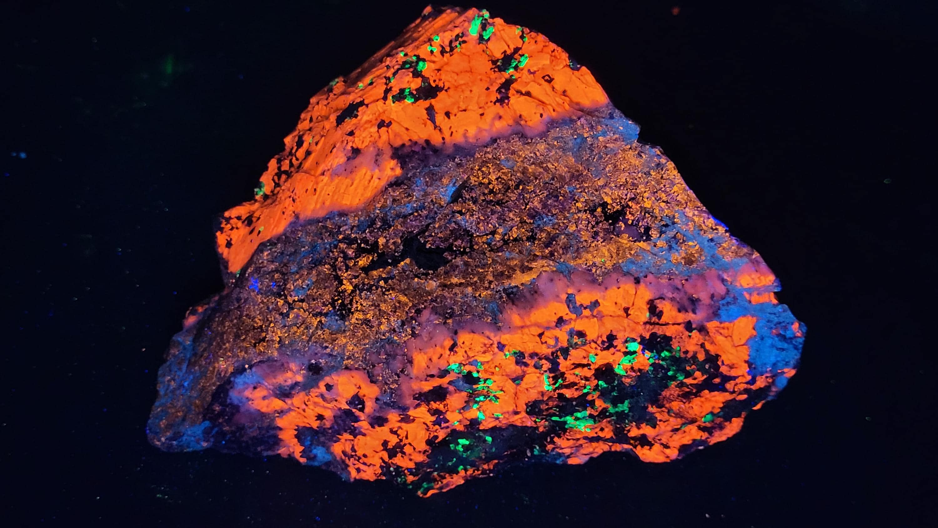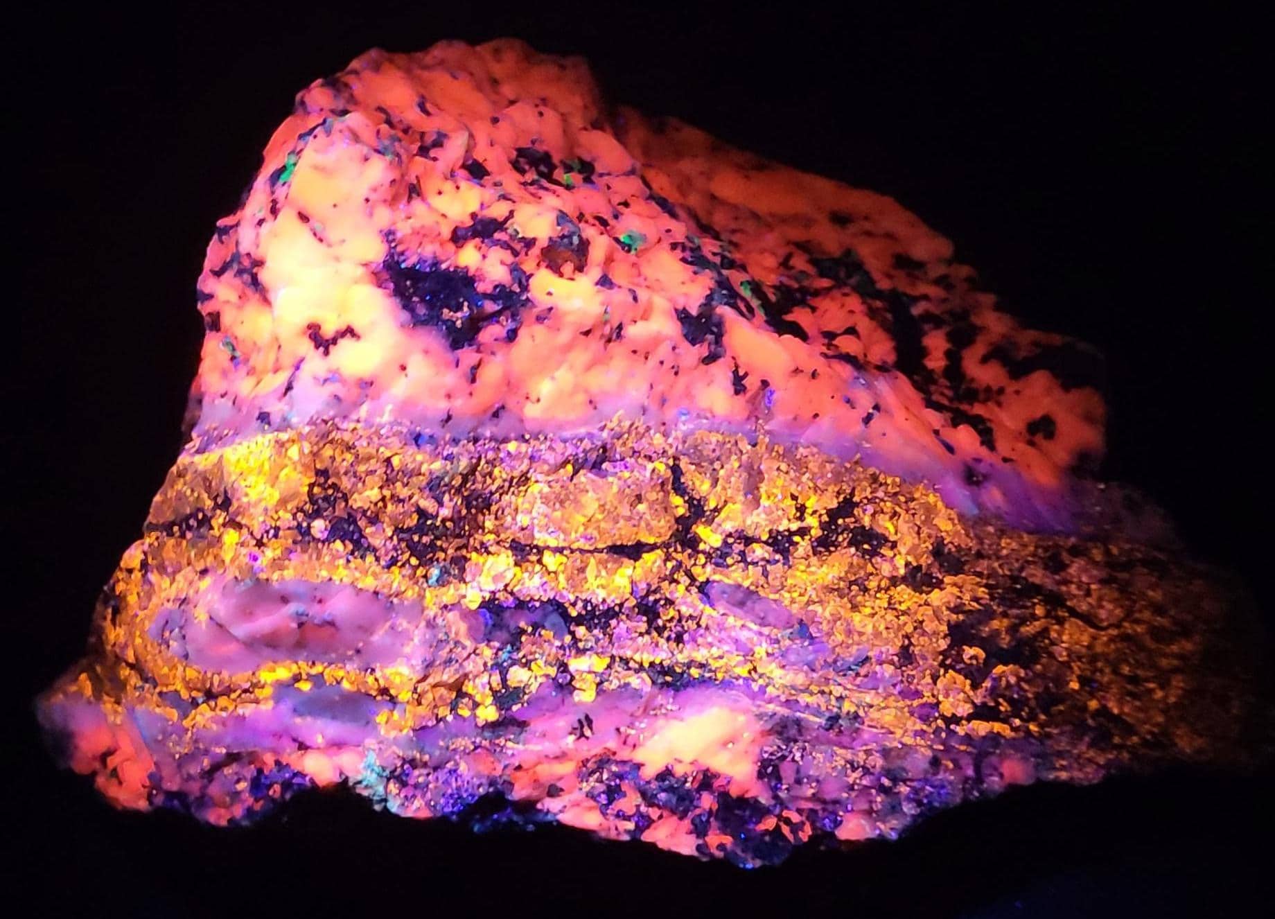 Fluorescent Calcite (Bright Red/Orange SW, Bright Red/Pink MW & Duller Red/Pink LW), Grey Sphalerite (Orange/Pink/Purple , Brightest MW & LW + LW Phosphorescent), Willemite (Bright Green SW & MW, Duller Green LW) & a bit of Hydrozincite (Blue/White, Best in SW)