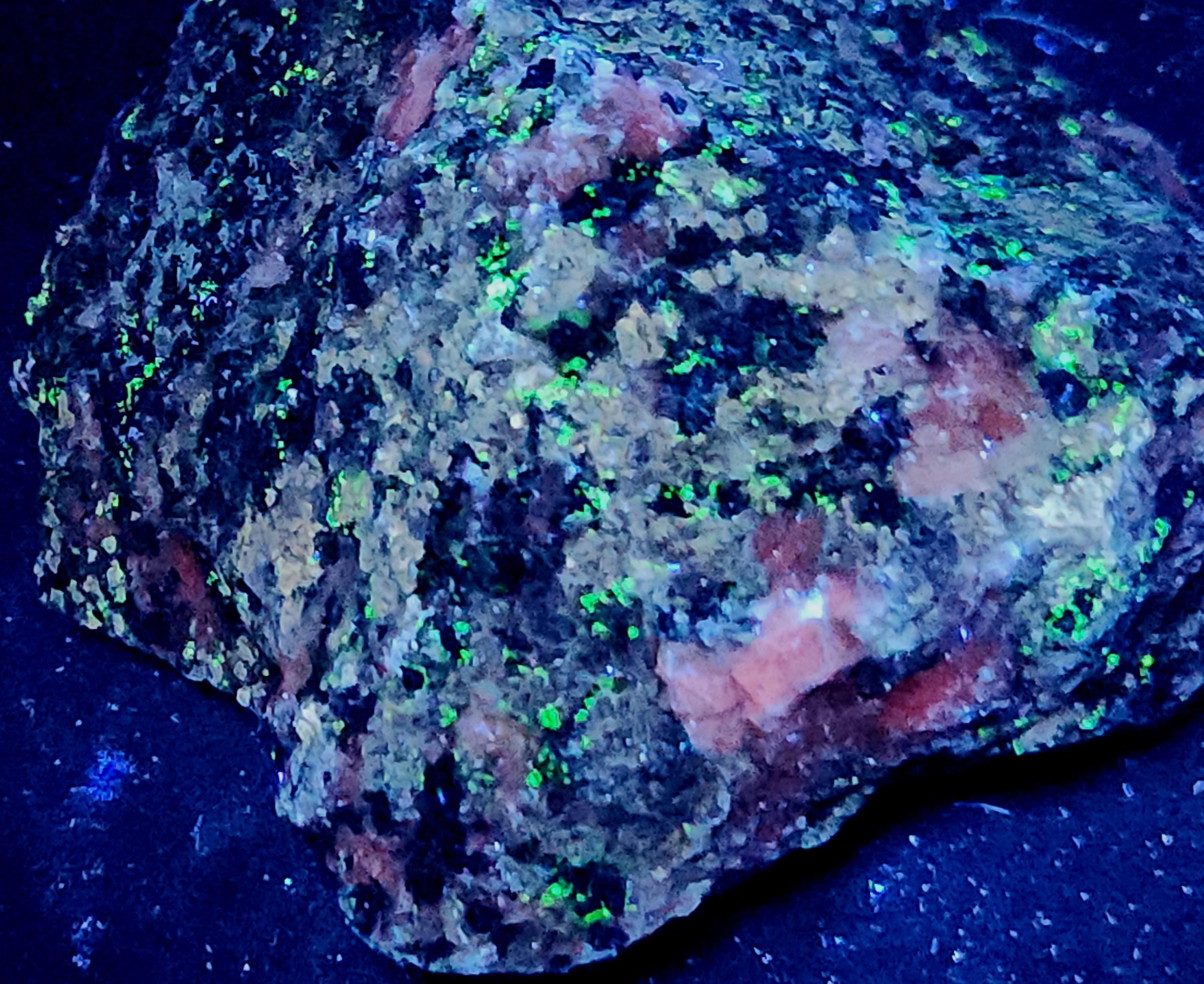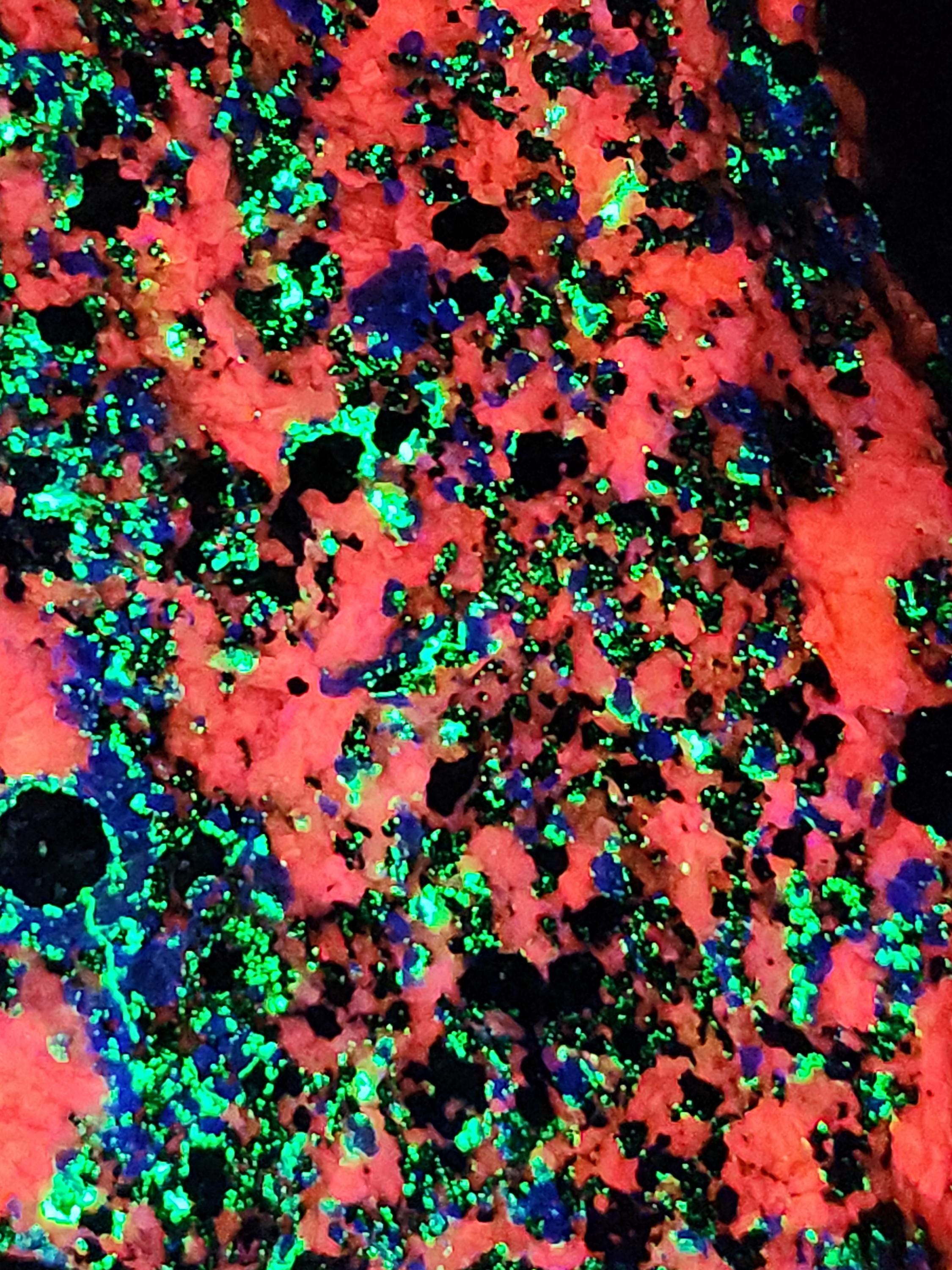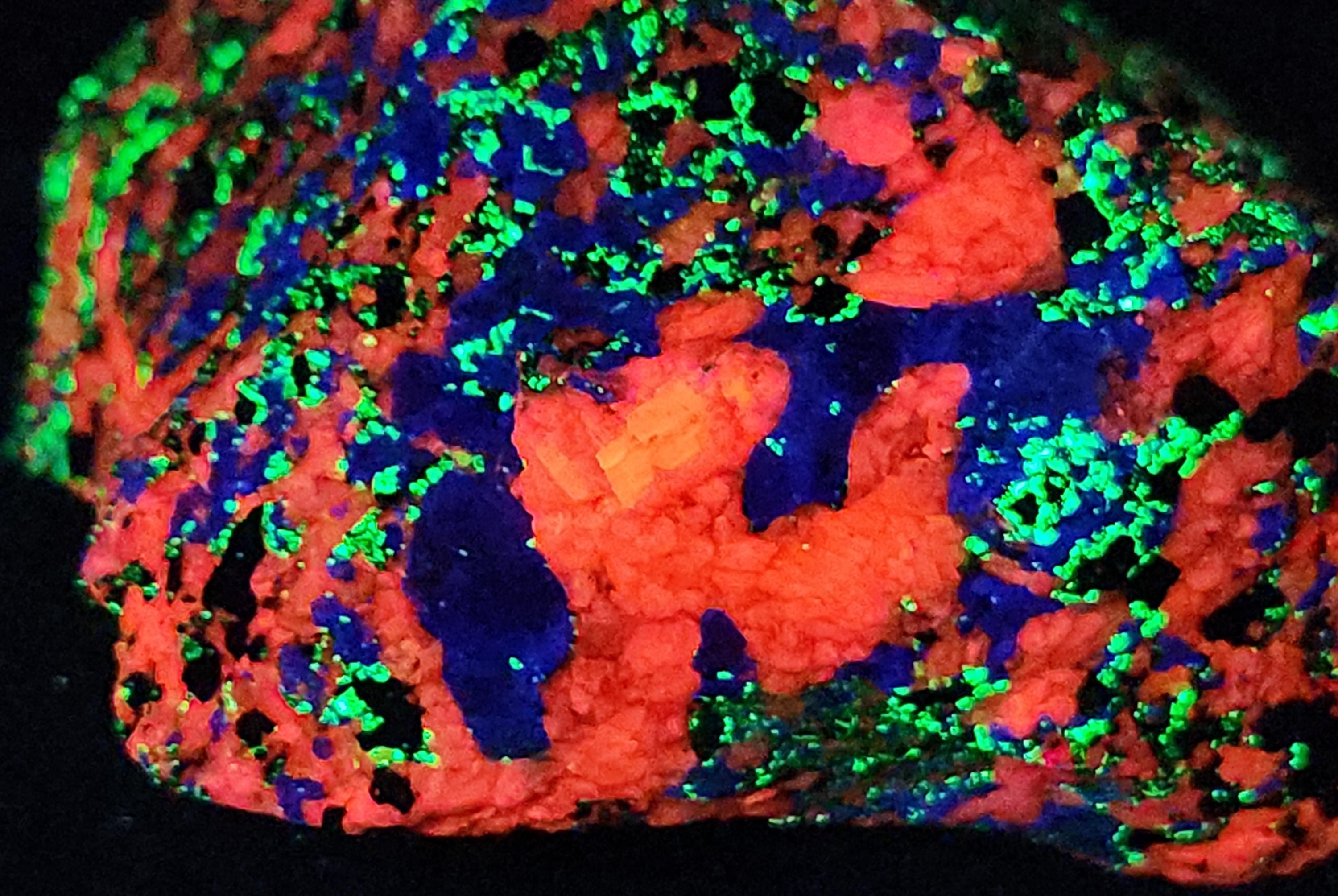 Fluorescent Hardystonite (Blue / Violet SW & Unusual Yellow/Cream LW), Willemite (Bright Green SW & LW) & Calcite (Bright Red/Orange SW & Duller Pink/Red LW)
