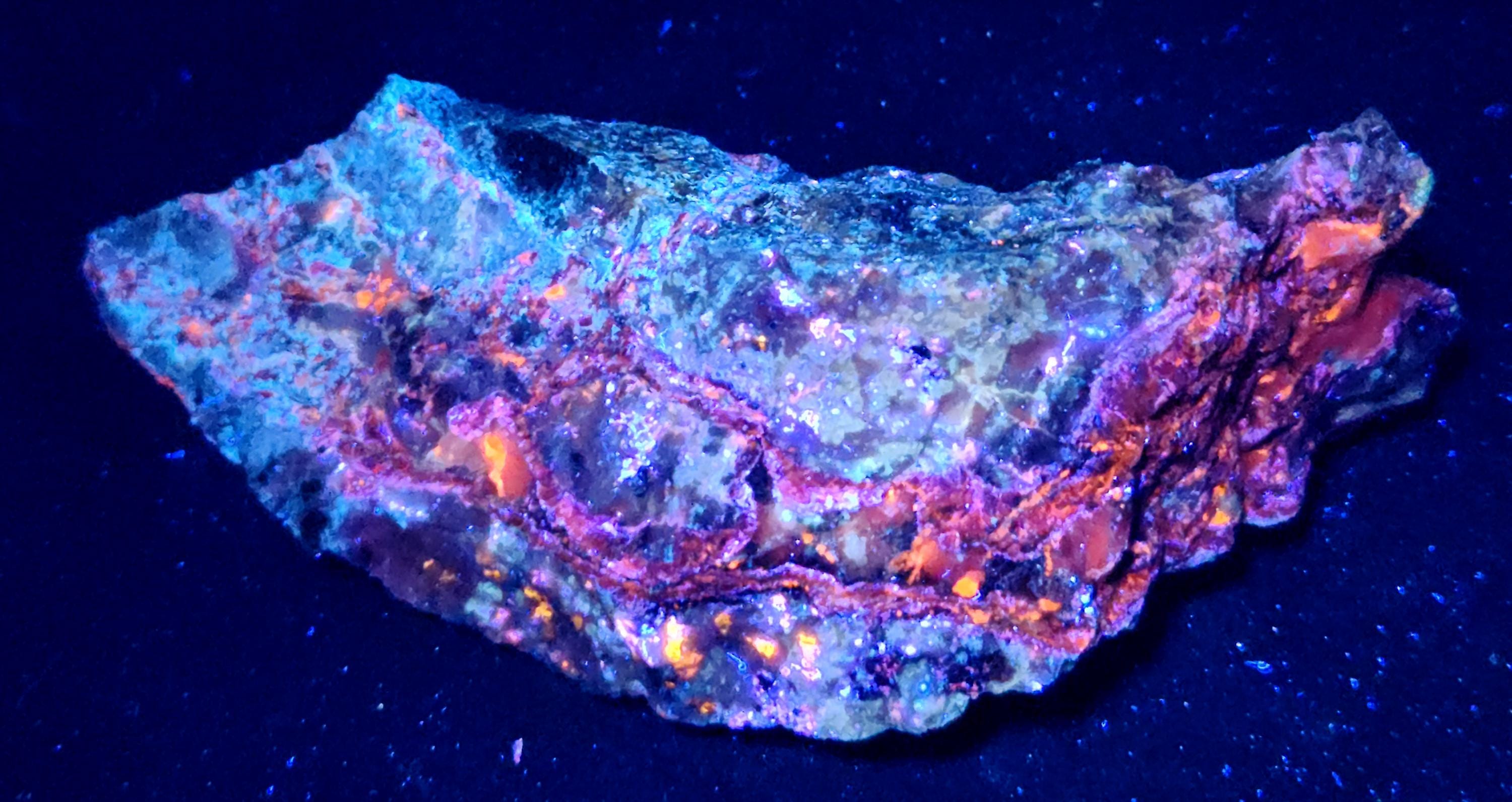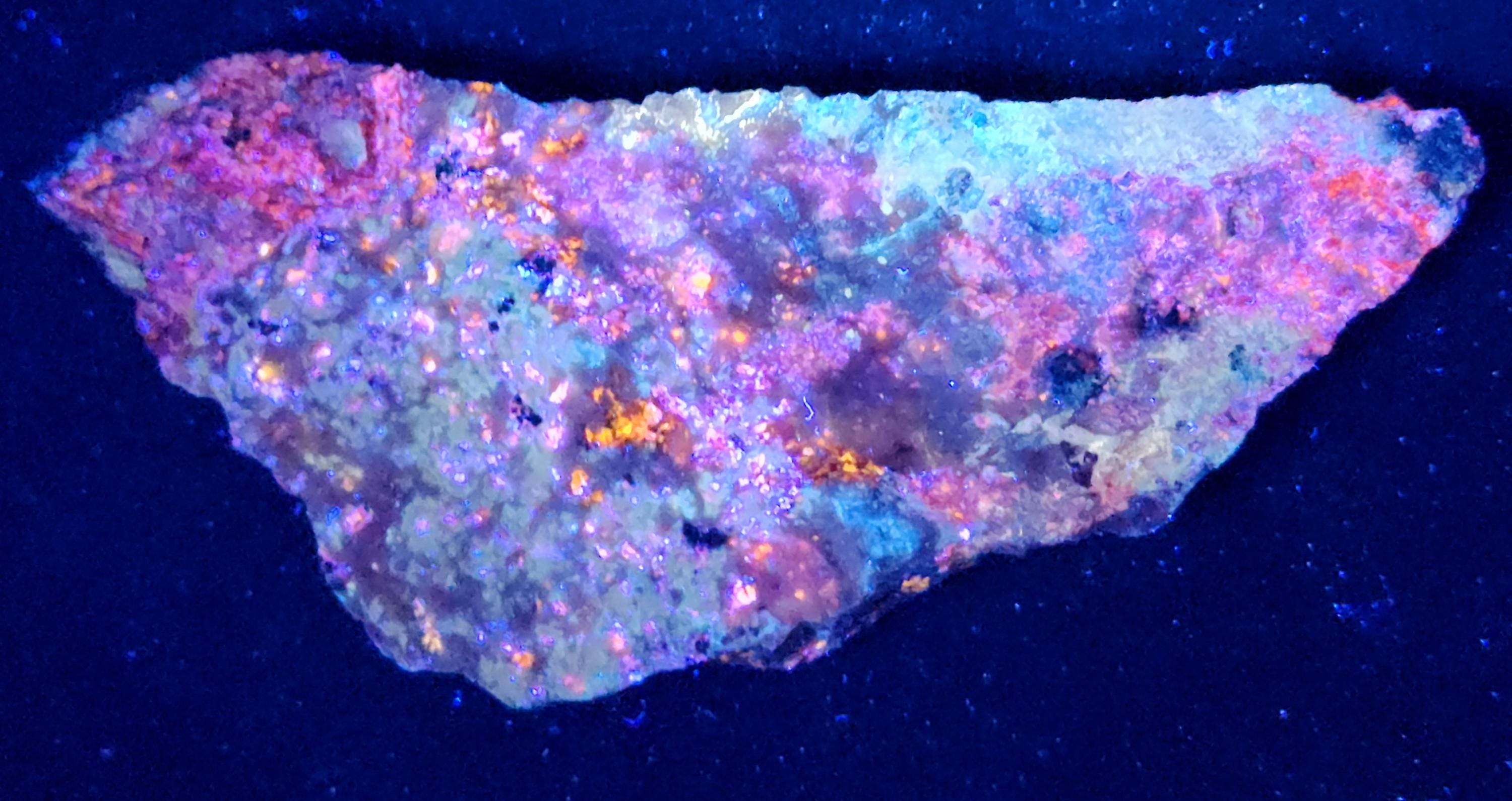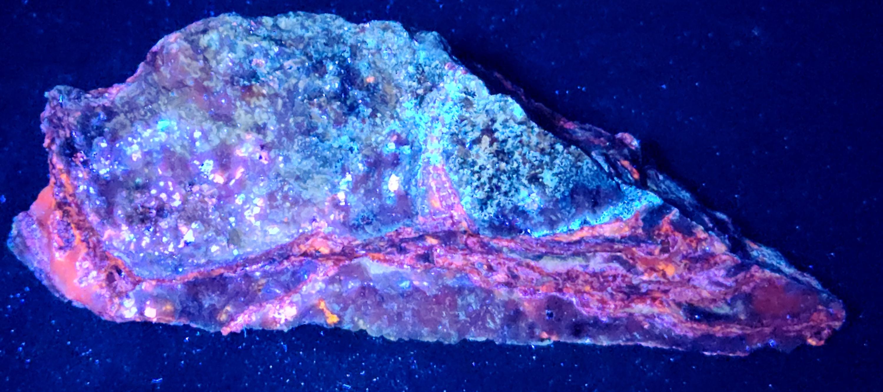 Fluorescent Hydrozincite (Bright Blue-White SW/MW/LW), Sphalerite (Orange/Red SW, Bright Orange/Red/Pink MW & Bright Orange/Pink/Purple/Blue LW + LW Phosphorescent Too!!!) & Calcite (Bright Red/Orange SW, Bright Pink/Purple MW & Dull Pink/Purple LW)