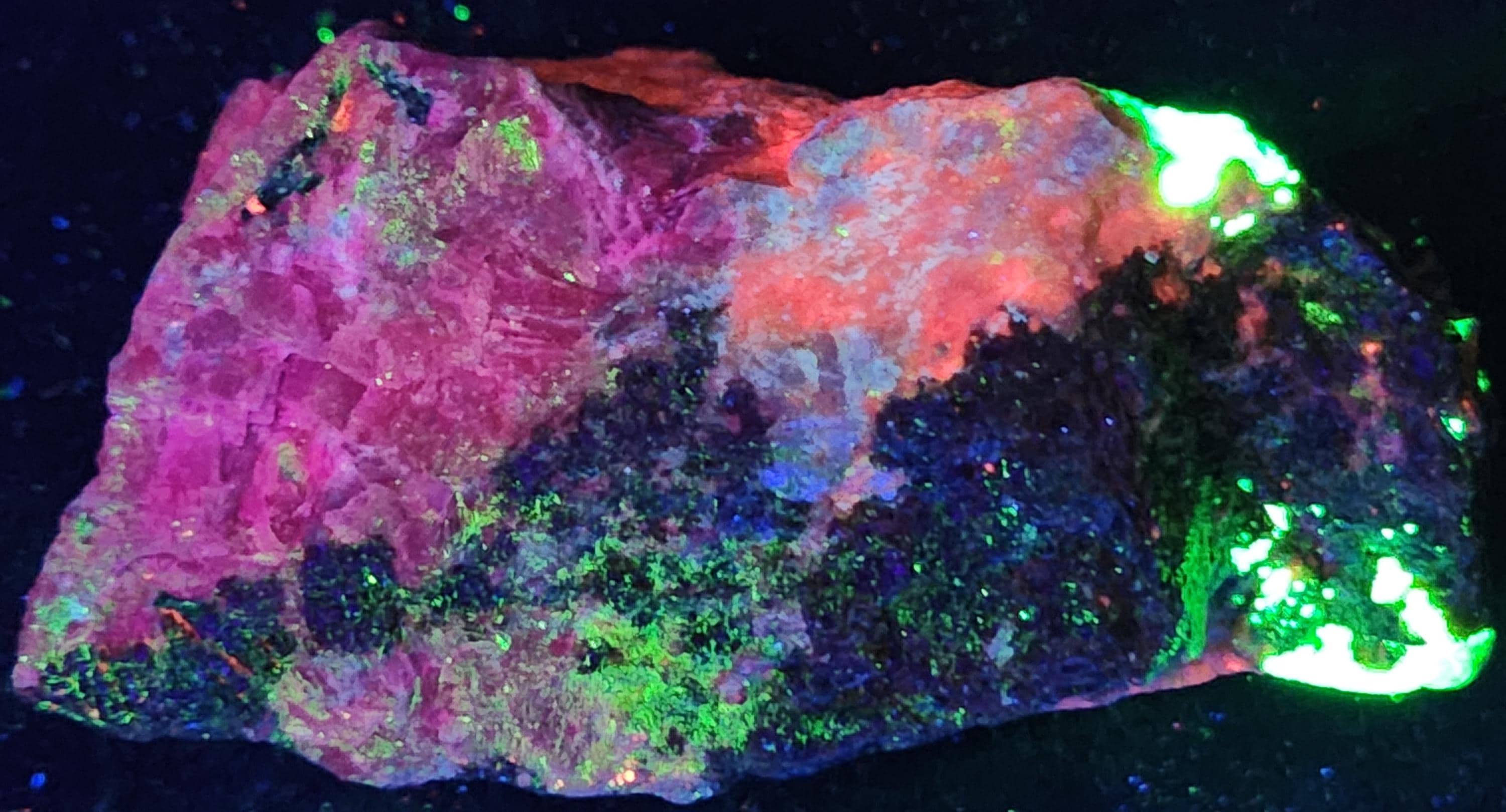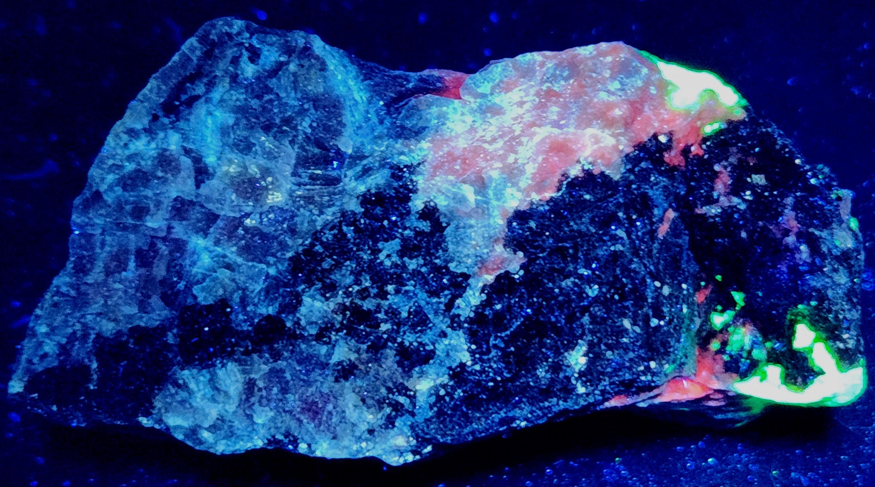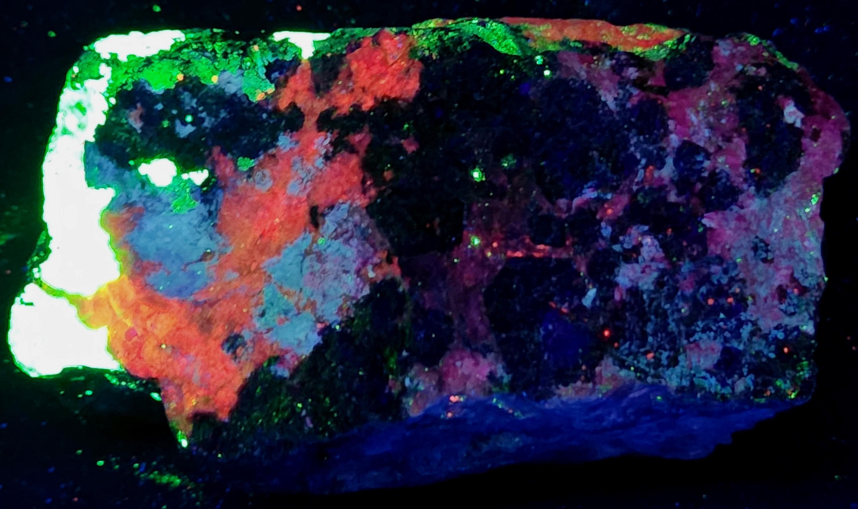 Fluorescent Axinite-Mn / Manganaxinite (Bright Cherry Red SW & LW), Willemite (Bright Green SW & LW), Xonotlite (Bright Blue-White SW & LW) & Feldspar (Dull Magenta SW)