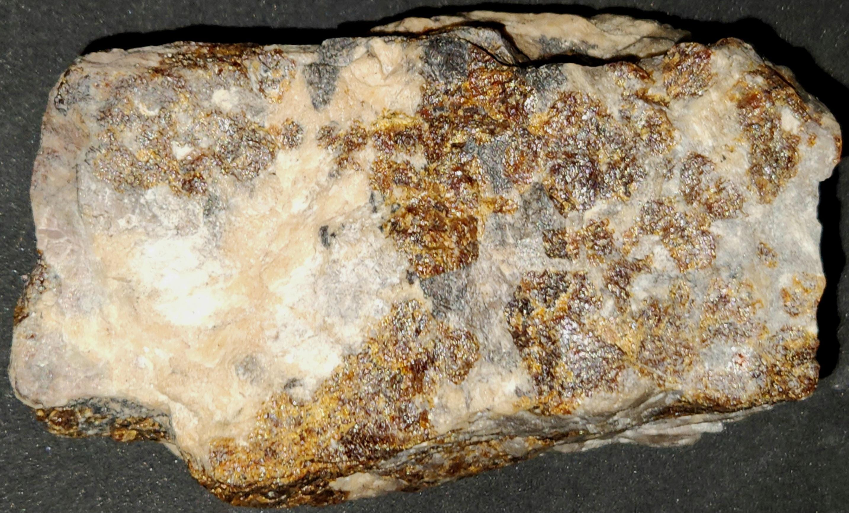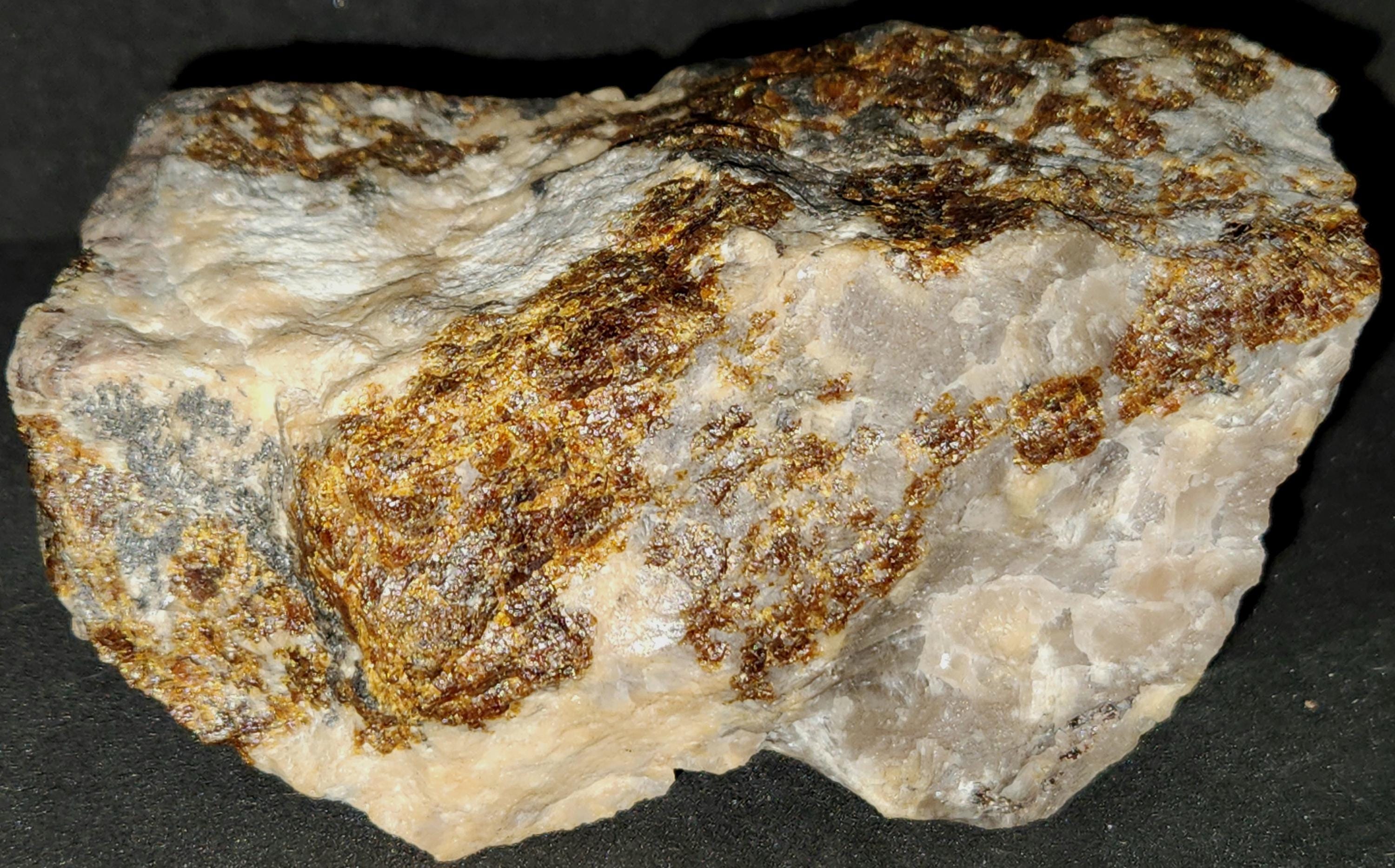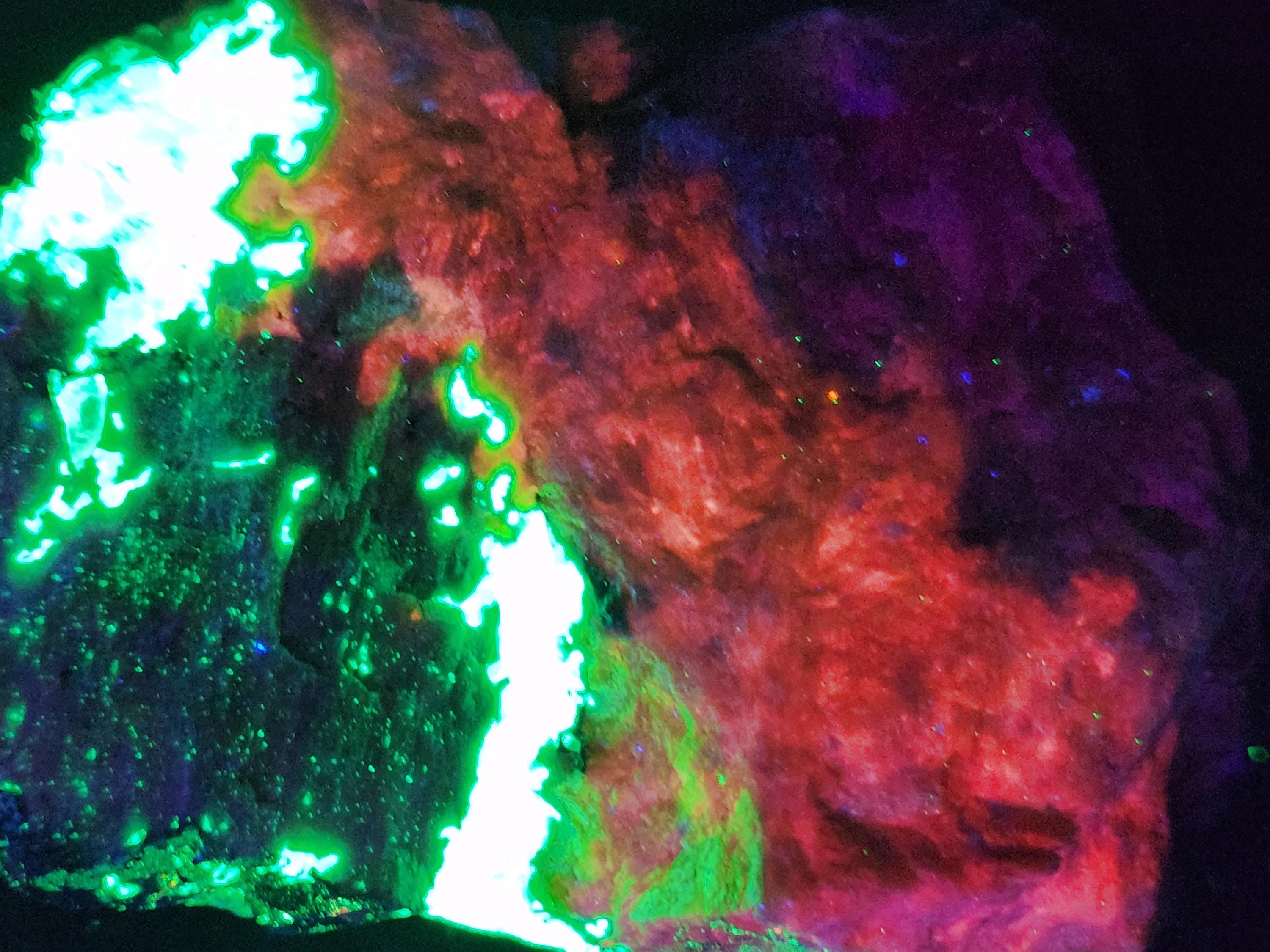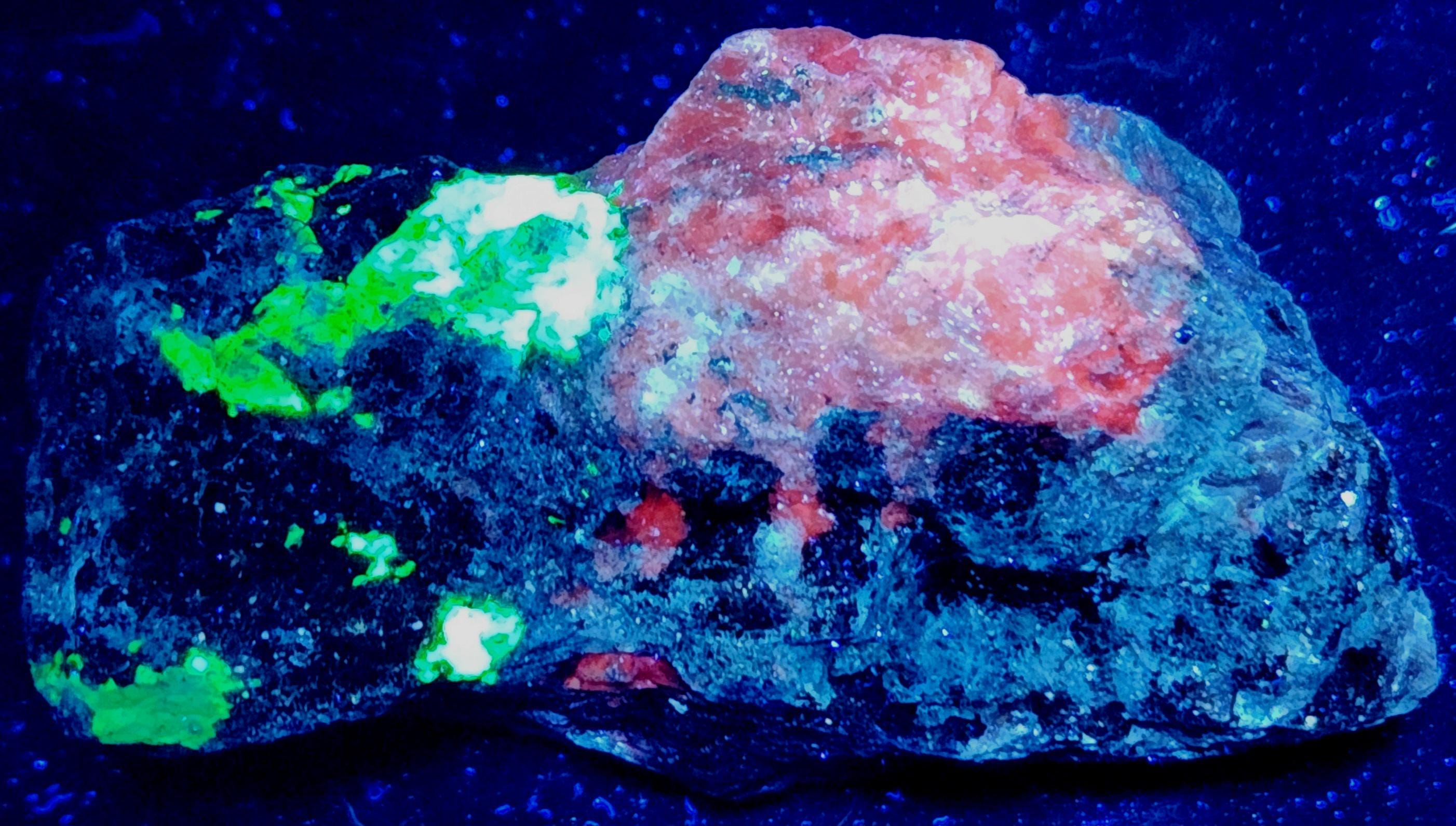 Fluorescent Axinite-Mn / Manganaxinite (Bright Cherry Red SW & LW), Willemite (Bright Green SW & LW), Xonotlite (Bright Blue-White SW & LW) & Feldspar (Dull Magenta SW)