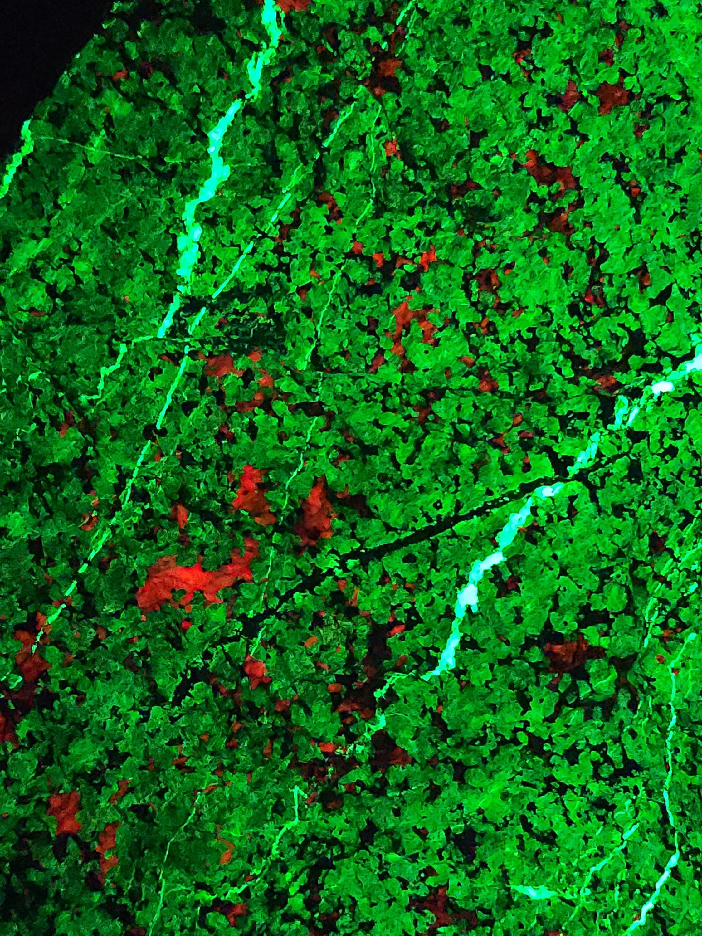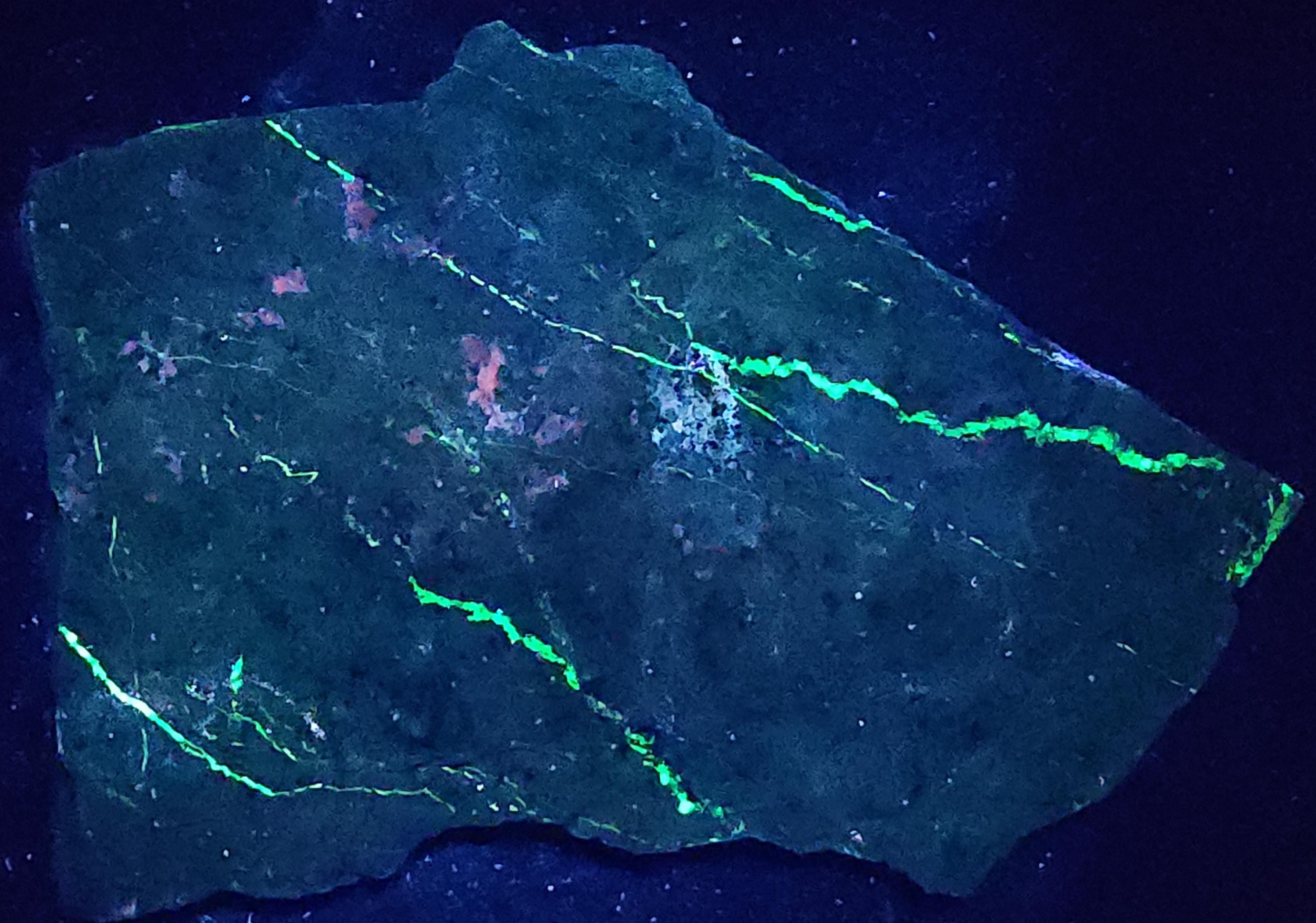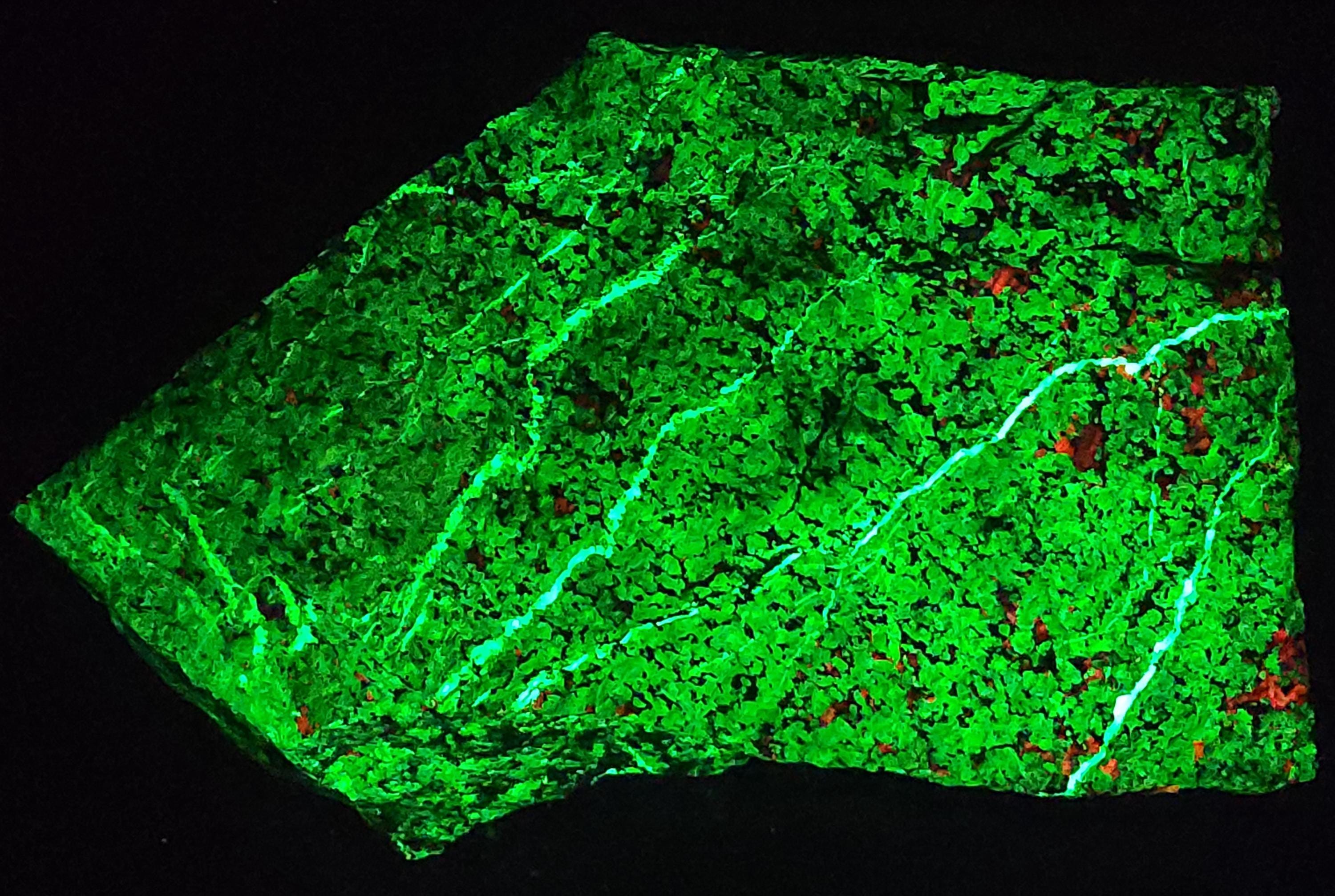 Fluorescent White Willemite Veins (Bright Green SW, MW & LW + Very SW Phosphorescent Too!!!) in Red Willemite (Green SW + MW & Very Dull Green LW) with Calcite (Bright Red/Orange SW & Duller Pink/Red MW, LW)