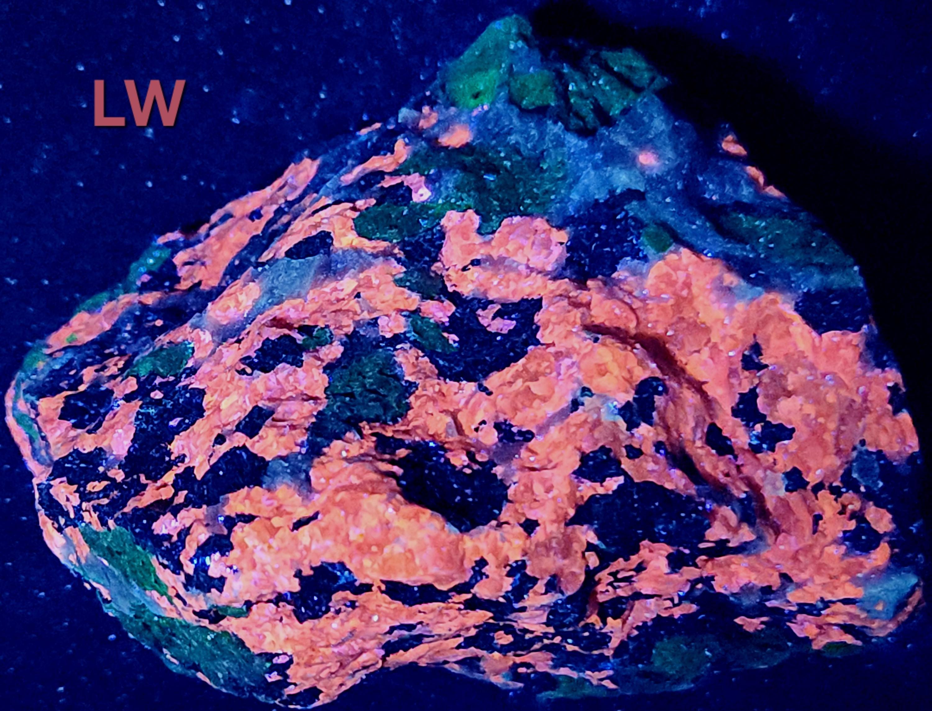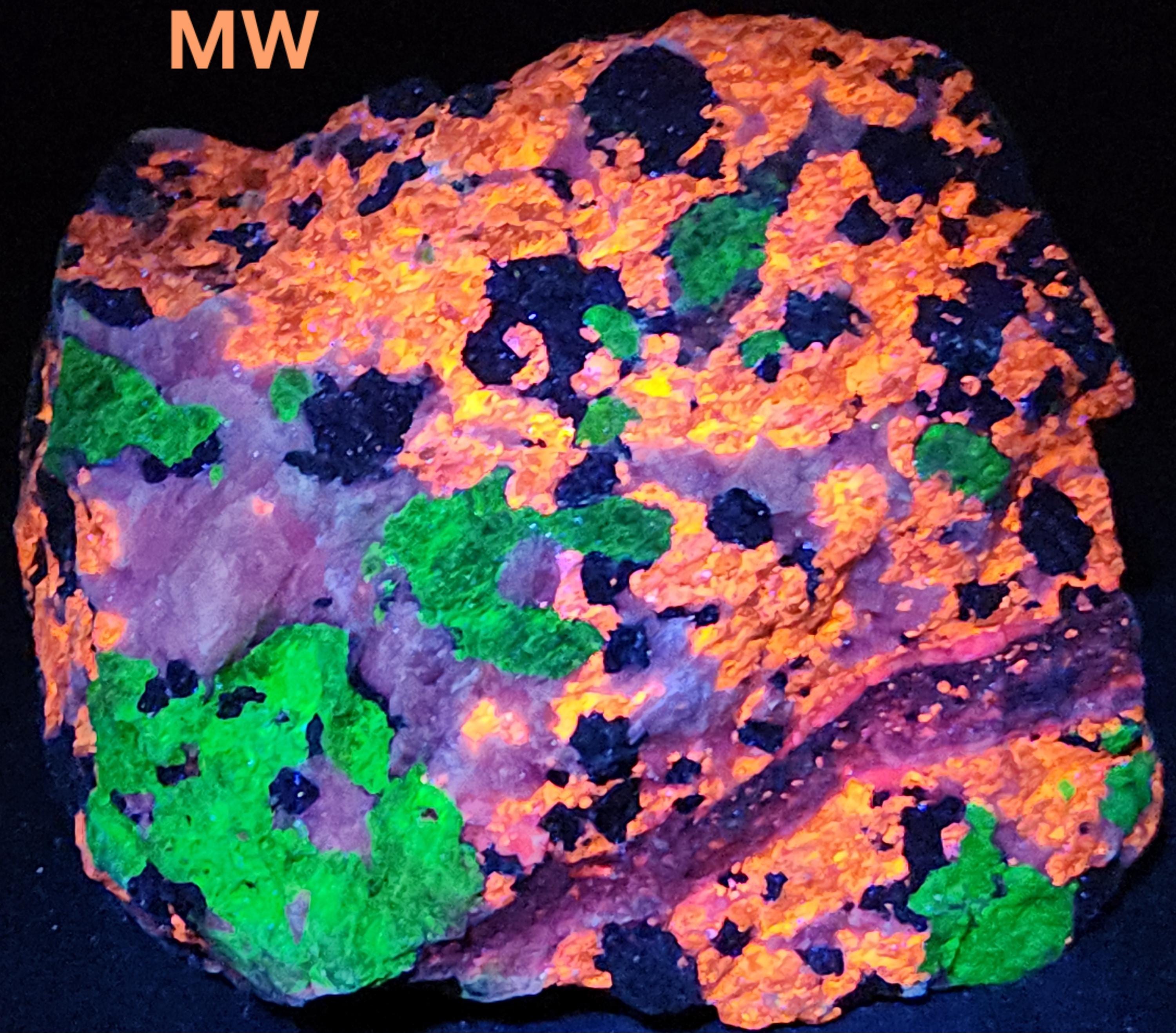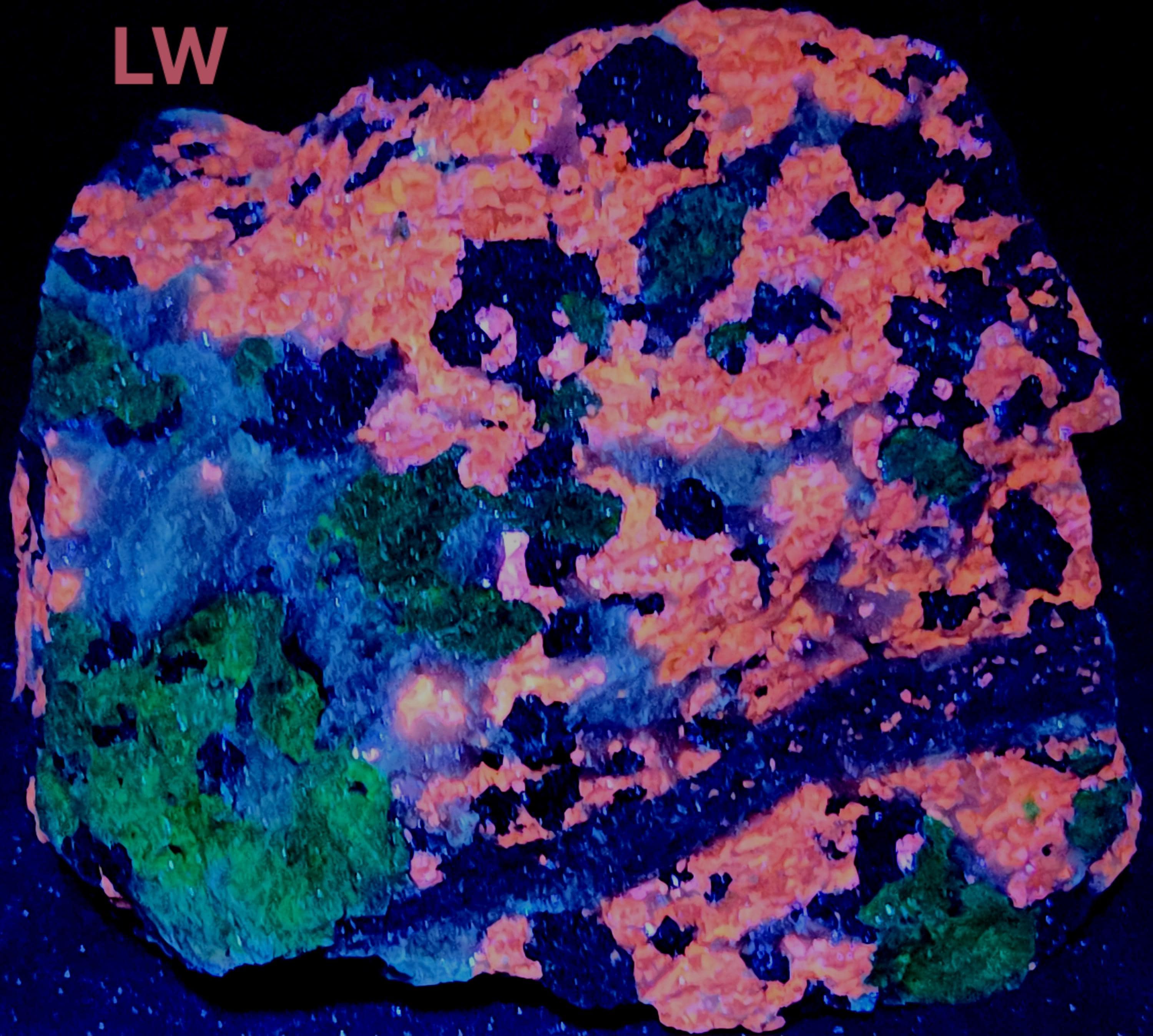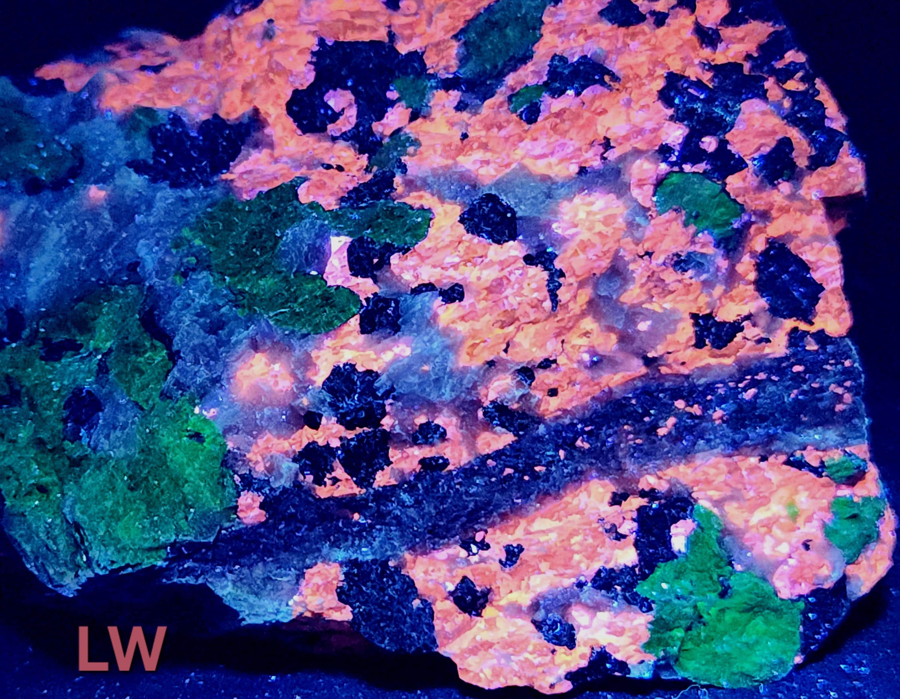 Fluorescent Crystalline Sphalerite (Dull Orange/Red SW, Very Bright Pink/Blue/Orange MW & Very Bright Pink/Orange LW + LW Phosphorescent Too!), Willemite (Bright Green SW & Duller Green LW) & Calcite (Dull Pink/Red SW & MW)