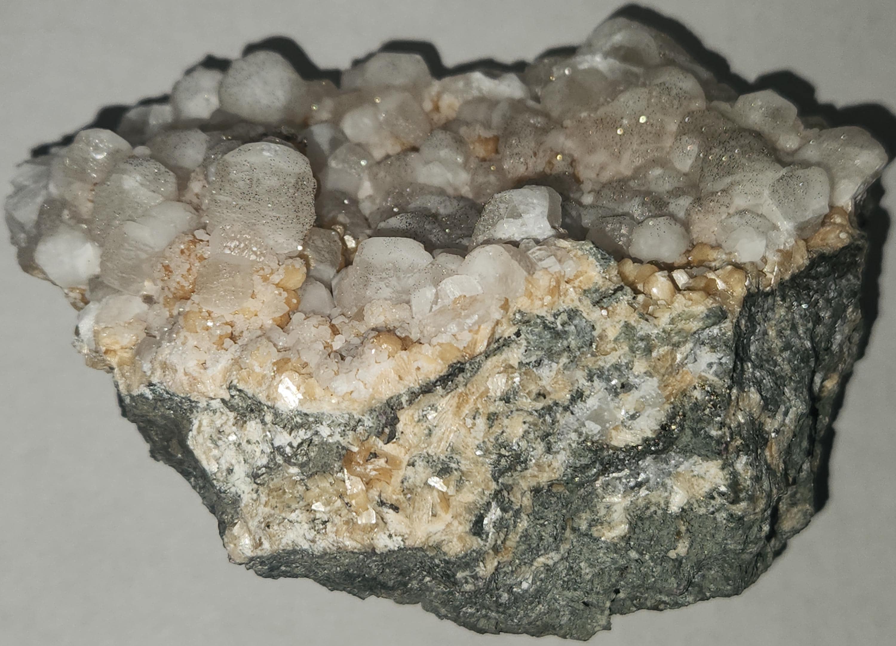 A really nice piece with Calcite, sparkly micro Pyrite & Orange Stilbite on Hornfels from the Moore's Station Quarry in New Jersey, USA.