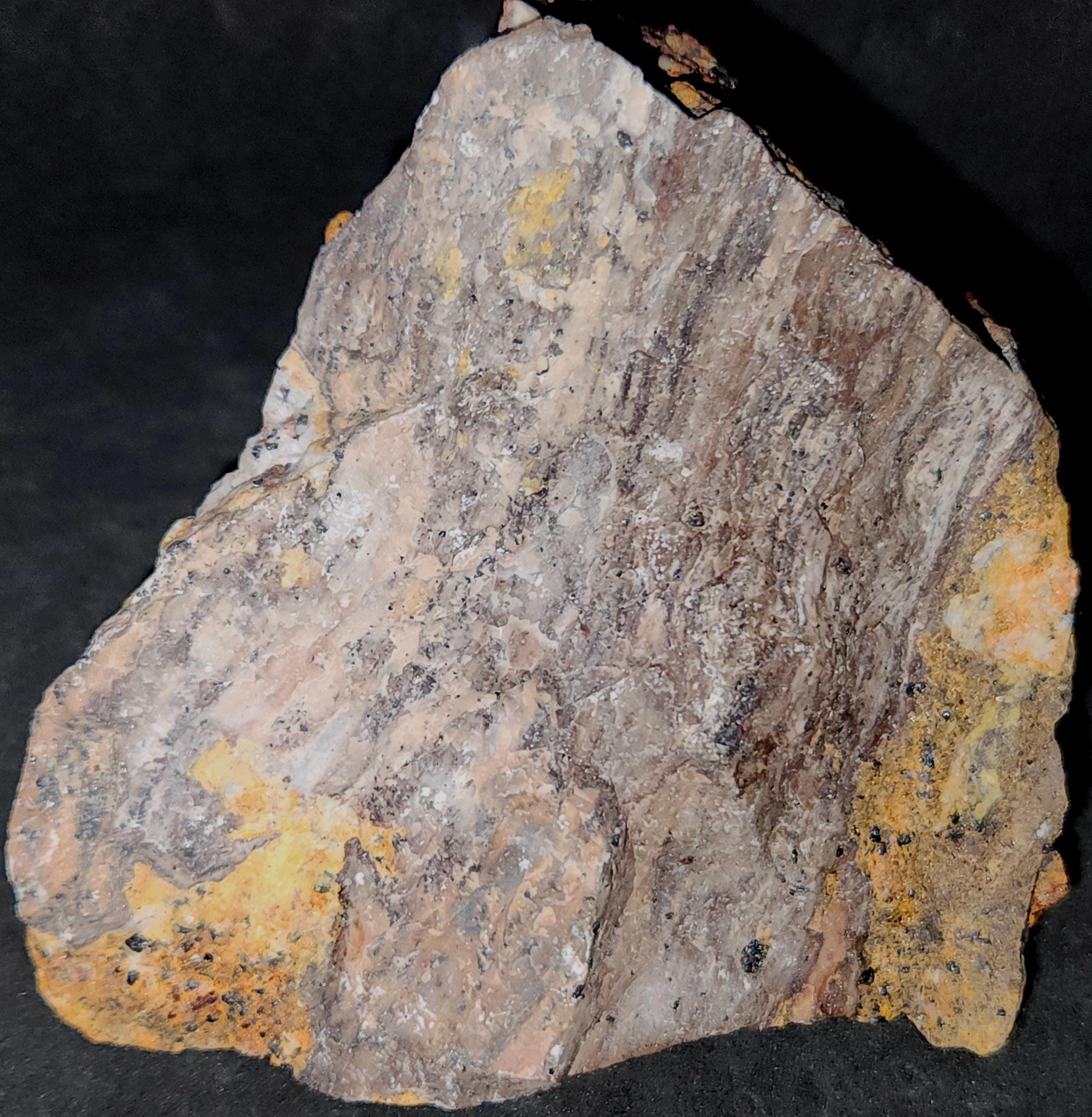Fluorescent Willemite (Bright Green SW & some also LW), Calcite (Bright Red/Orange SW & Duller Pink/Red LW) Sphalerite (Blue/Purple LW) & Secondary Zincite (Bright Yellow LW)