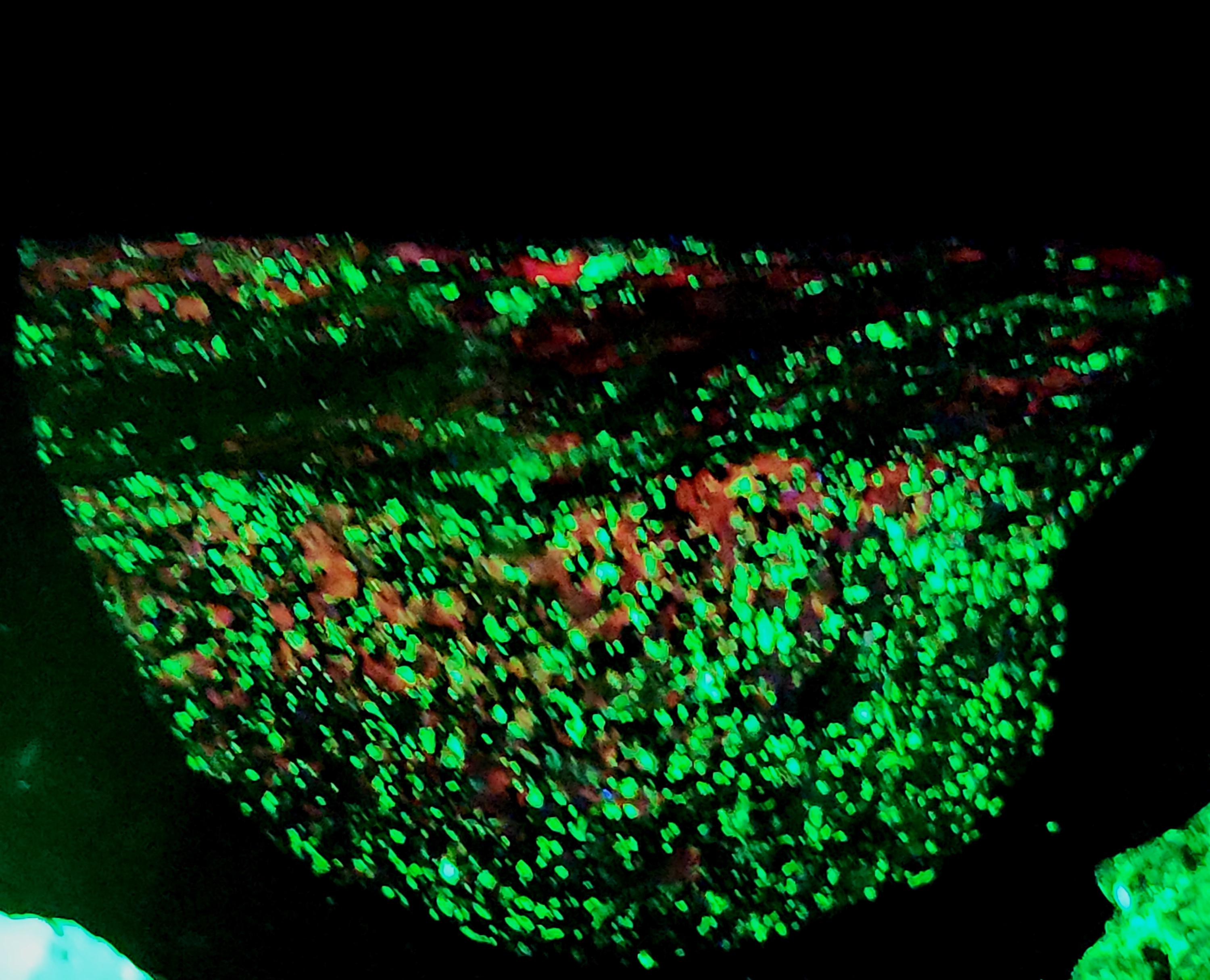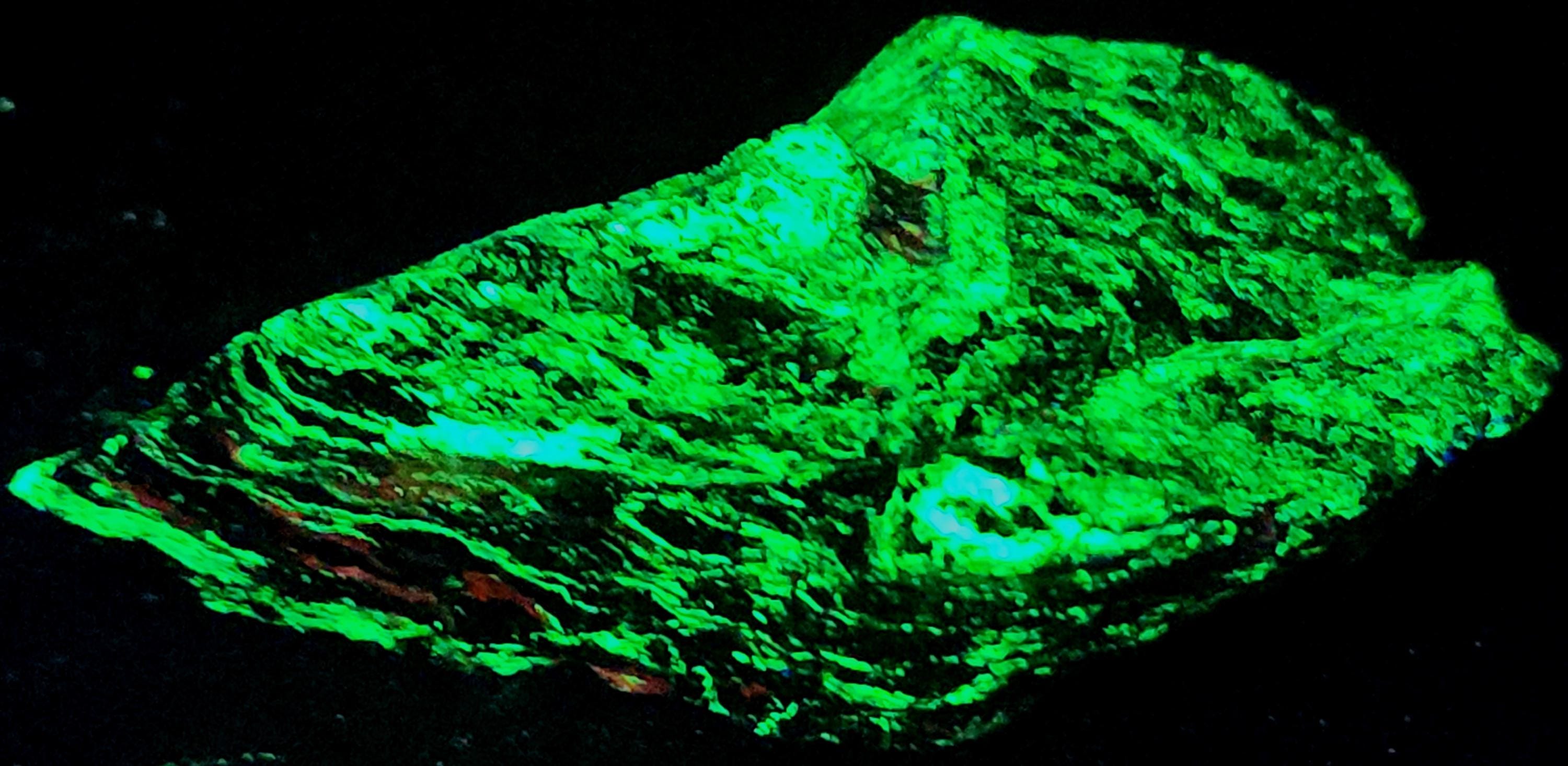 Fluorescent Willemite (Bright Green SW & some also LW), Calcite (Bright Red/Orange SW & Duller Pink/Red LW)