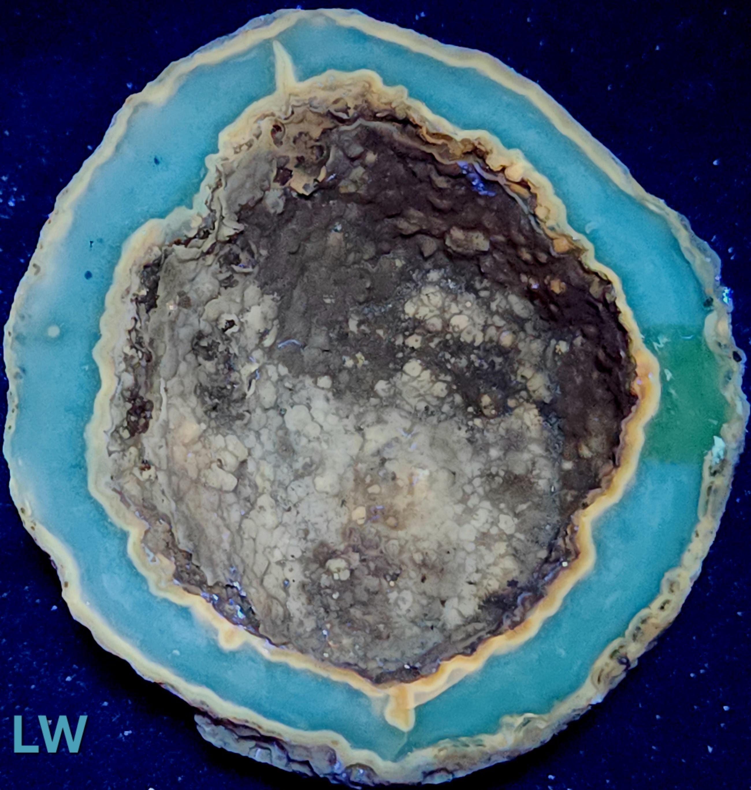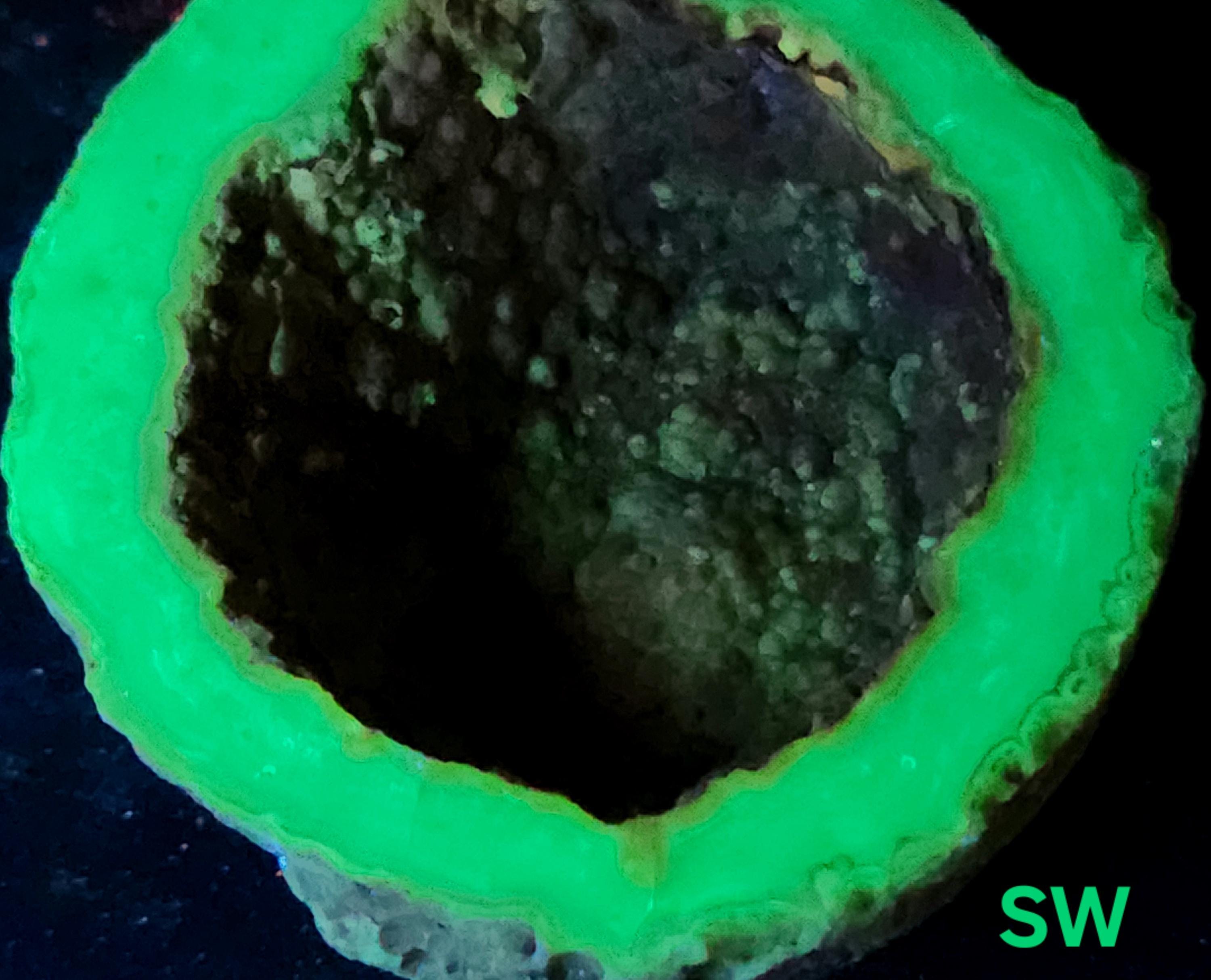 Gorgeous Shortwave/Midwave/Longwave UV Fluorescent Cut & Polished Half of an Agate Geode with Druzy Quartz Crystals!