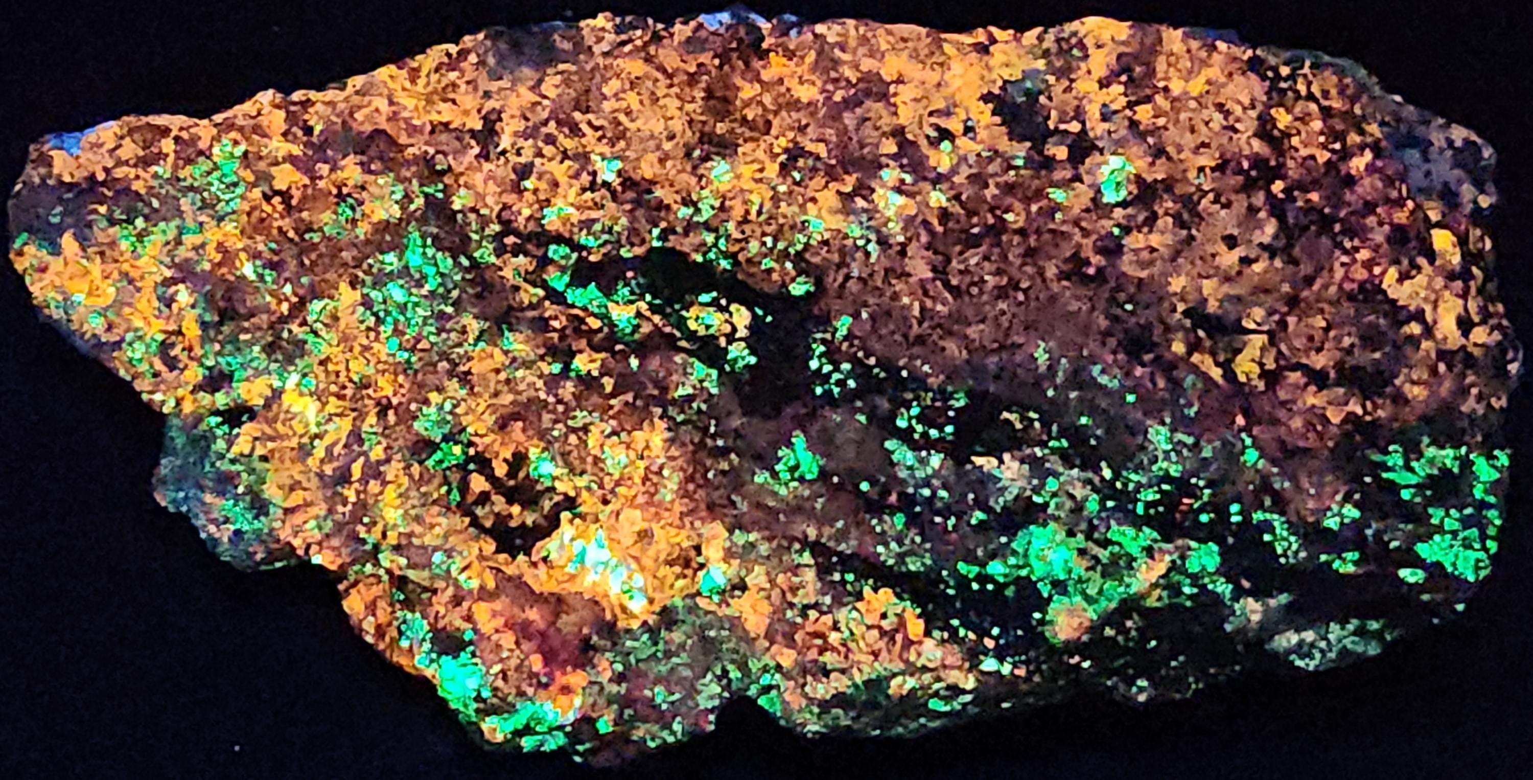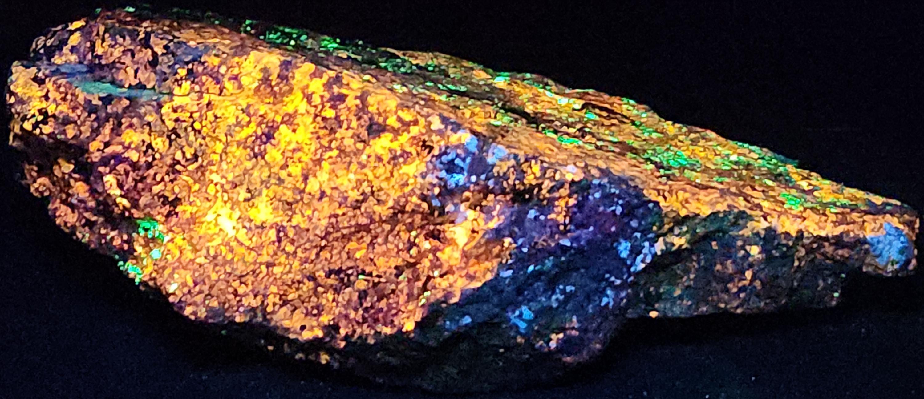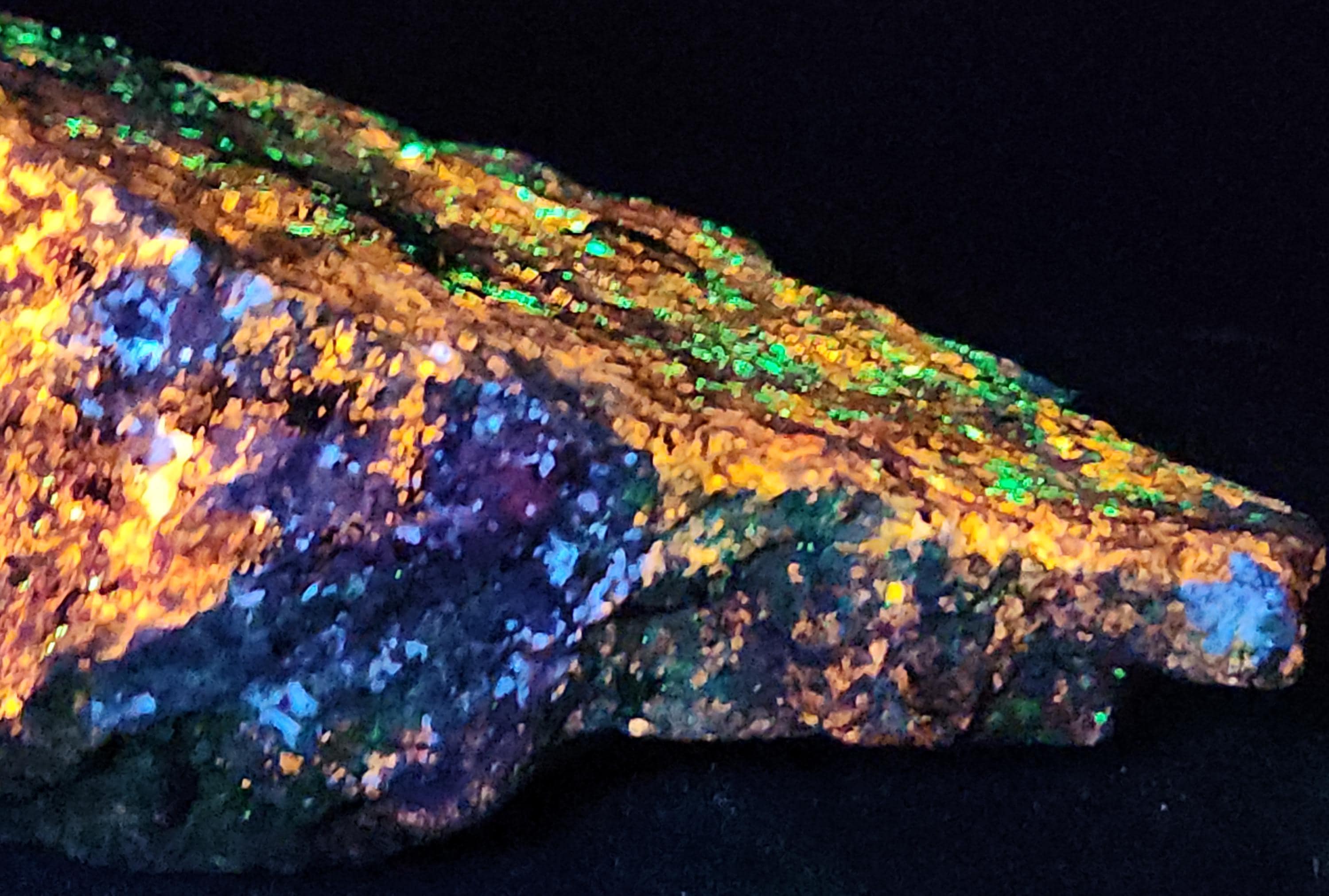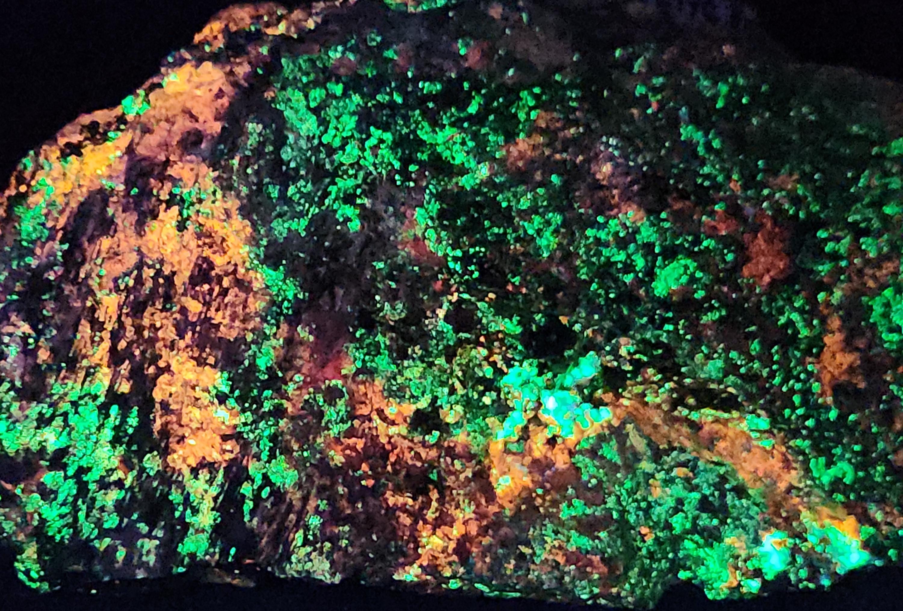 Fluorescent Very Rare Fibrous Wollastonite (Bright Orange SW), Margarosanite (Bright Blue SW) & Willemite (Bright Green SW & LW)