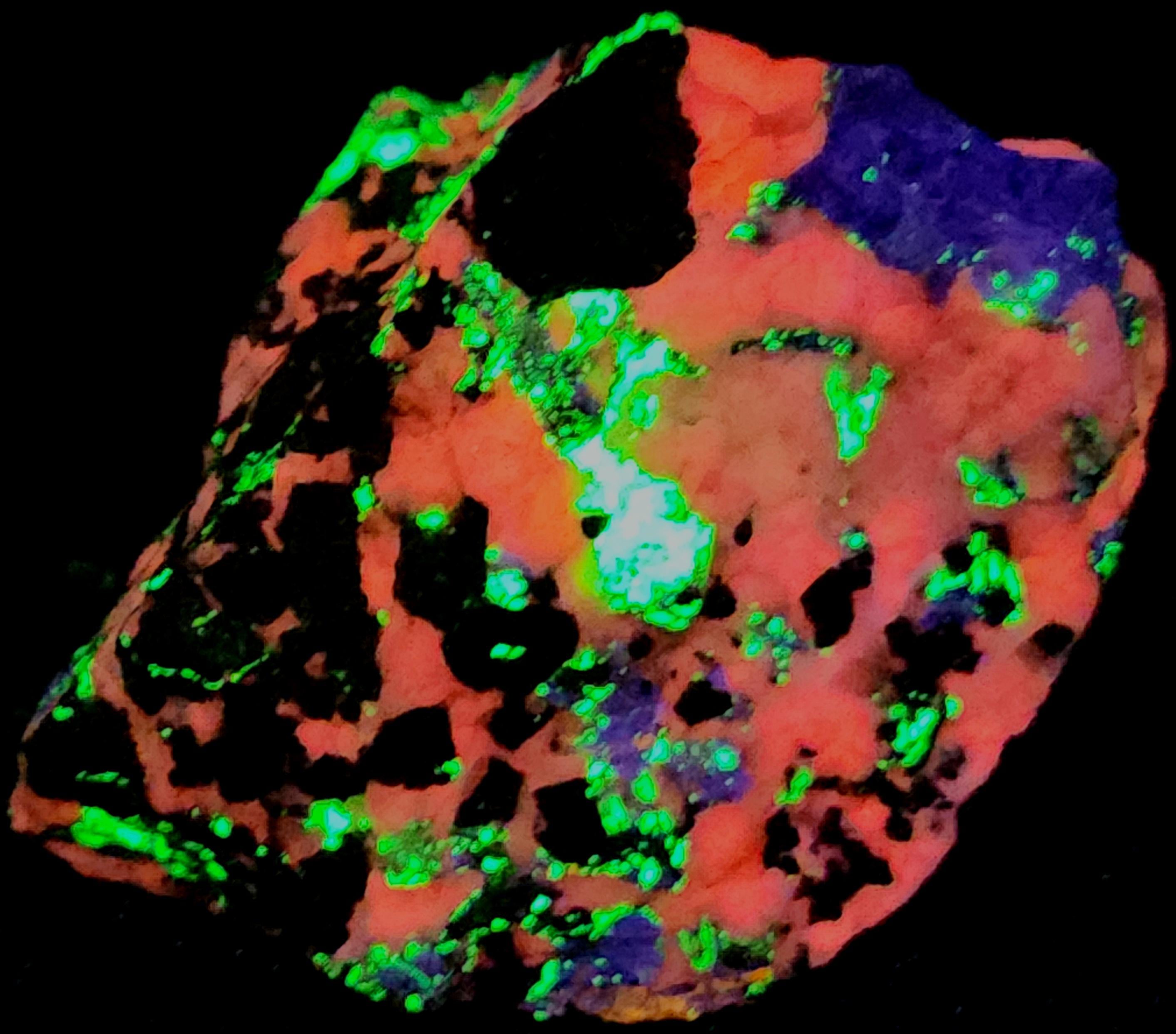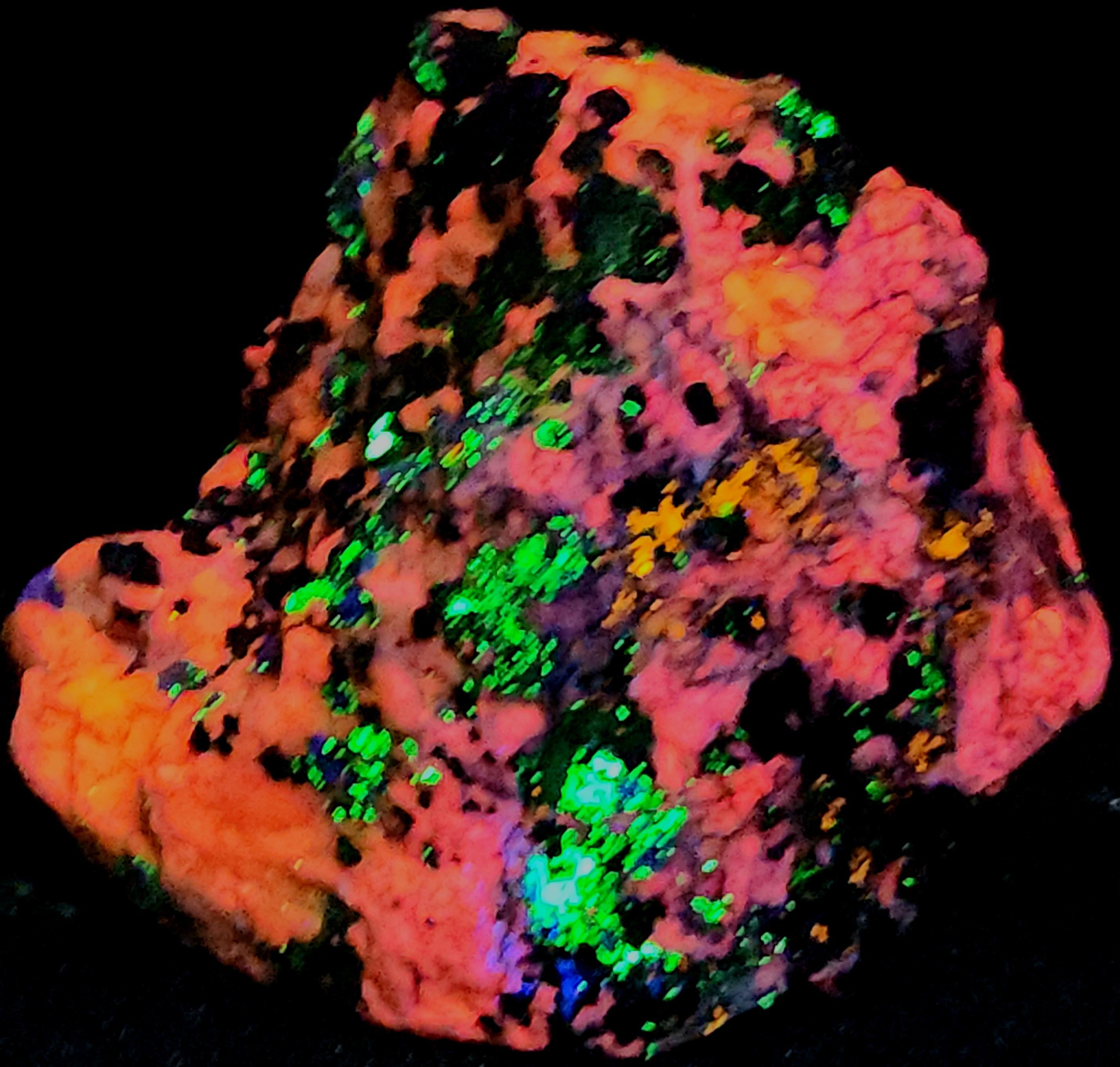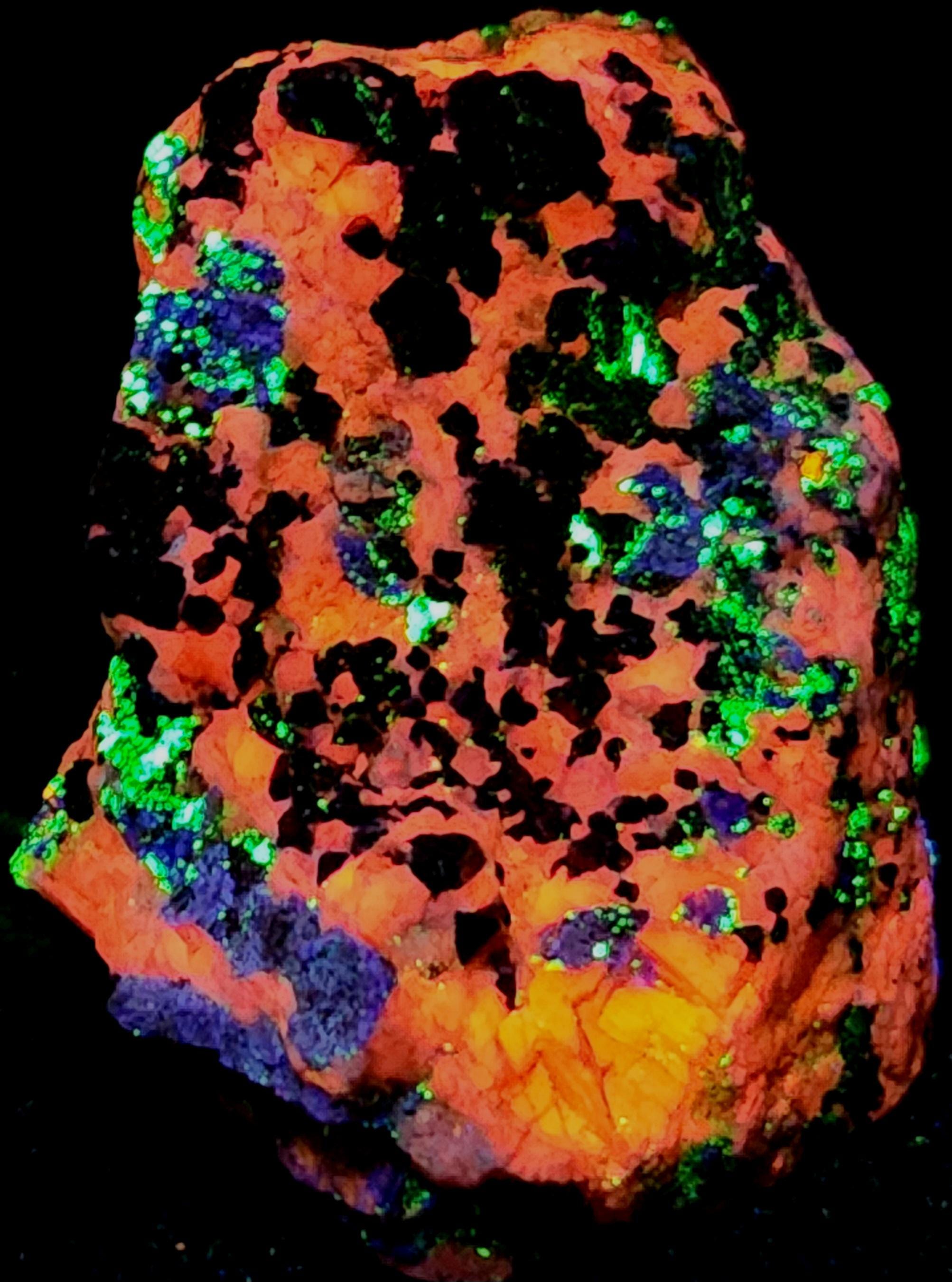 Fluorescent Hardystonite Crystalloids (Blue / Violet SW), Willemite (Bright Green SW & LW), Calcite (Bright Red/Orange SW) & Clinohedrite (Orange SW)