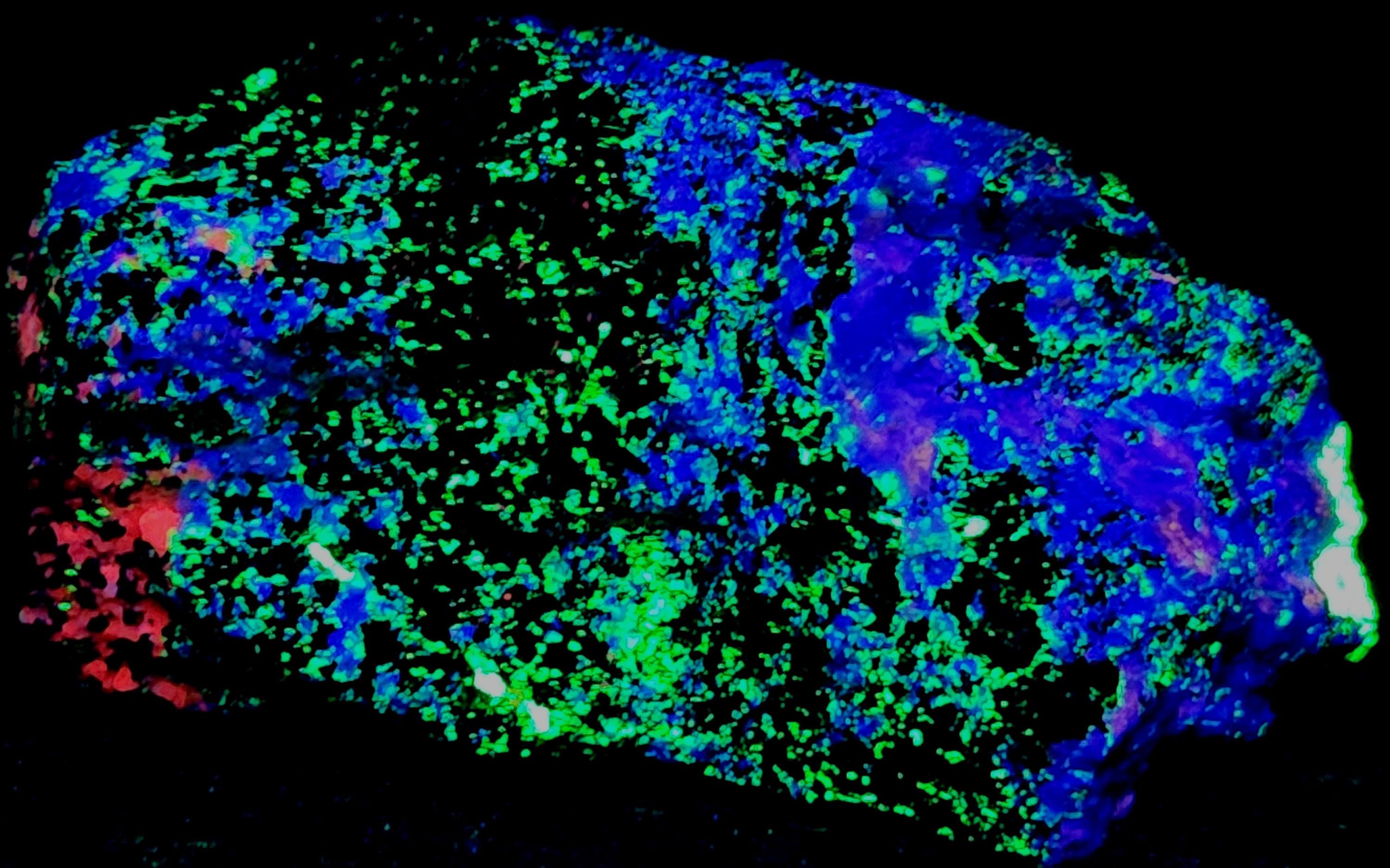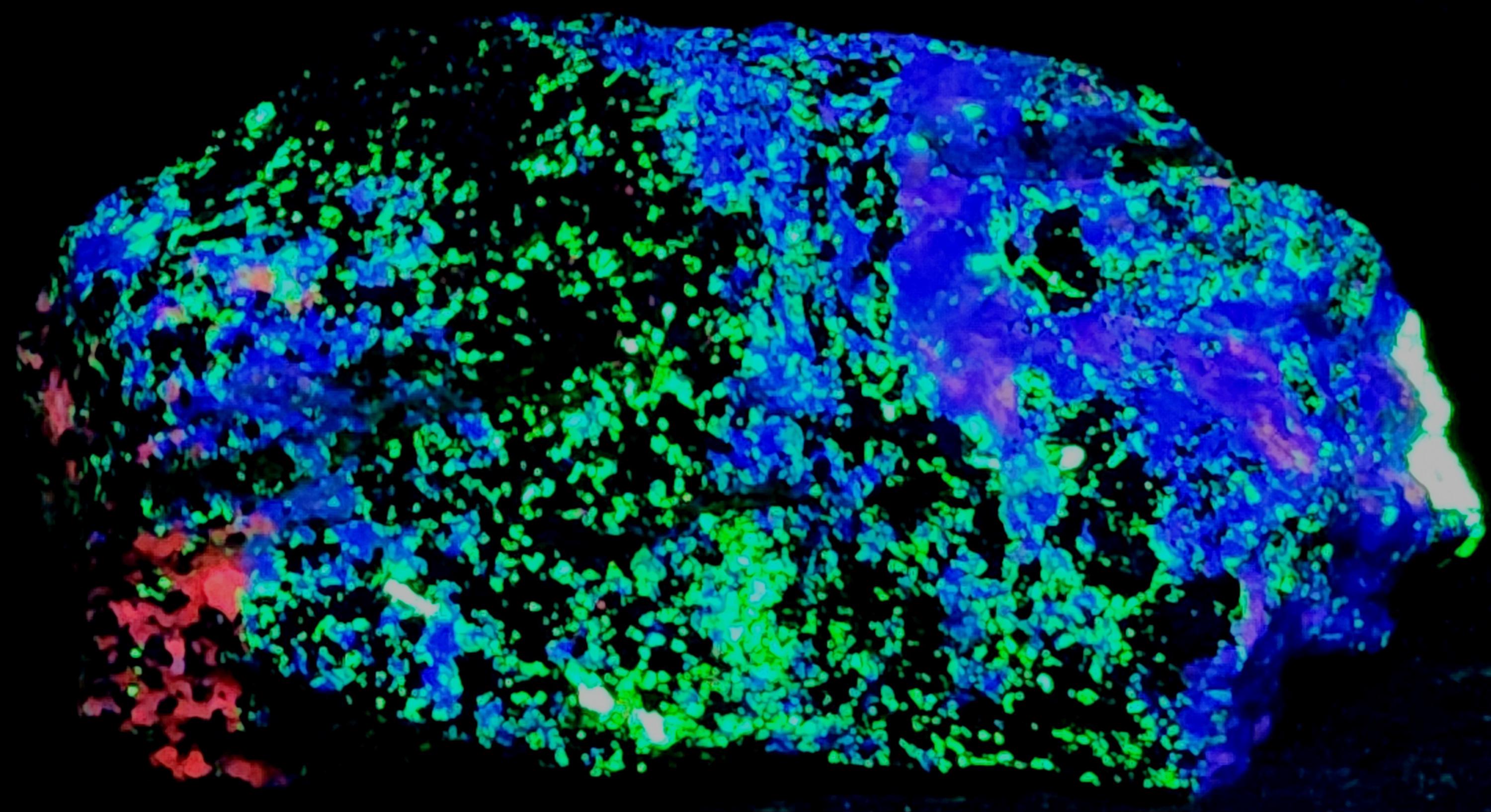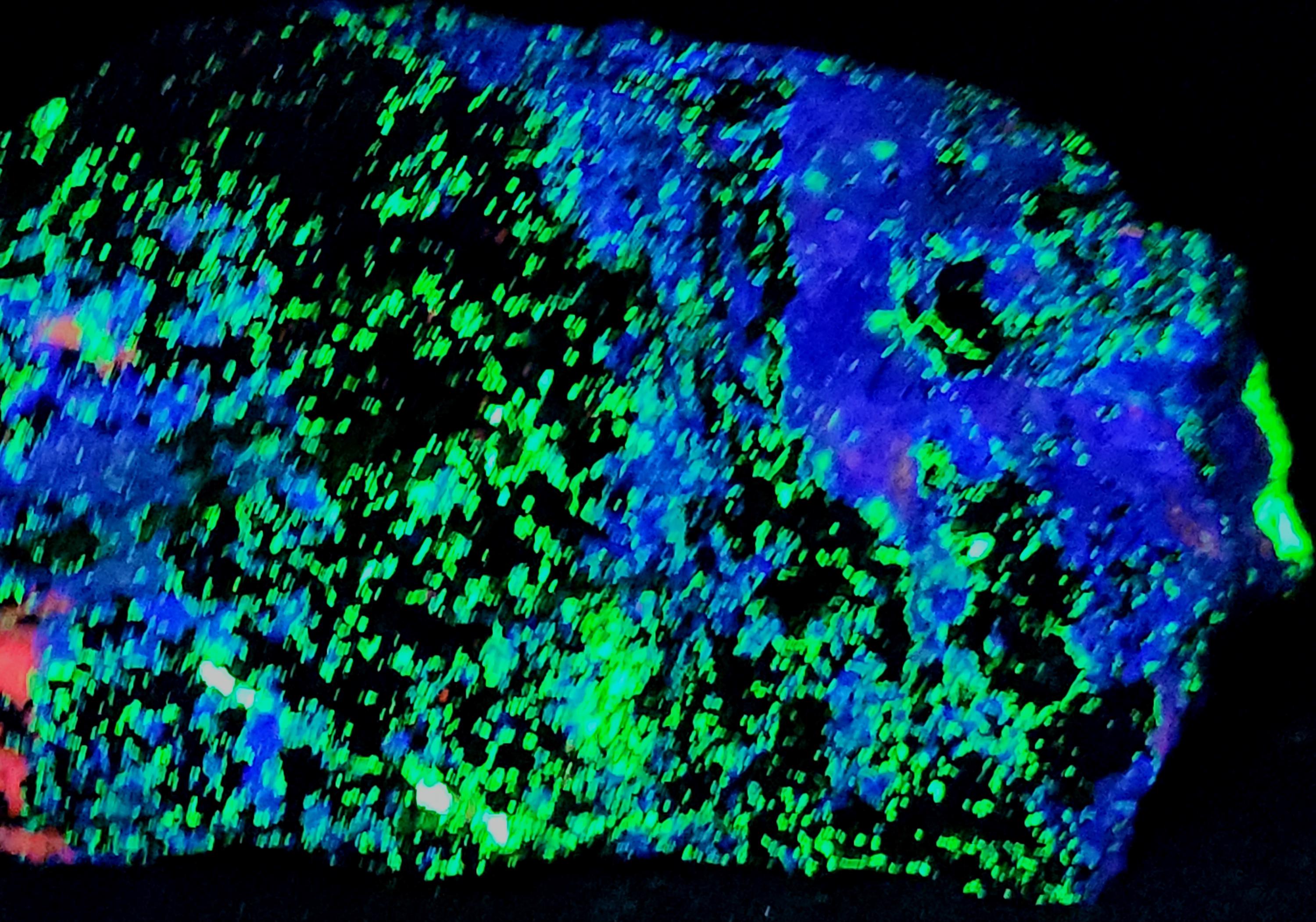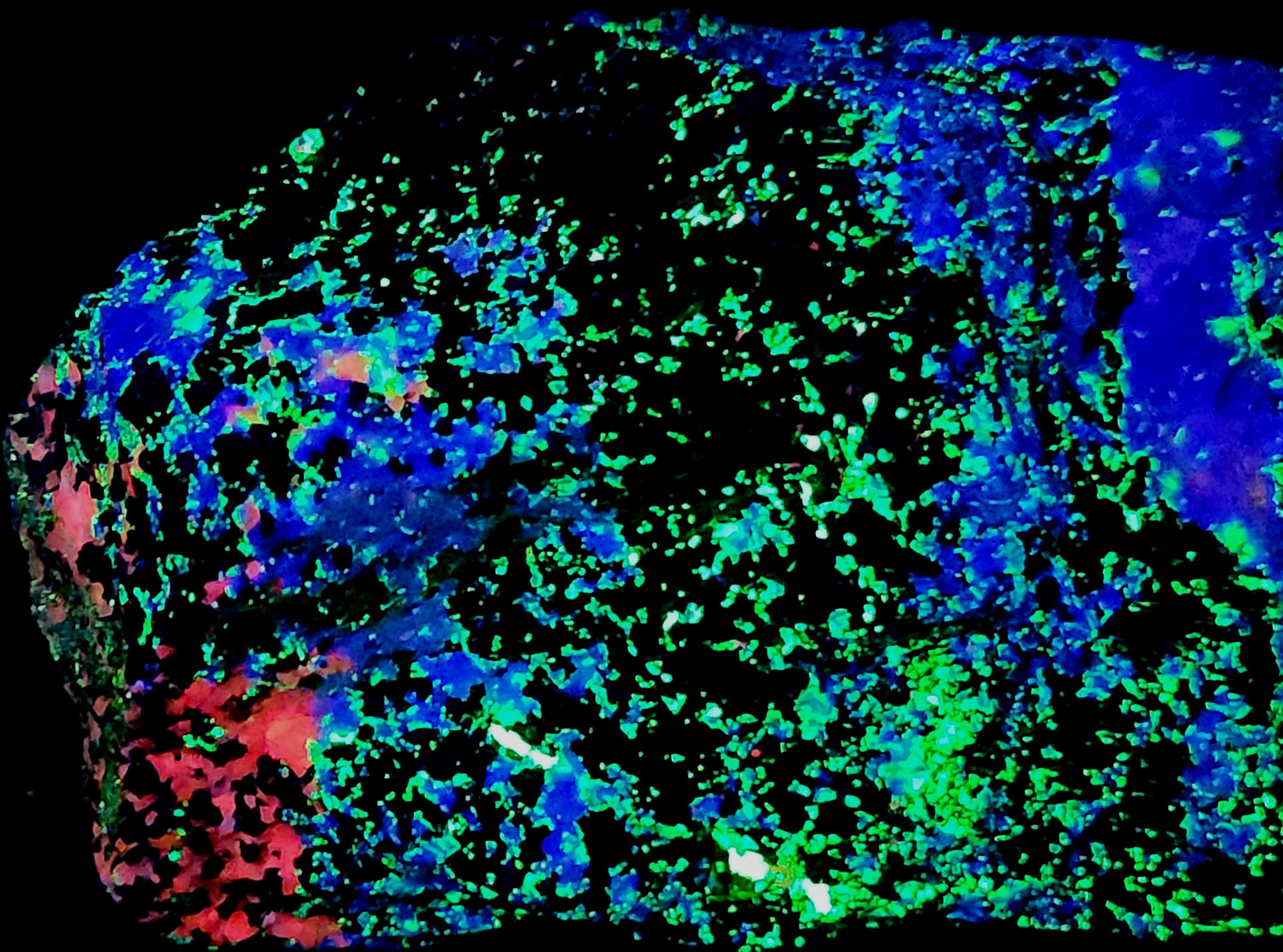Fluorescent Hardystonite (Blue SW), Willemite (Bright Green SW & LW), Calcite (Bright Red/Orange SW) & Clinohedrite (Pink/Peach Areas in Hardystonite SW)