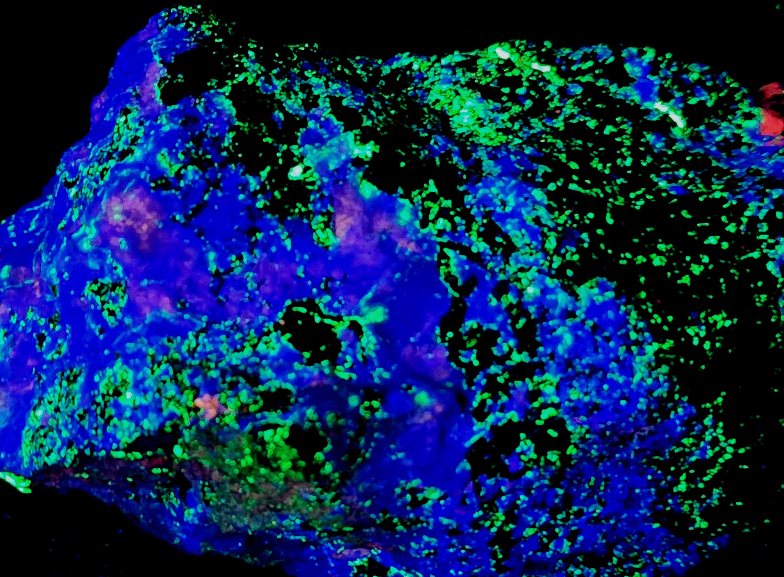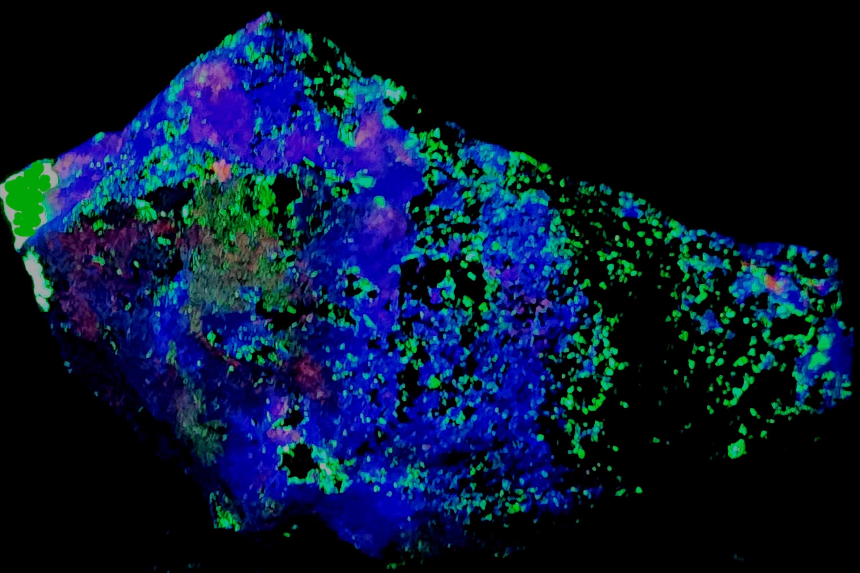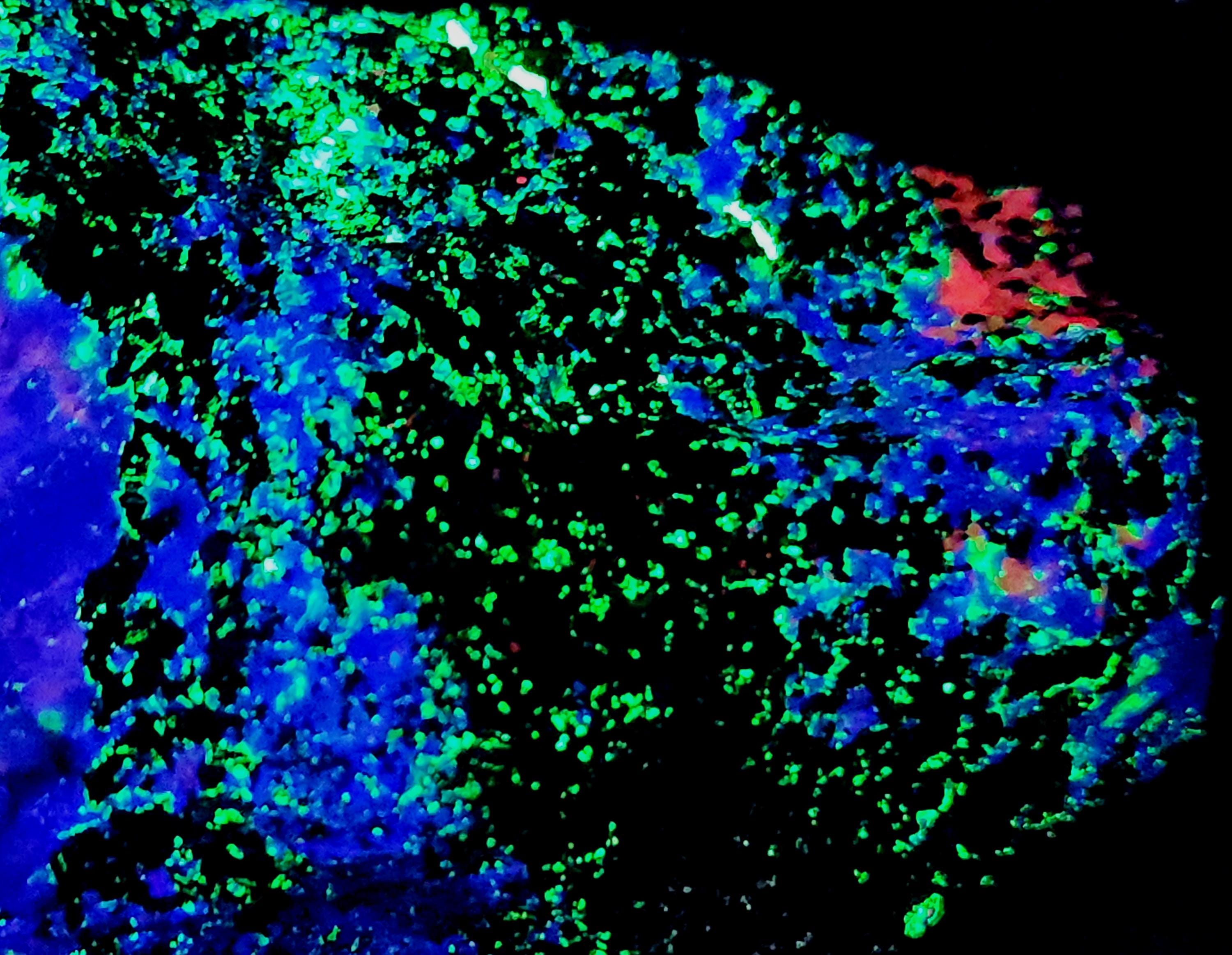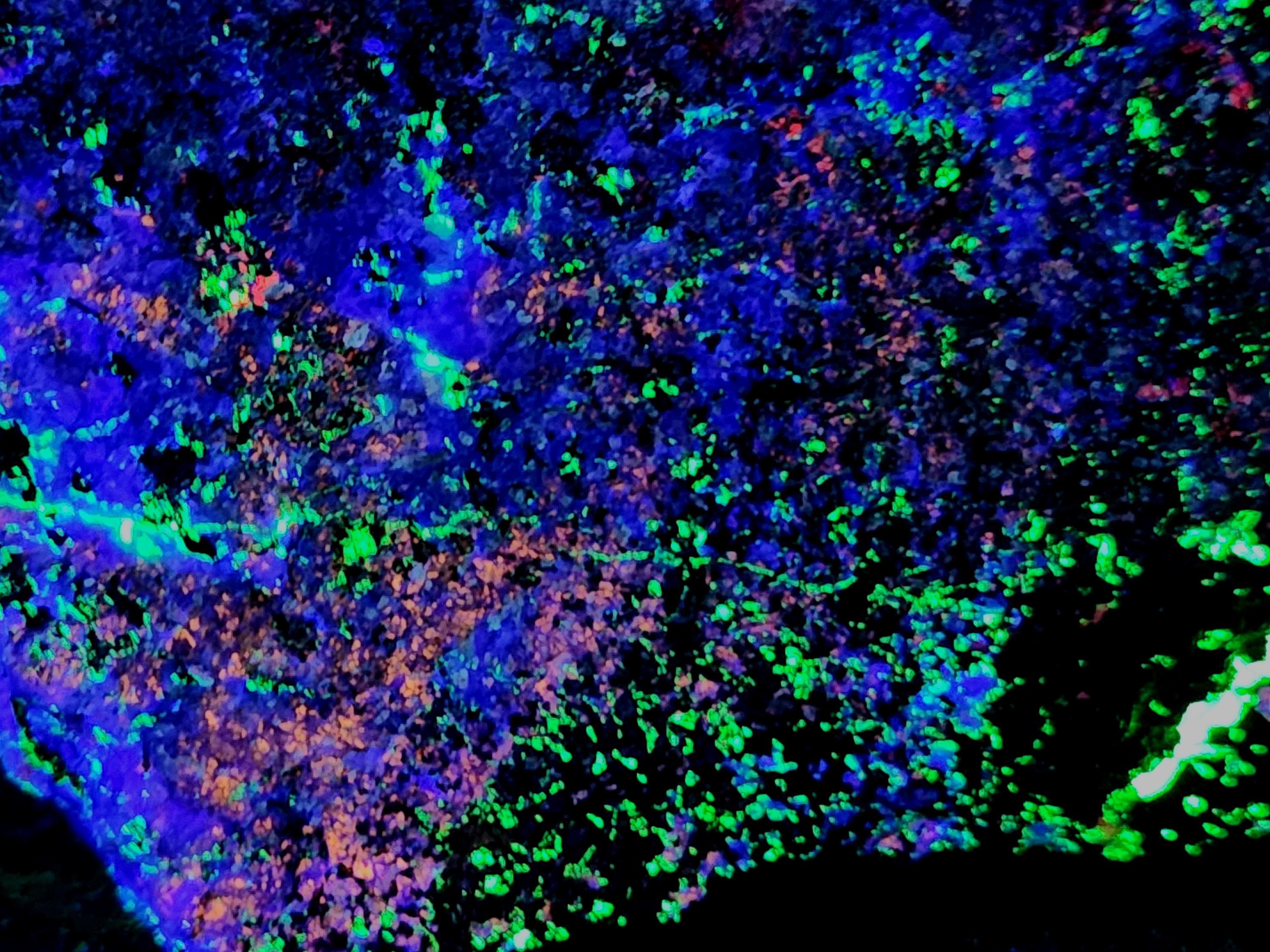 Fluorescent Hardystonite (Blue SW), Willemite (Bright Green SW & LW), Calcite (Bright Red/Orange SW) & Clinohedrite (Pink/Peach Areas in Hardystonite SW)