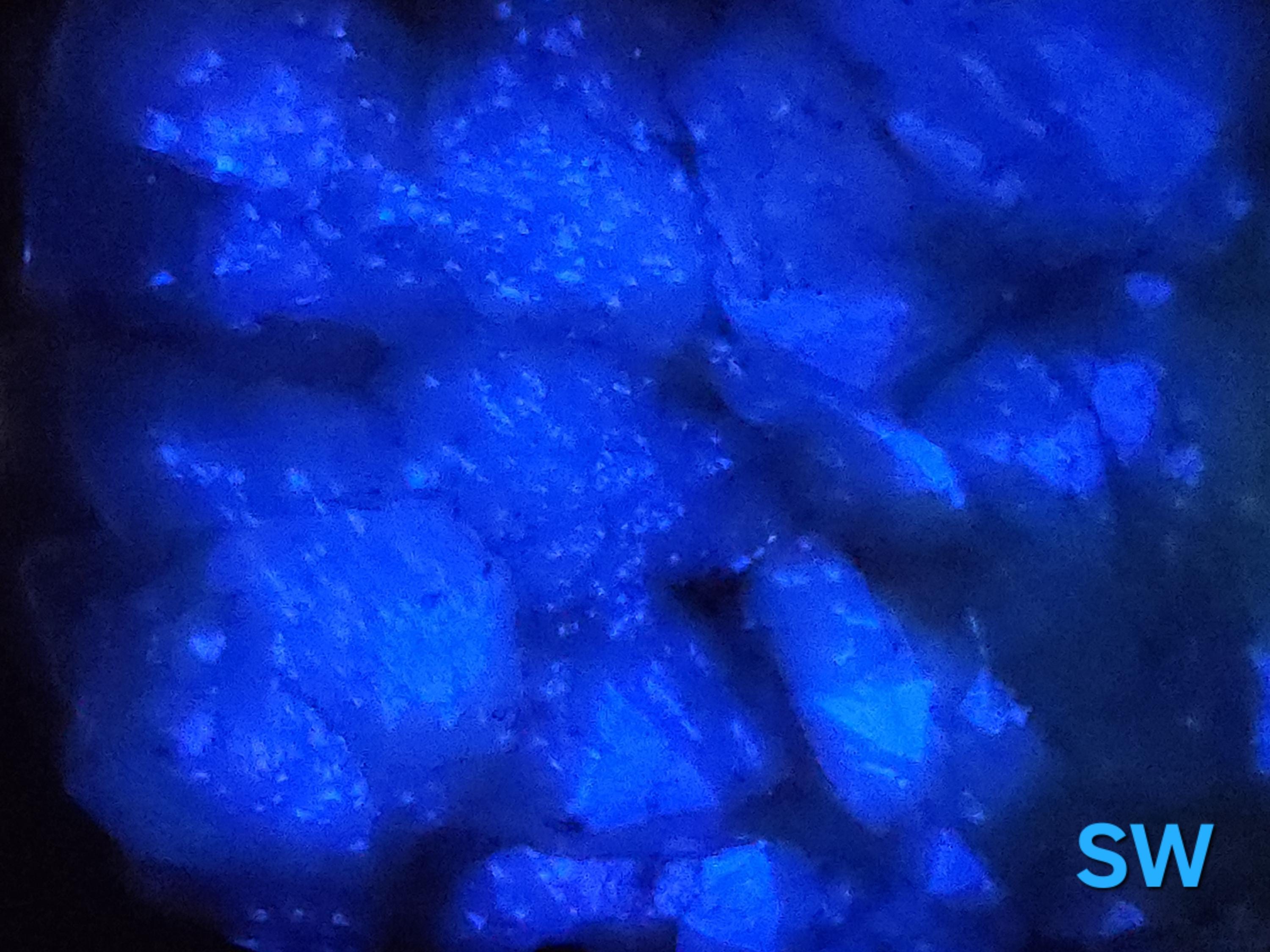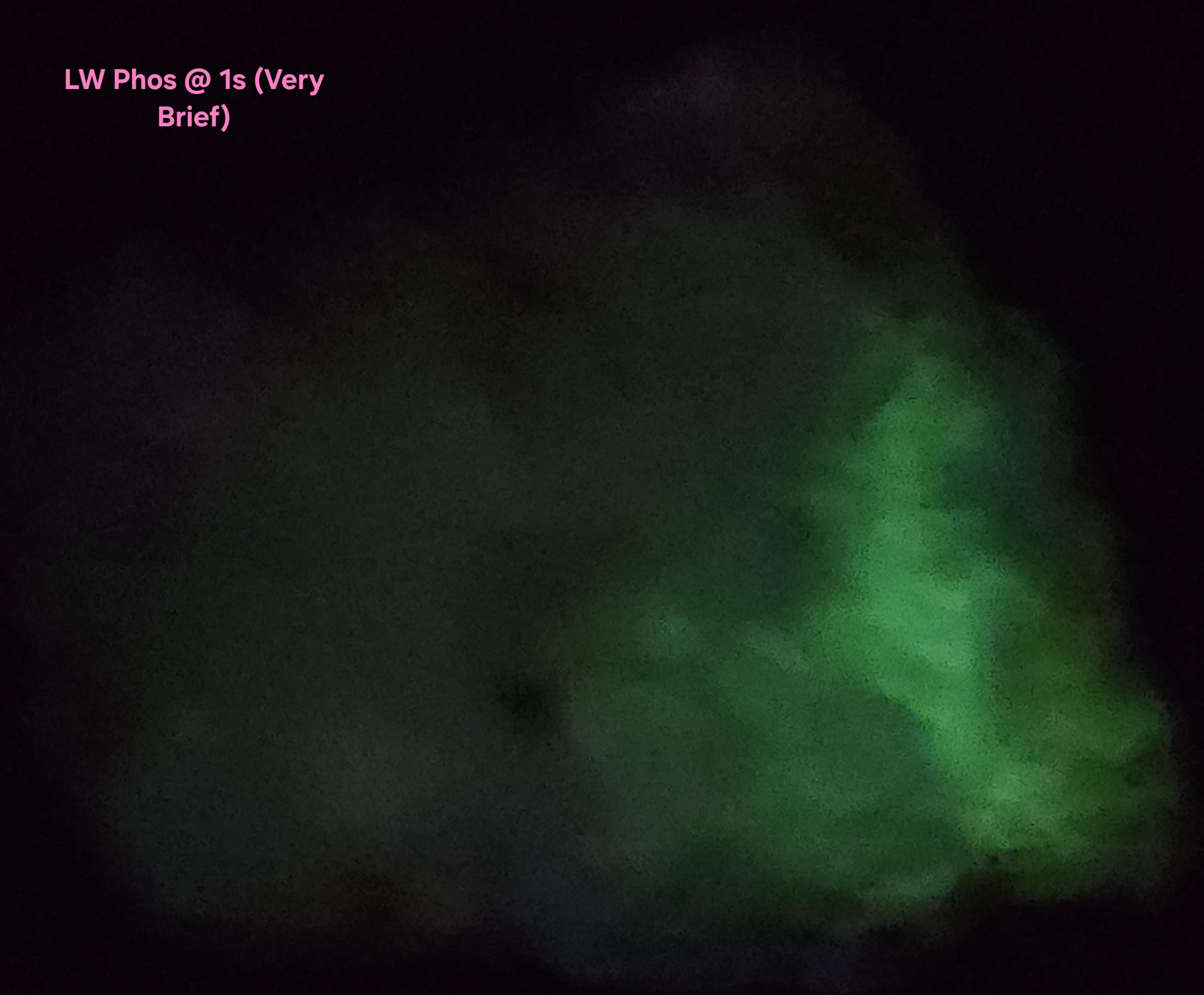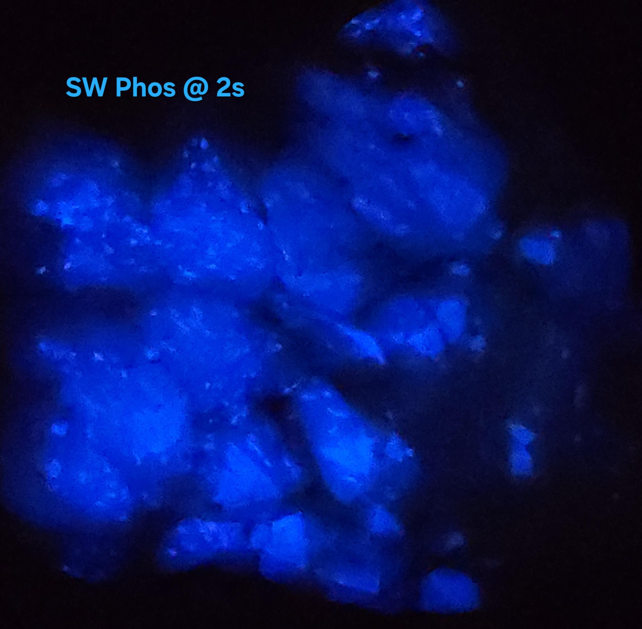 All Fluorescent Pics are Labeled with the Wavelength Used. Shortwave (SW) UV using a 35w WayTooCool SW Light. Midwave (MW) UV is with an FS Hunter L6 Pro 310nm LED Flashlight. Longwave (LW) UV is using a Convoy C8+ 365nm LED Flashlight. Fluorescent Response will Vary Depending on Strength of Light Used, but Any Decent Light of the Proper Wavelength(s) Will Produce a Similar Response.