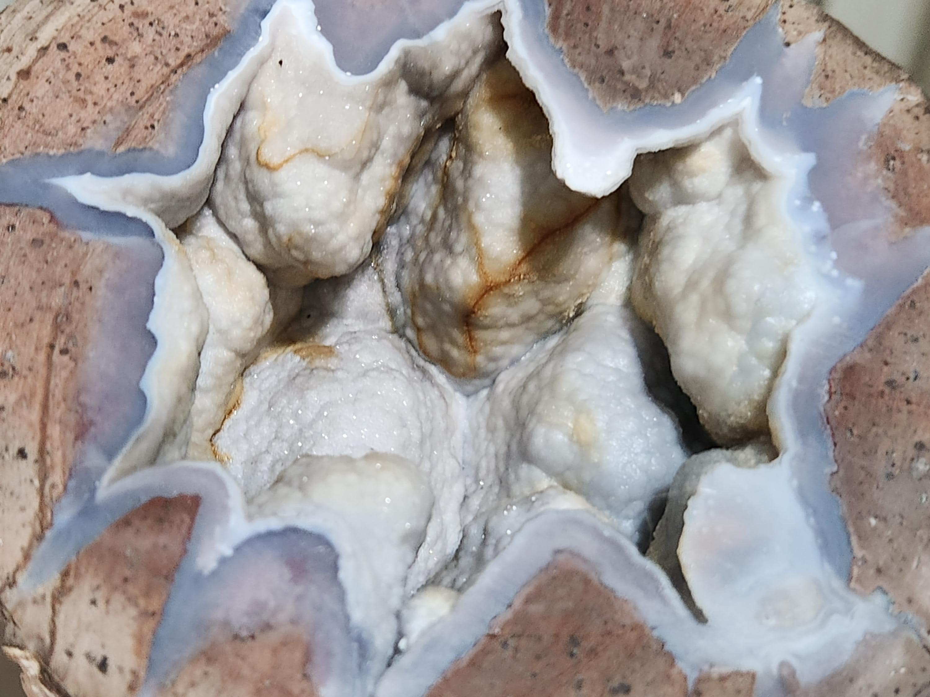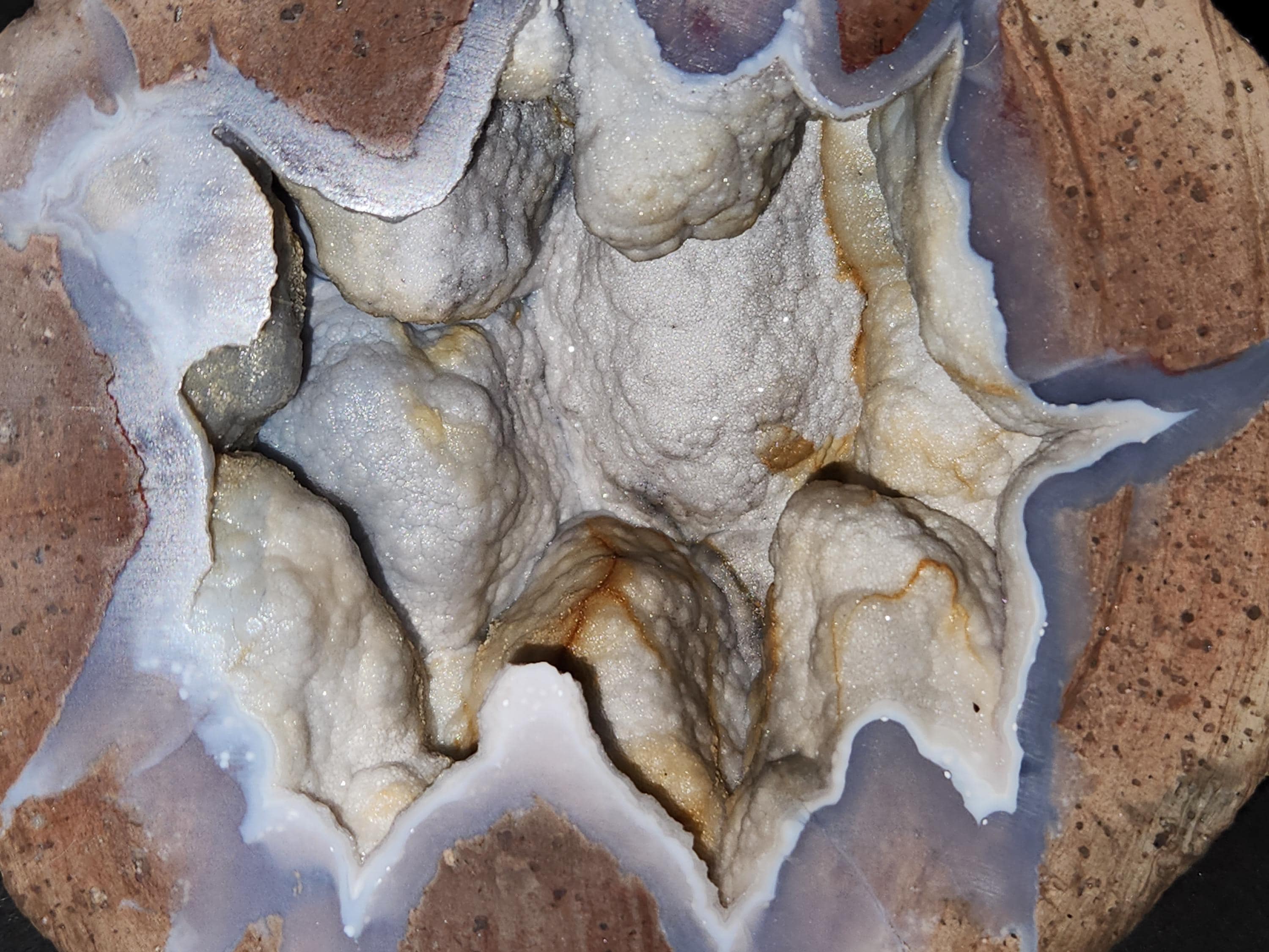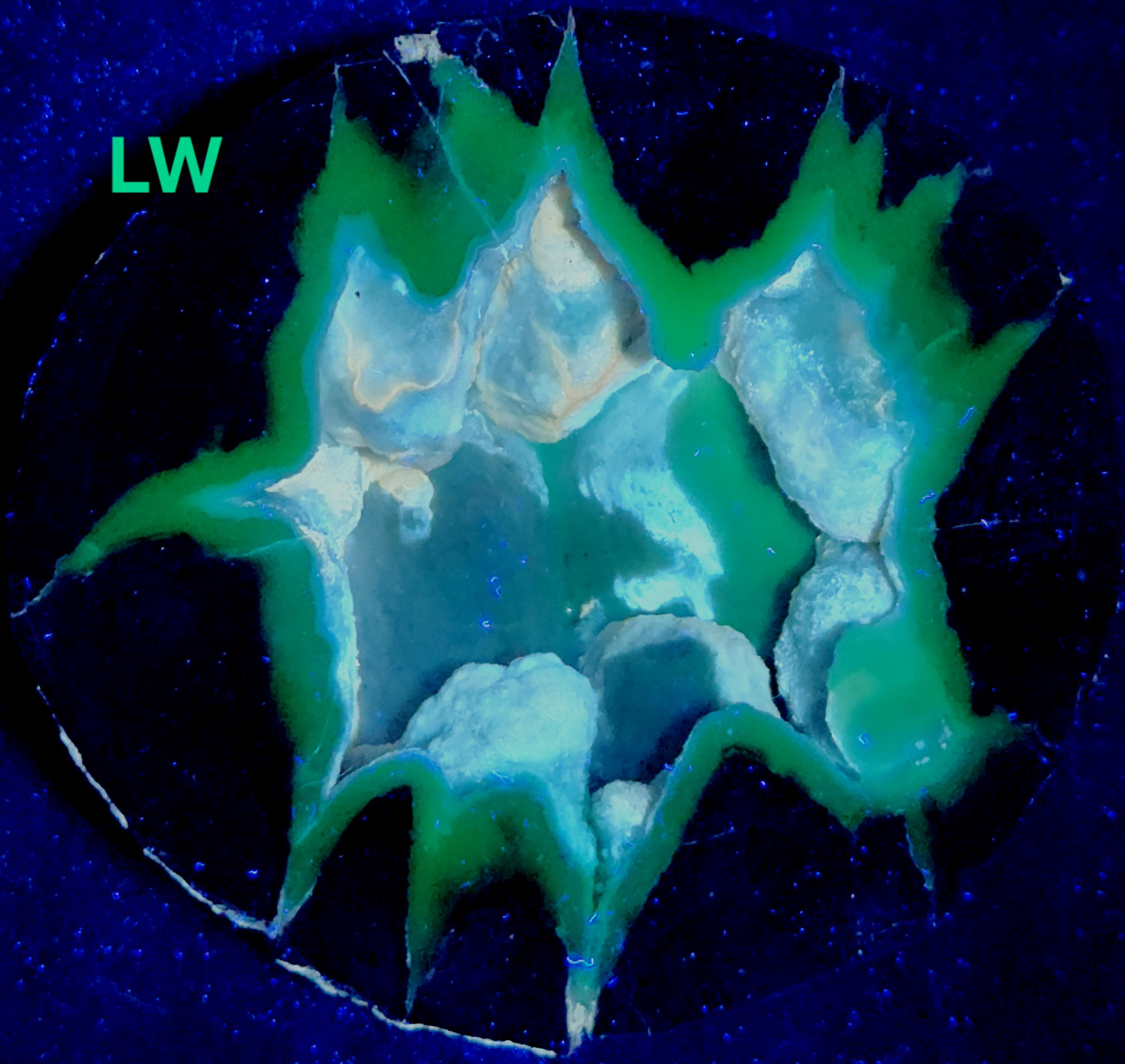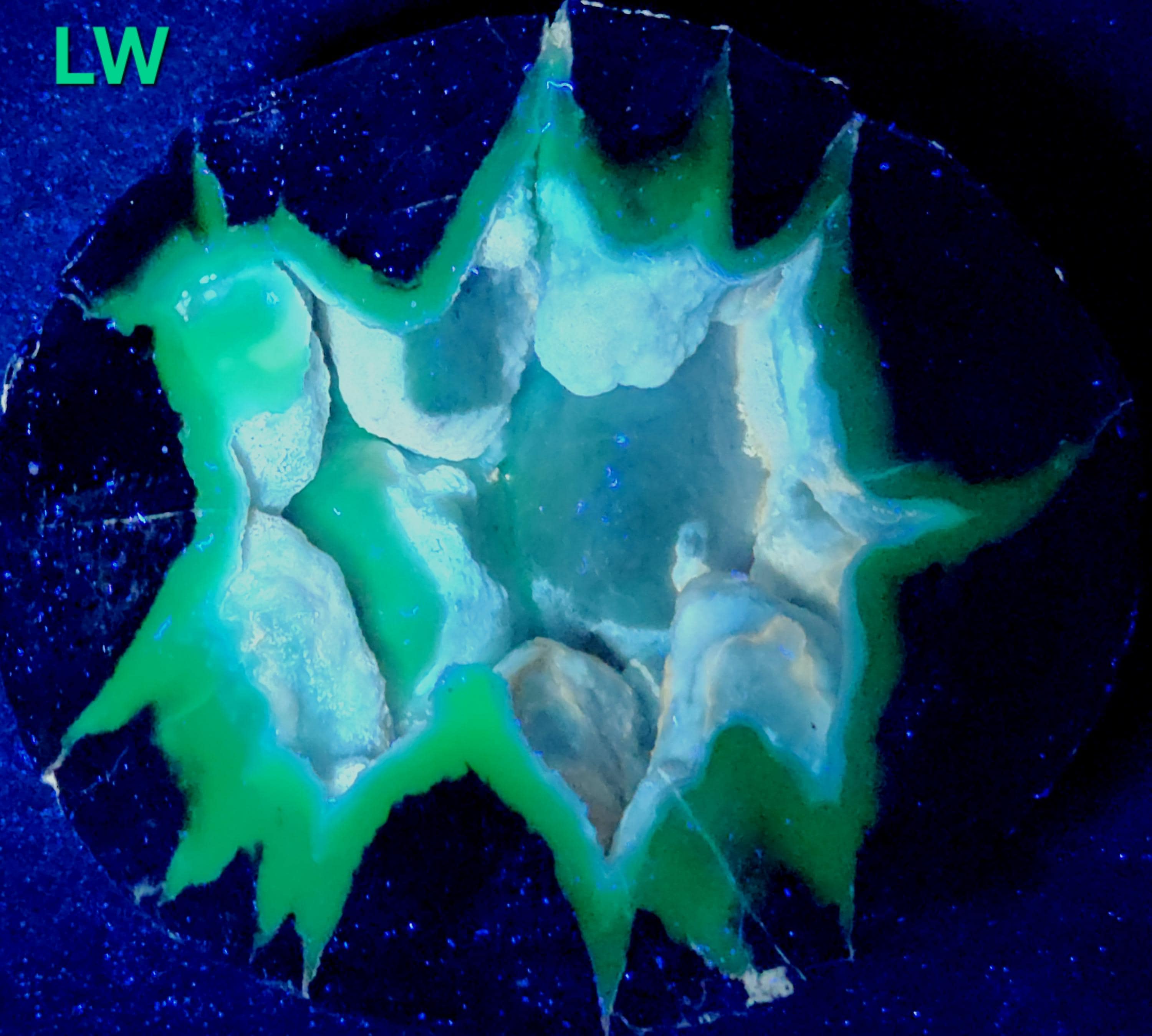 Gorgeous Shortwave/Midwave/Longwave UV Fluorescent + Phosphorescent Cut & Polished Half of a Dugway Chalcedony Geode with Sparkling Micro Druzy Quartz Crystals!
