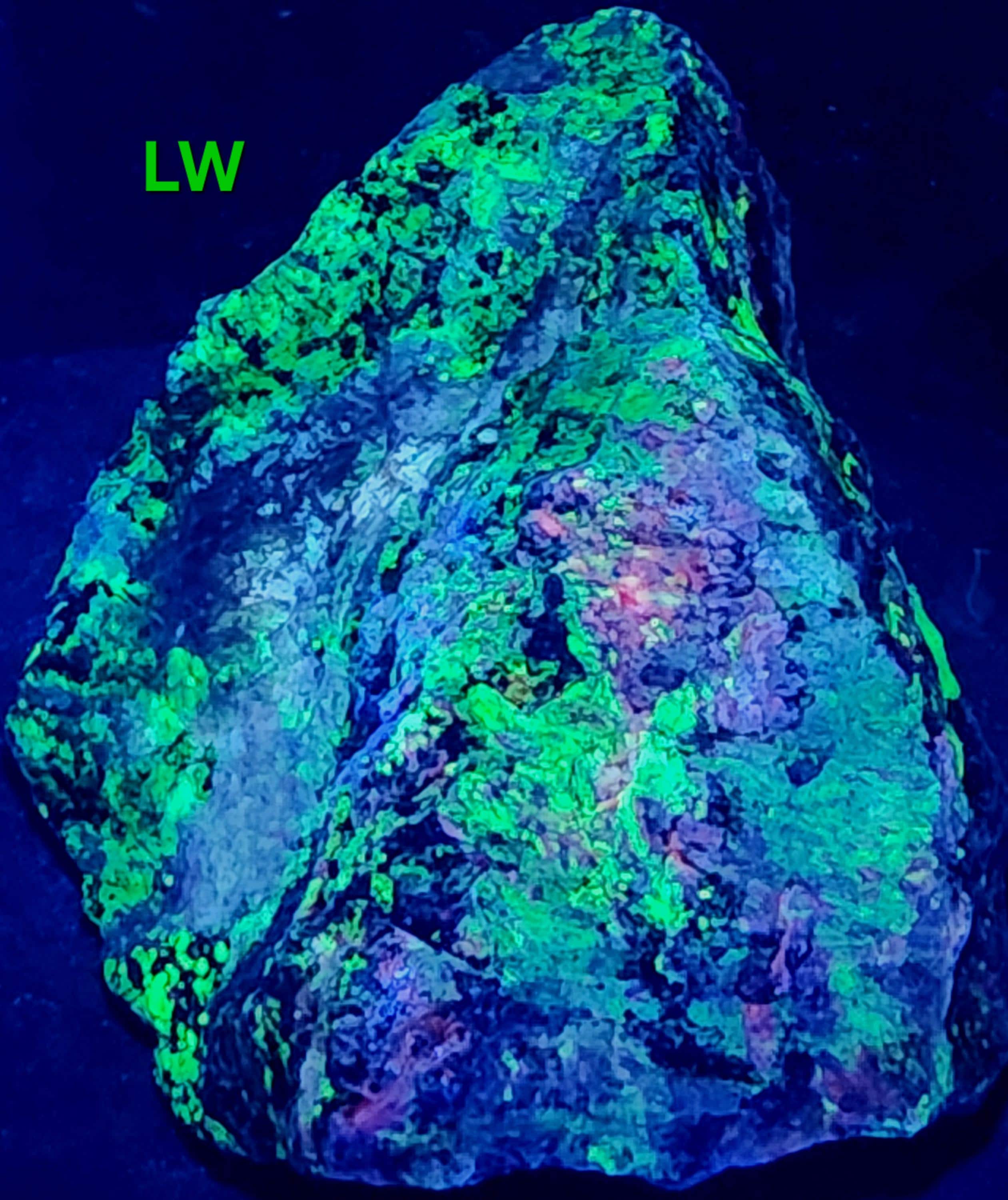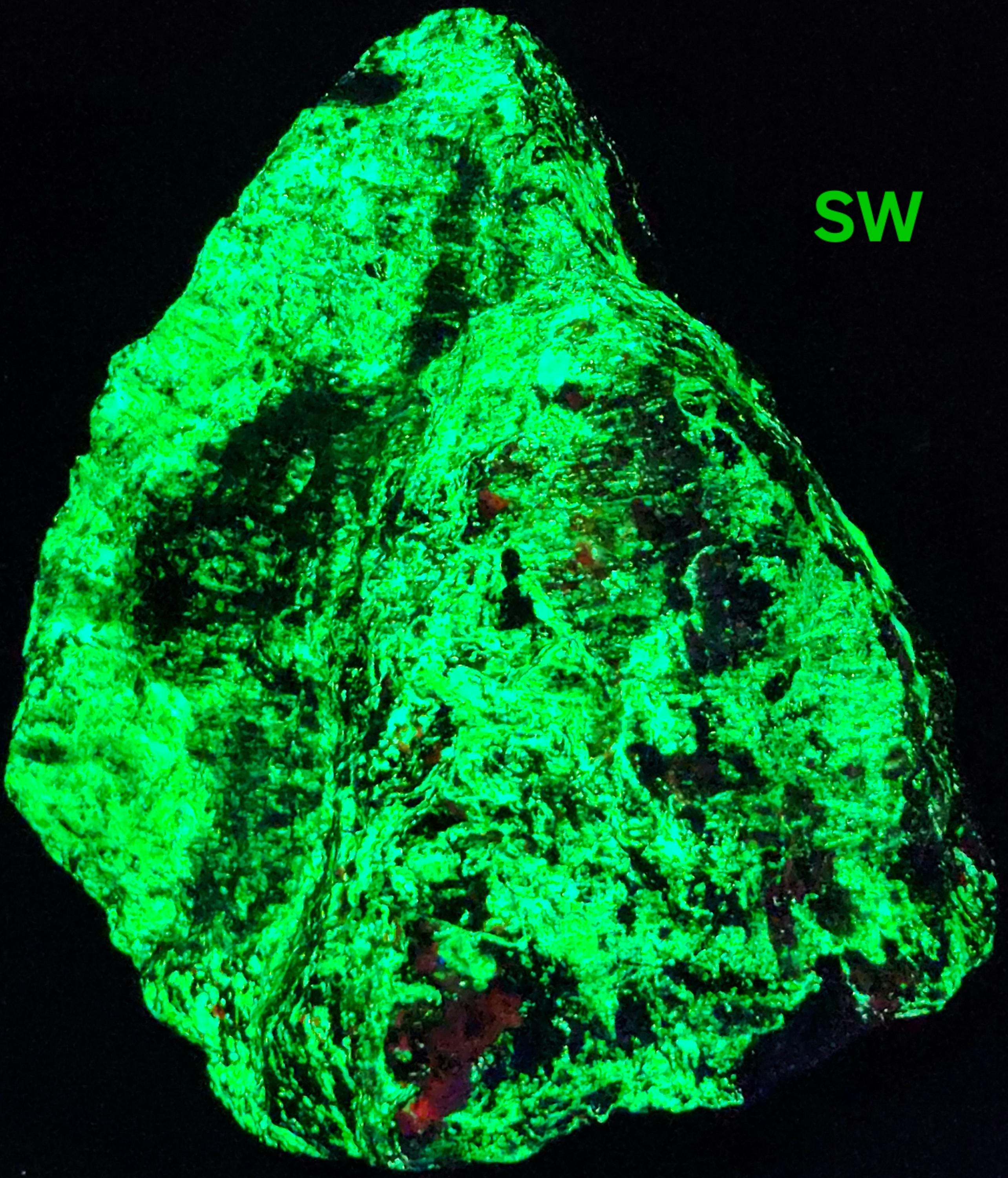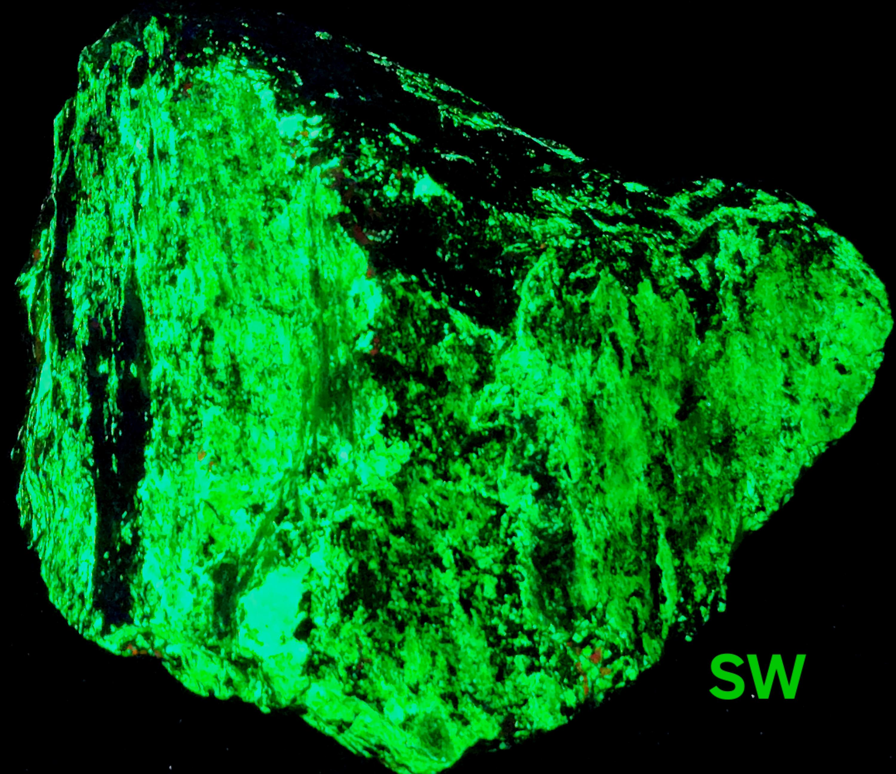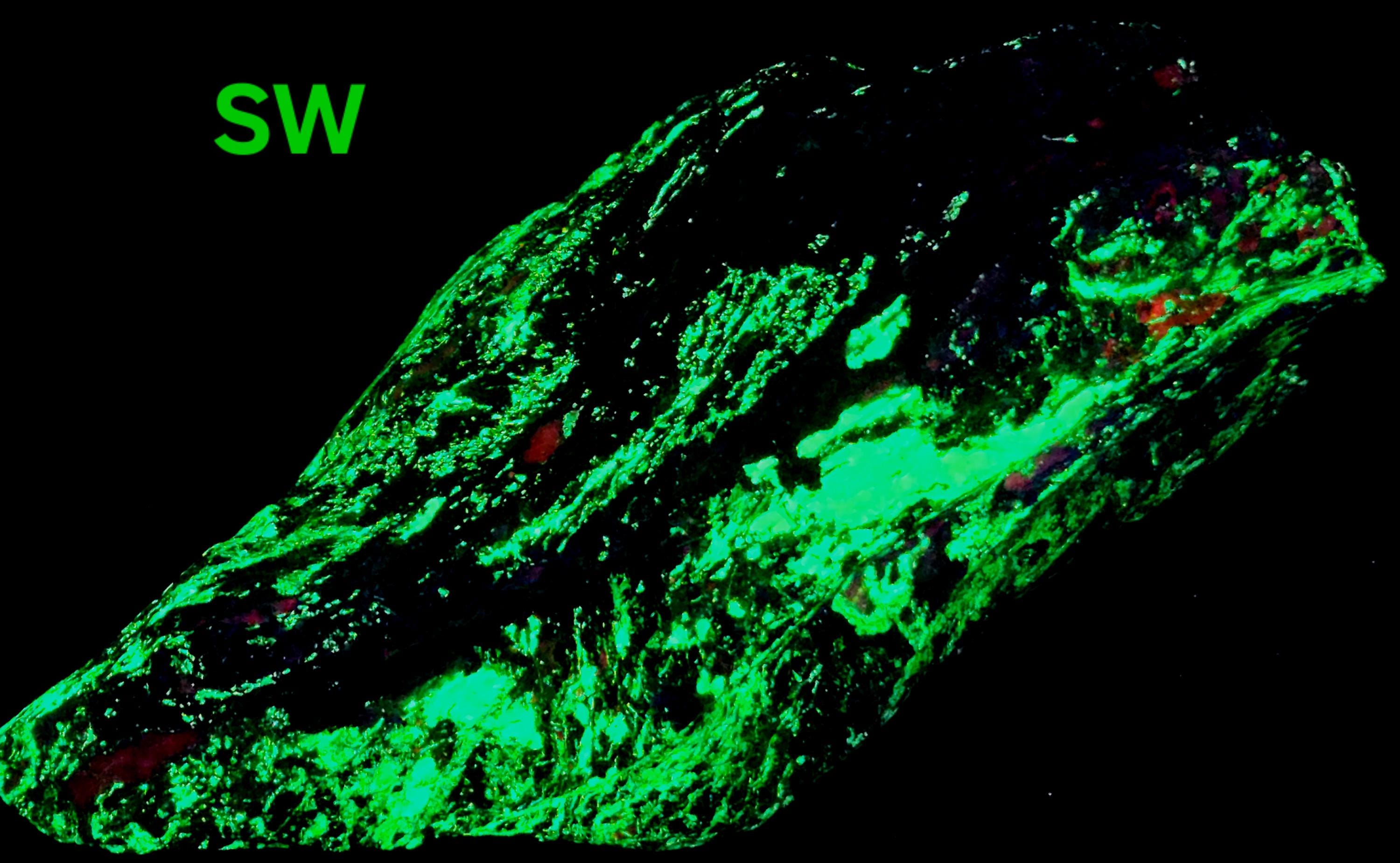Fluorescent Willemite (Bright Green SW, MW & LW) & Calcite (Bright Red/Orange SW + Dull Pink/Red MW/LW)