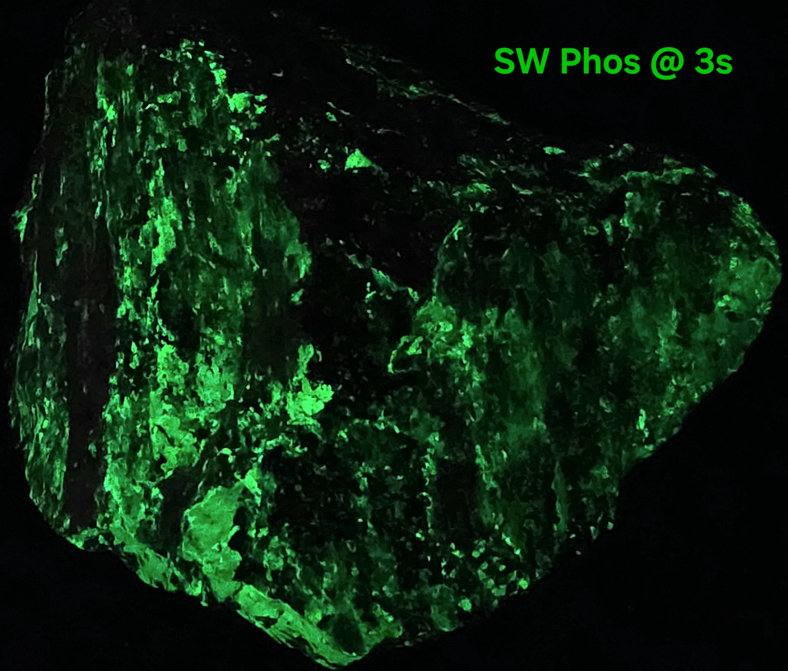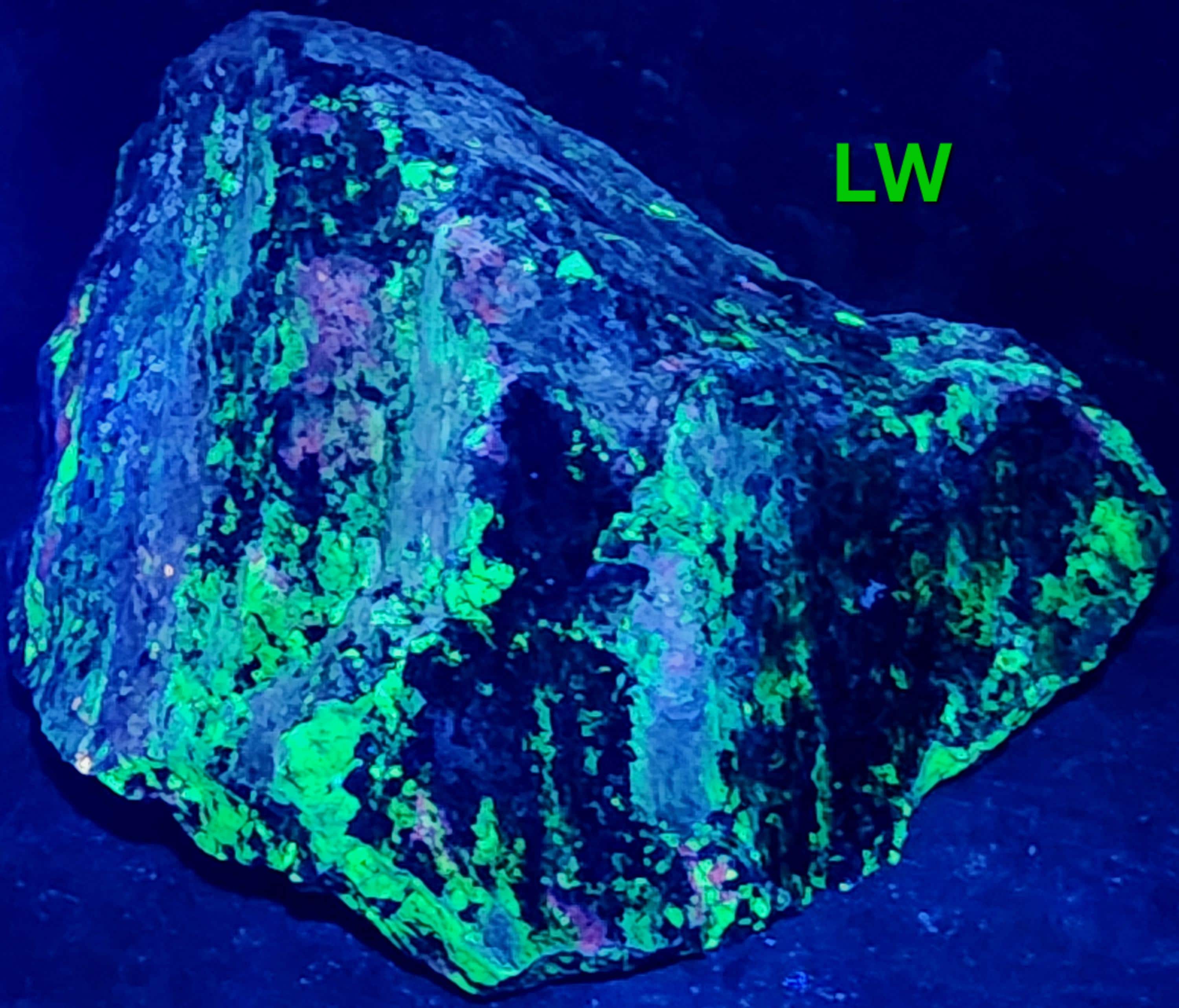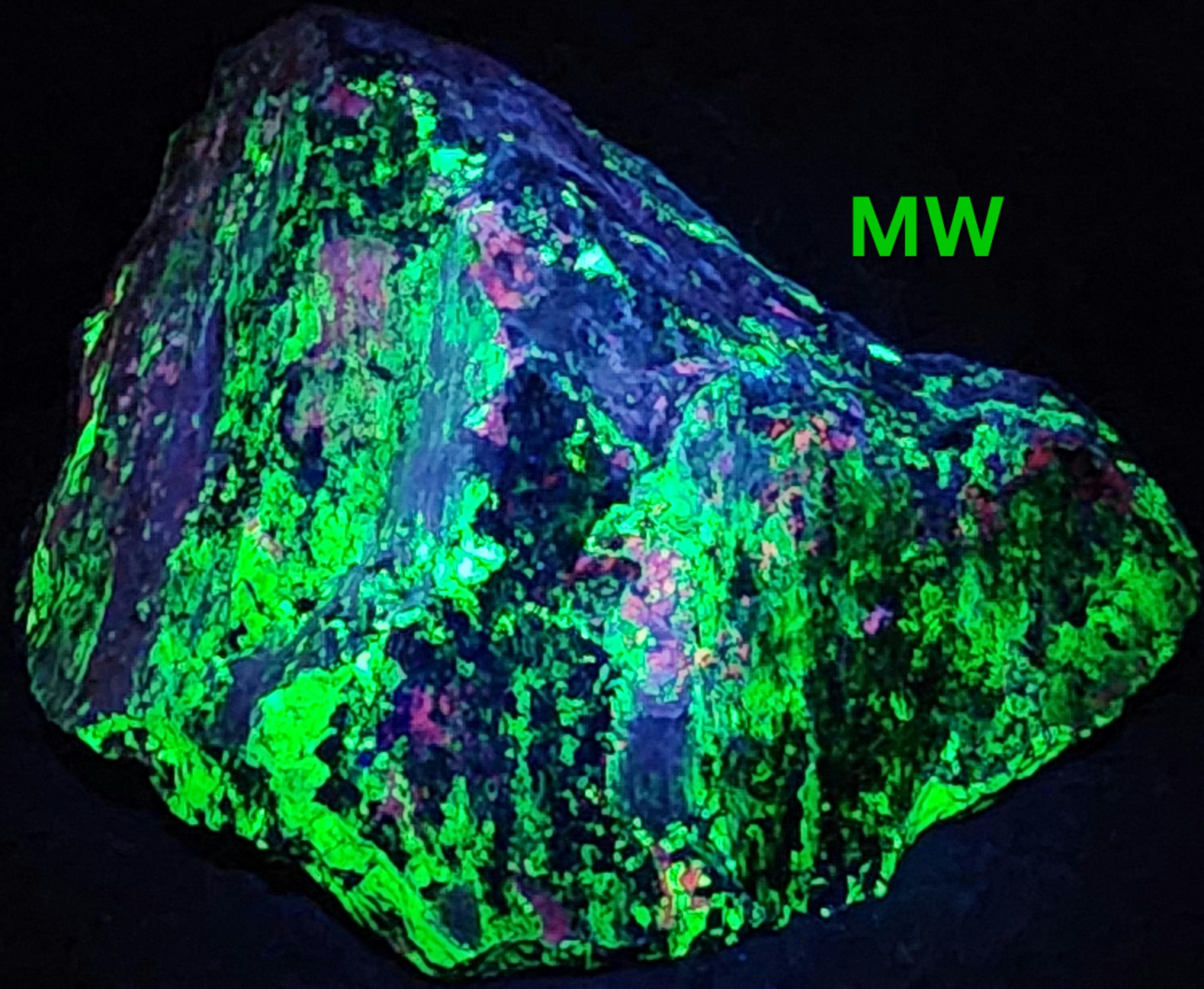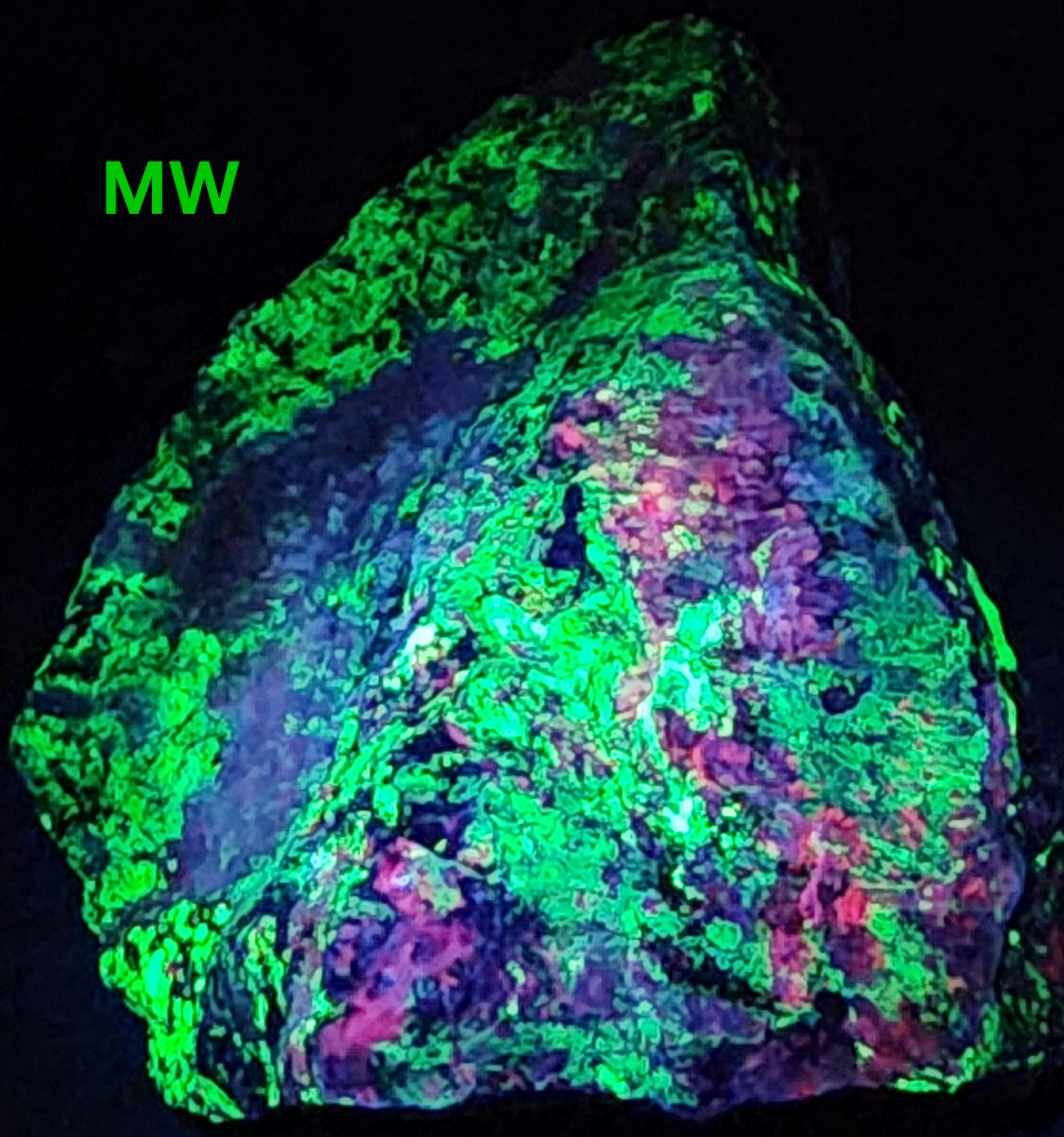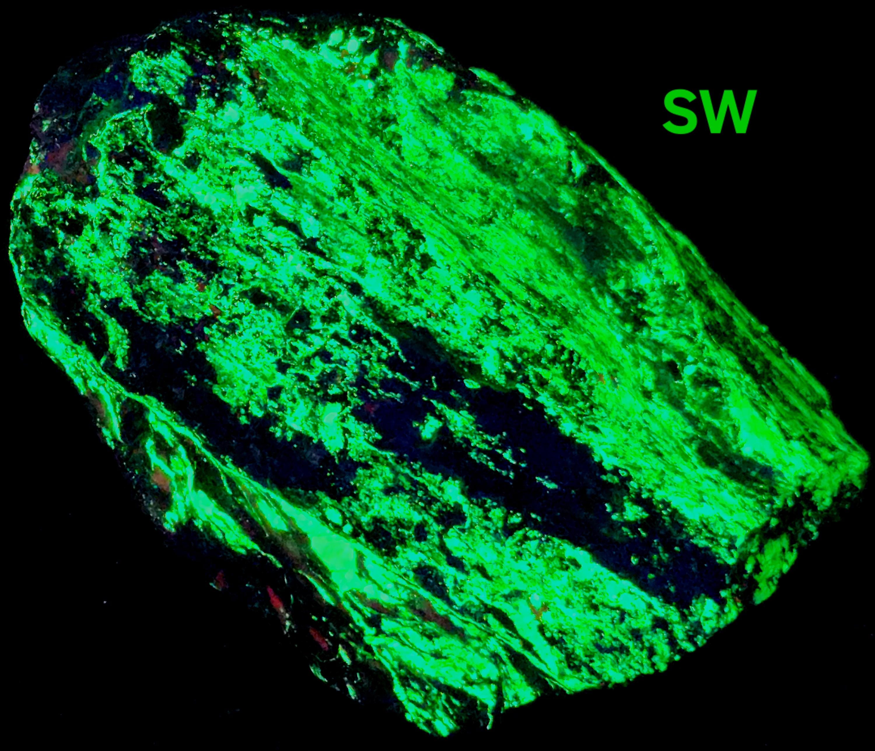 Fluorescent Willemite (Bright Green SW, MW & LW) & Calcite (Bright Red/Orange SW + Dull Pink/Red MW/LW)