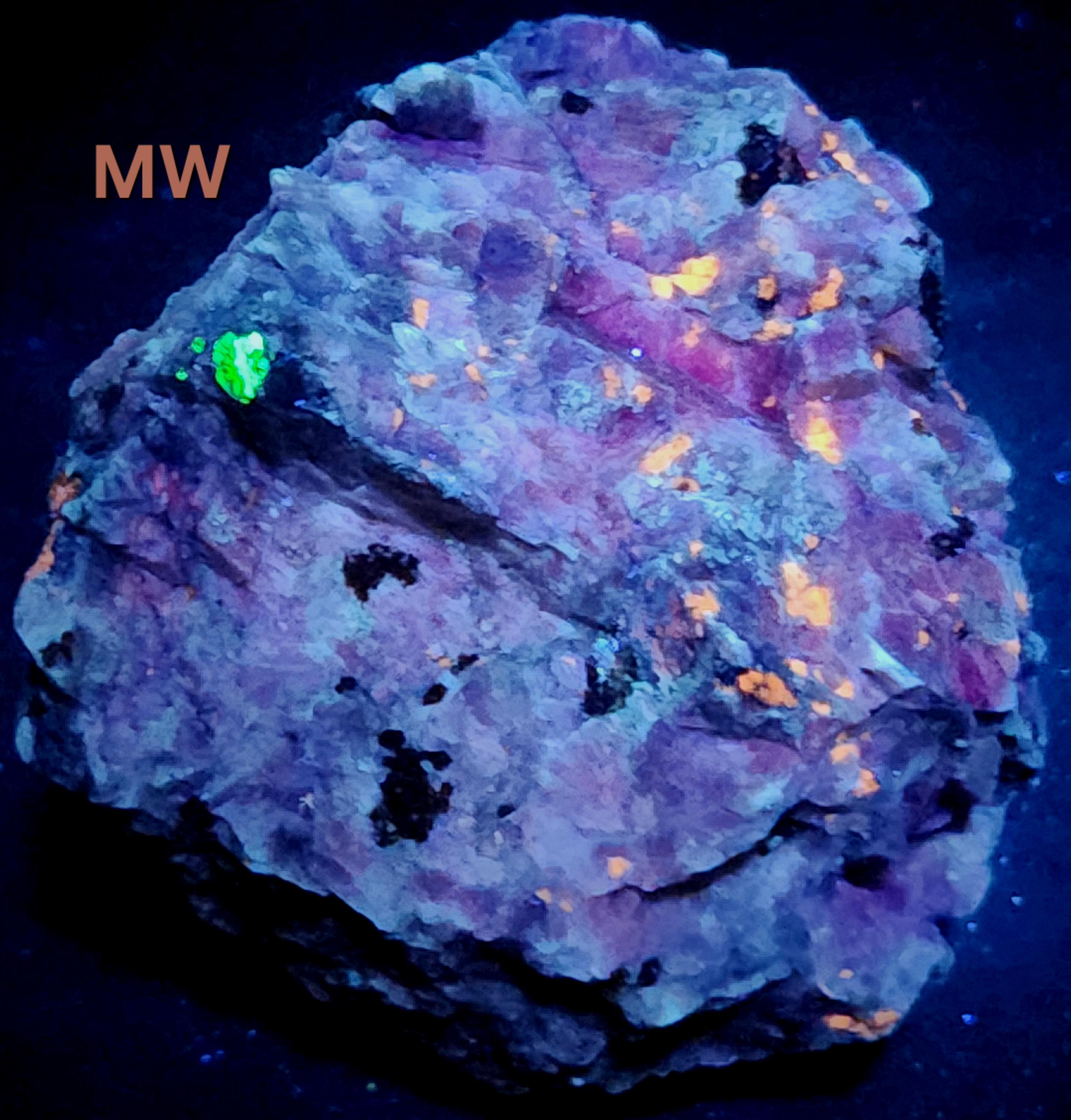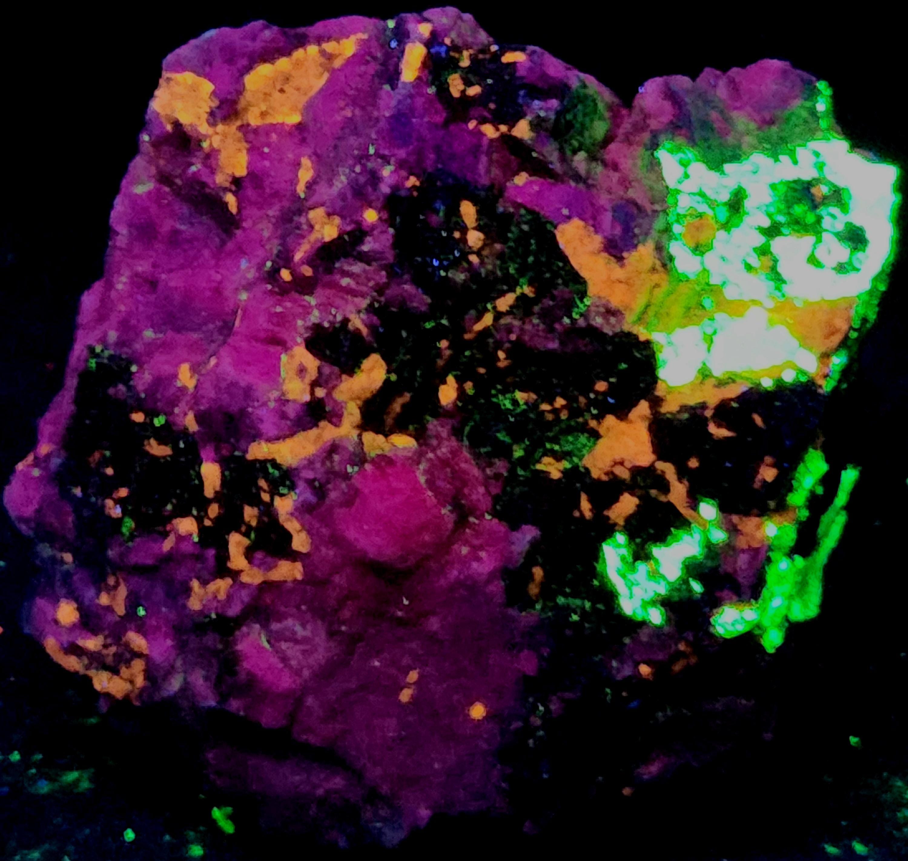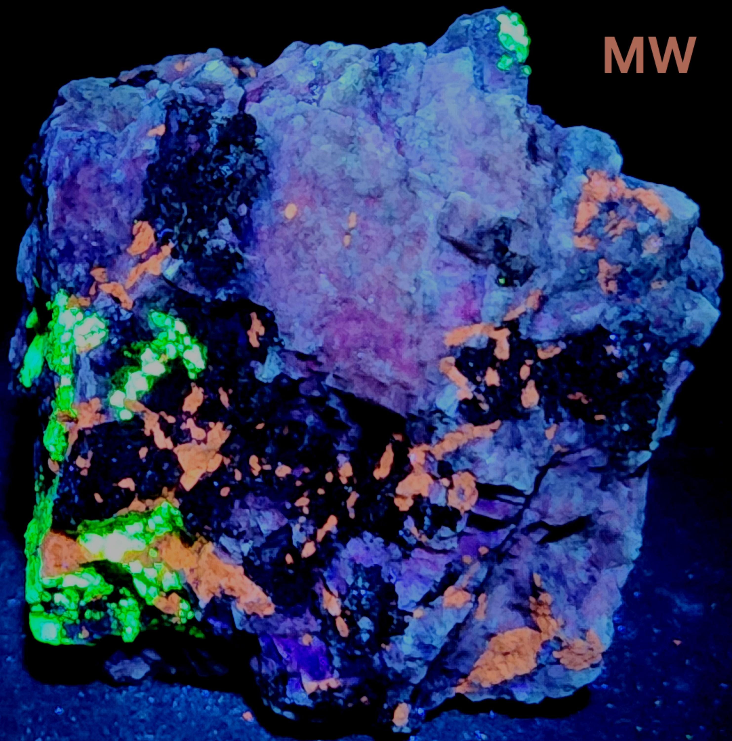 Fluorescent Fluorapatite (Orange SW & MW), Willemite (Bright Green SW, MW & LW) & Feldspar (Maroon SW)