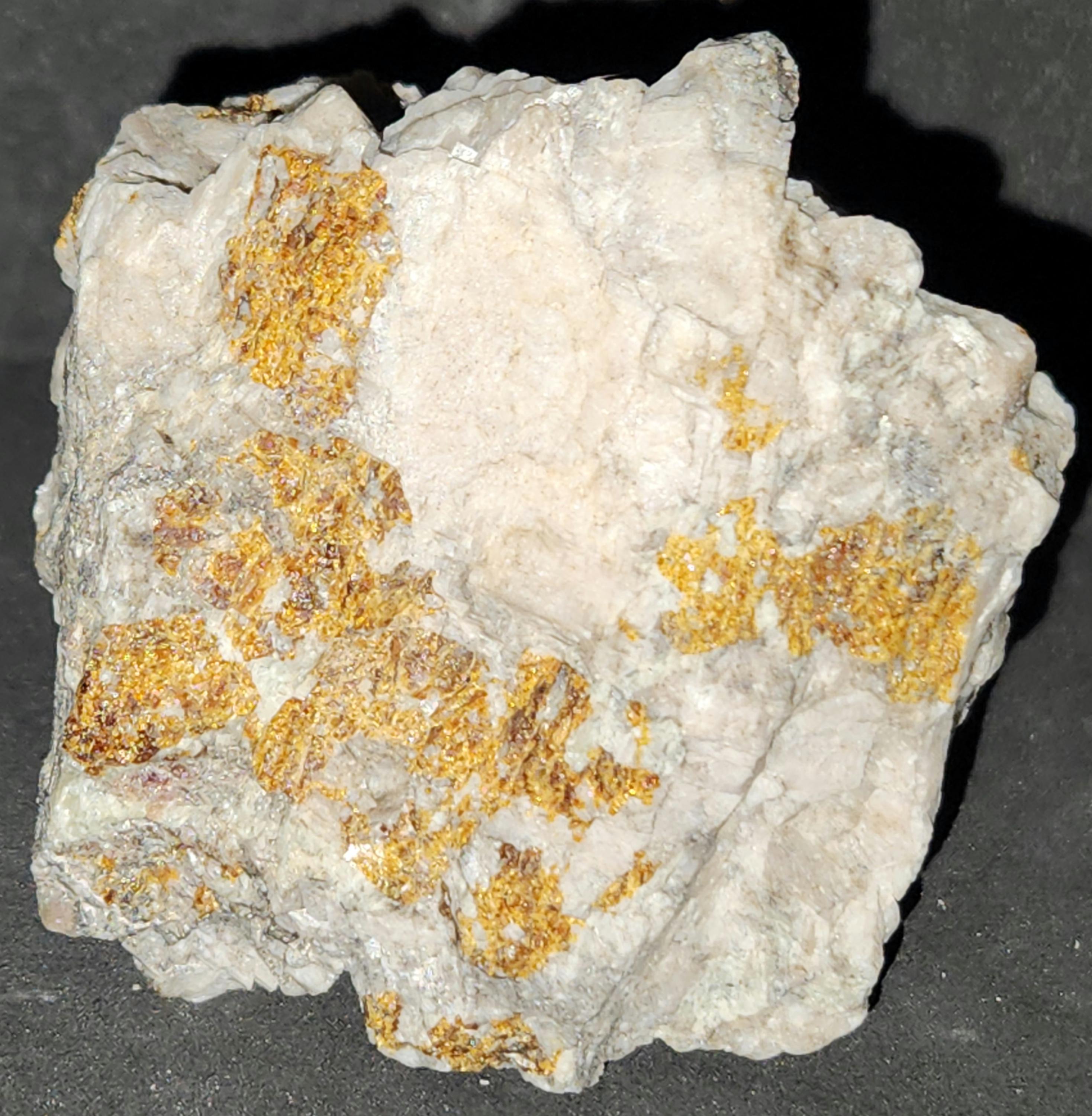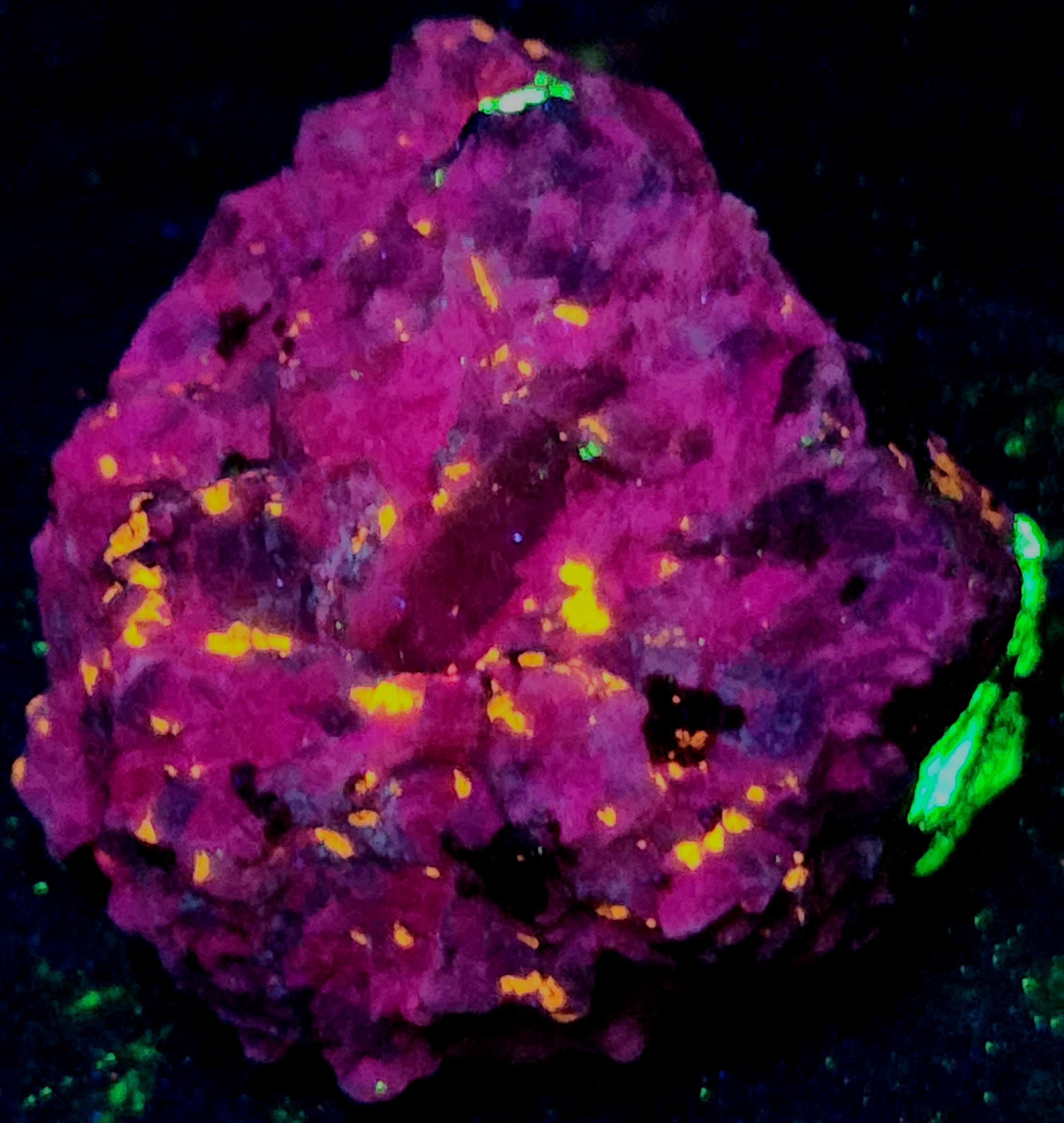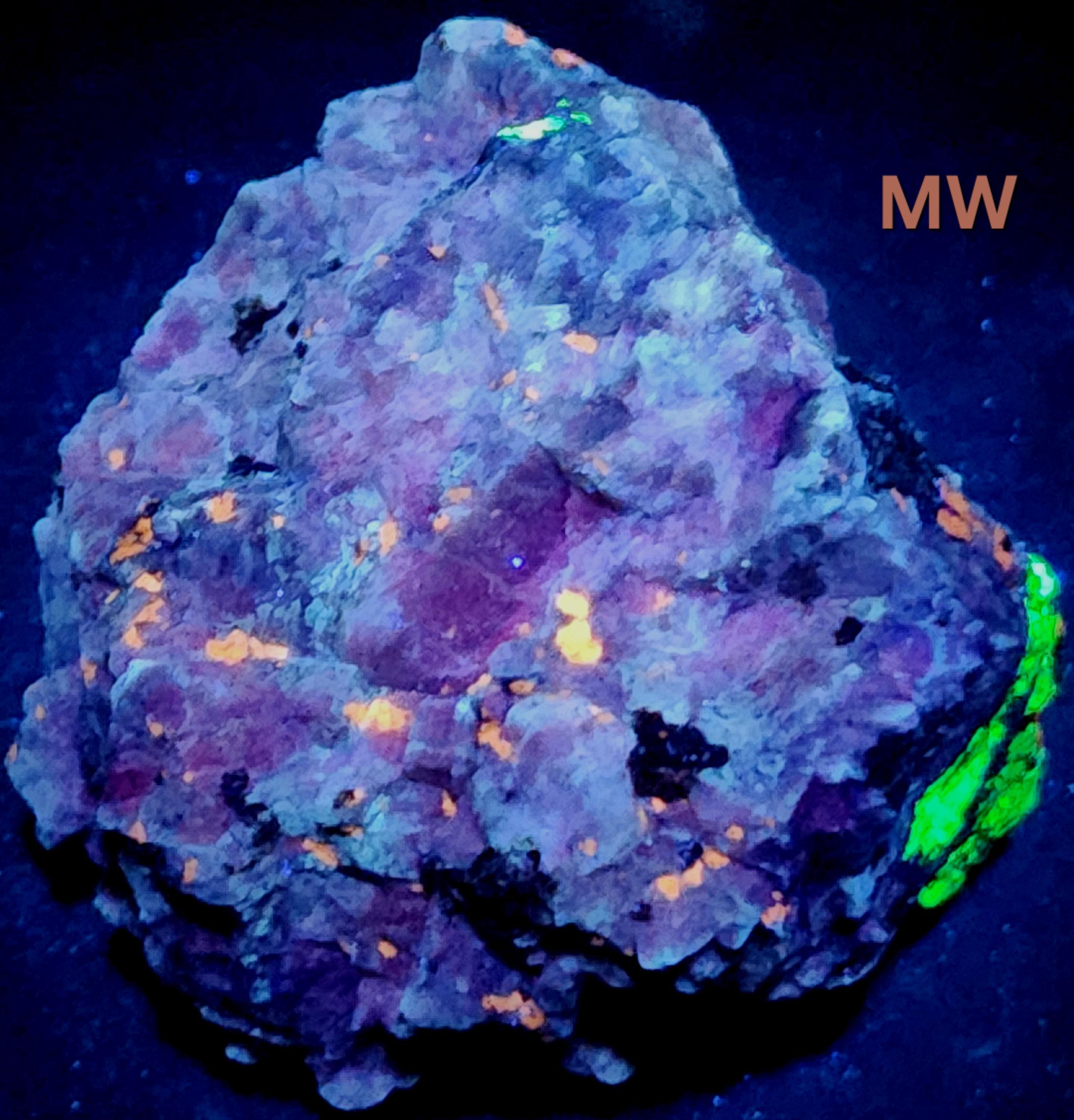 Fluorescent Fluorapatite (Orange SW & MW), Willemite (Bright Green SW, MW & LW) & Feldspar (Maroon SW)