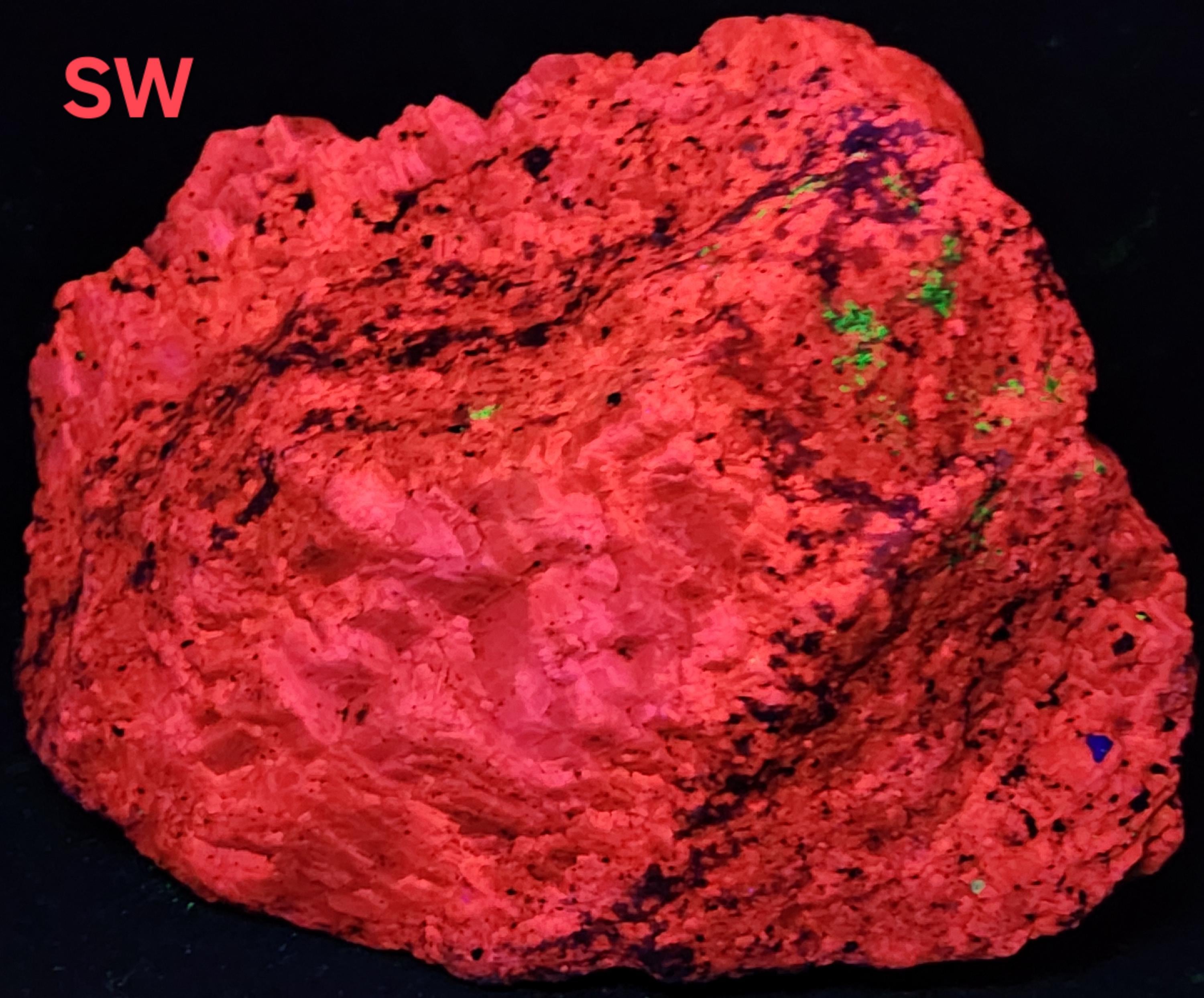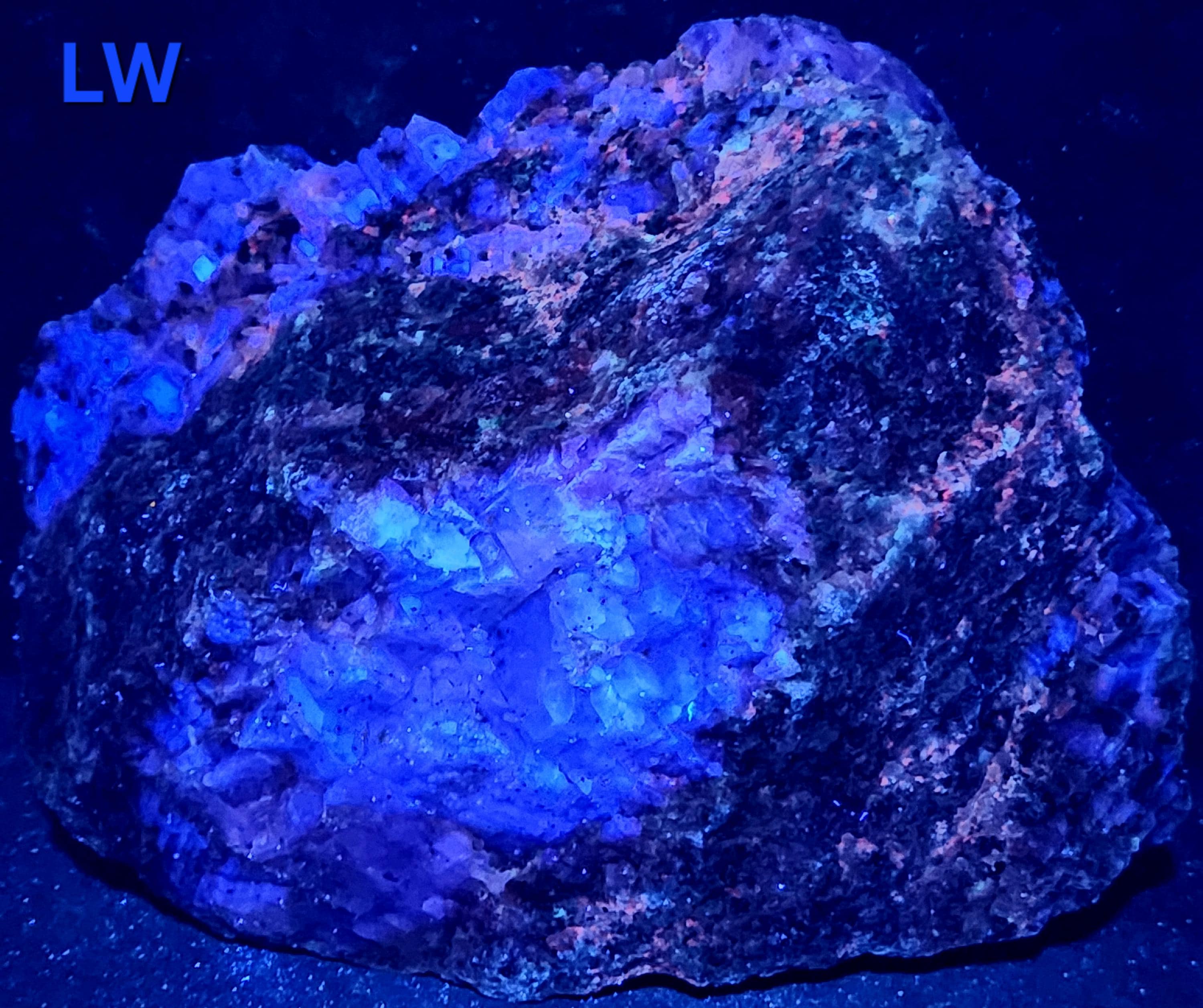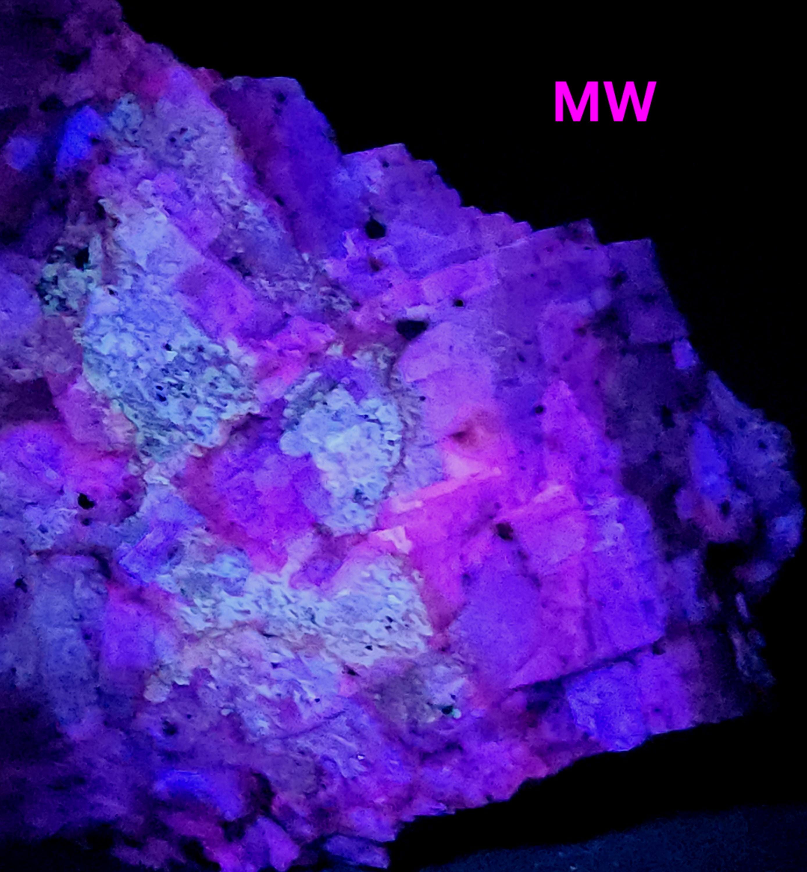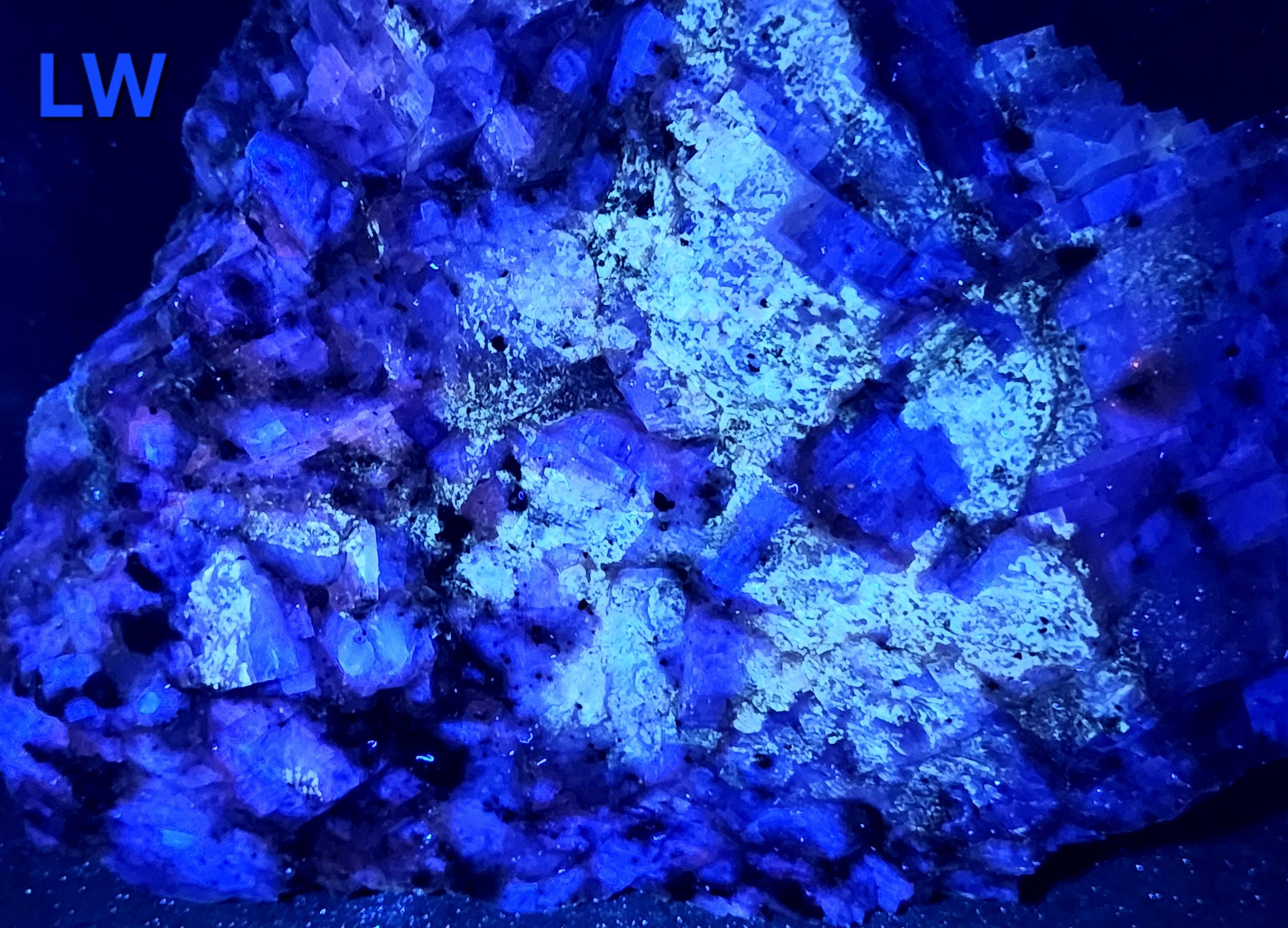 Under Midwave UV Fluorescent Light the Calcite is Bright Blue & Pink/Red. Under Longwave UV it's Similar, but the Colors are Deeper and a Bit Less Bright. The Bright Deep Blue was Overpowering the Red Highlights, so the LW Pics Don't Capture the Red Well, and it Looks Much Better in Person! SW UV shows a Bright Pink/Red, and a Few Specks of Green Willemite Too! There is also an Unidentified Mineral that Shows Bright Yellow-White Under MW & LW UV - Likely a Carbonate Mineral of Some Kind.