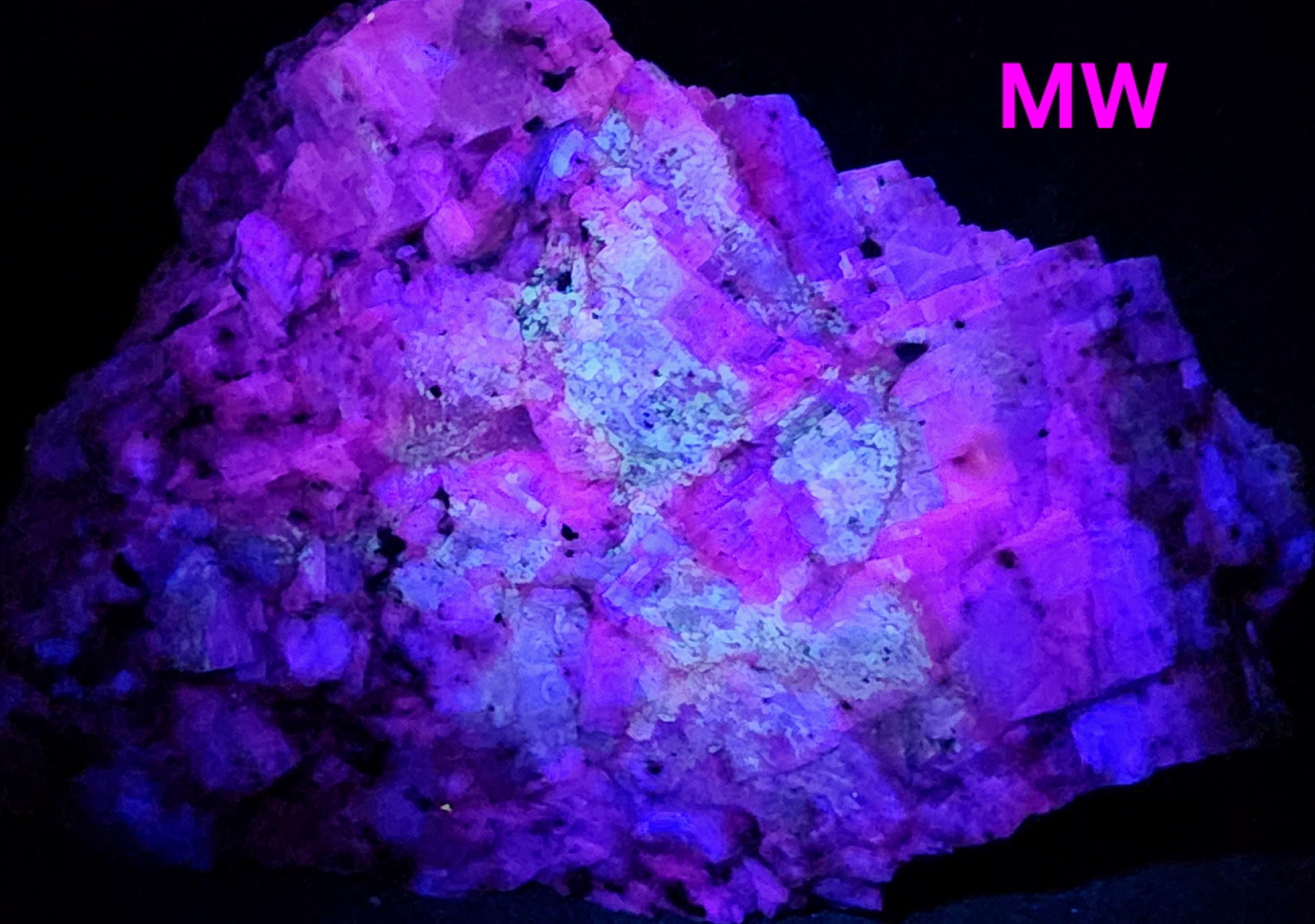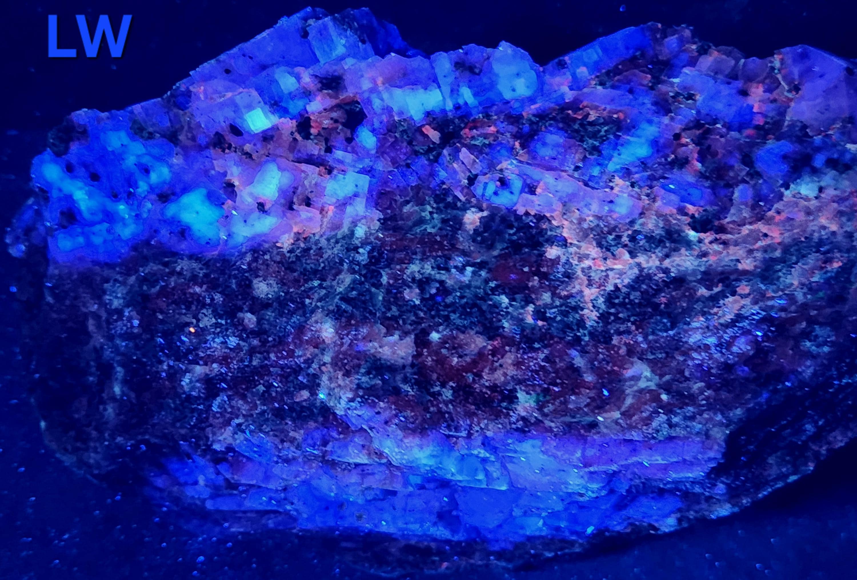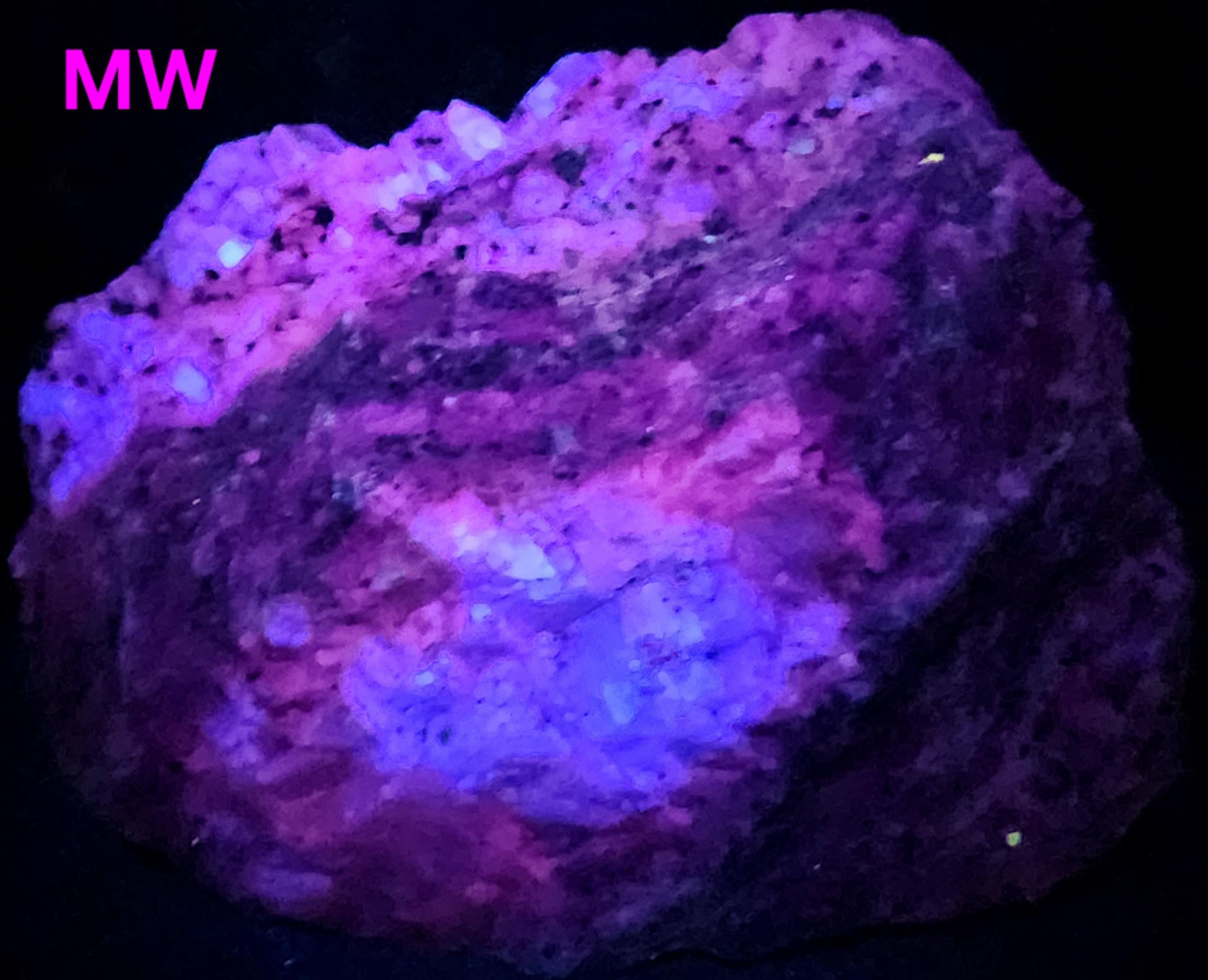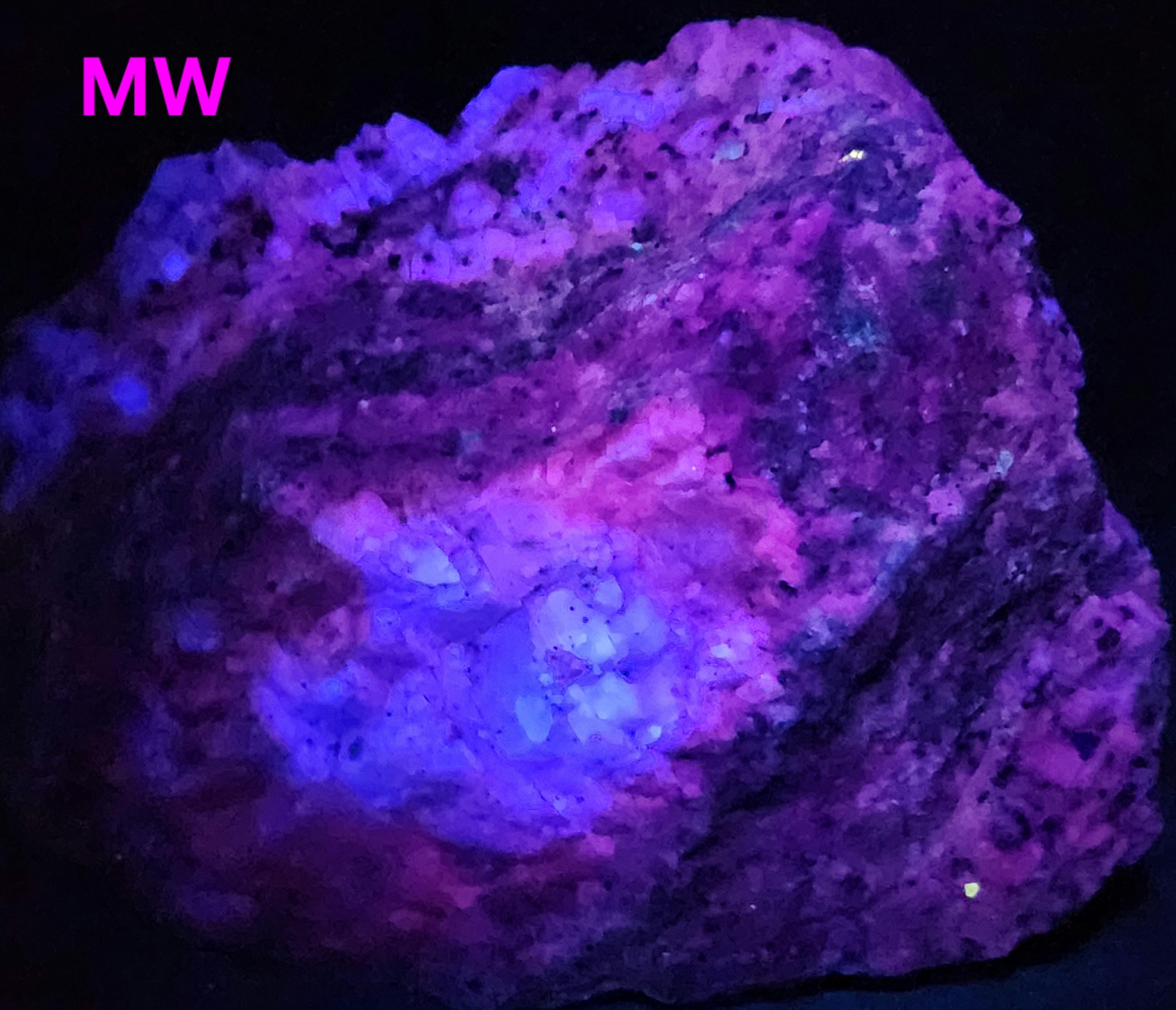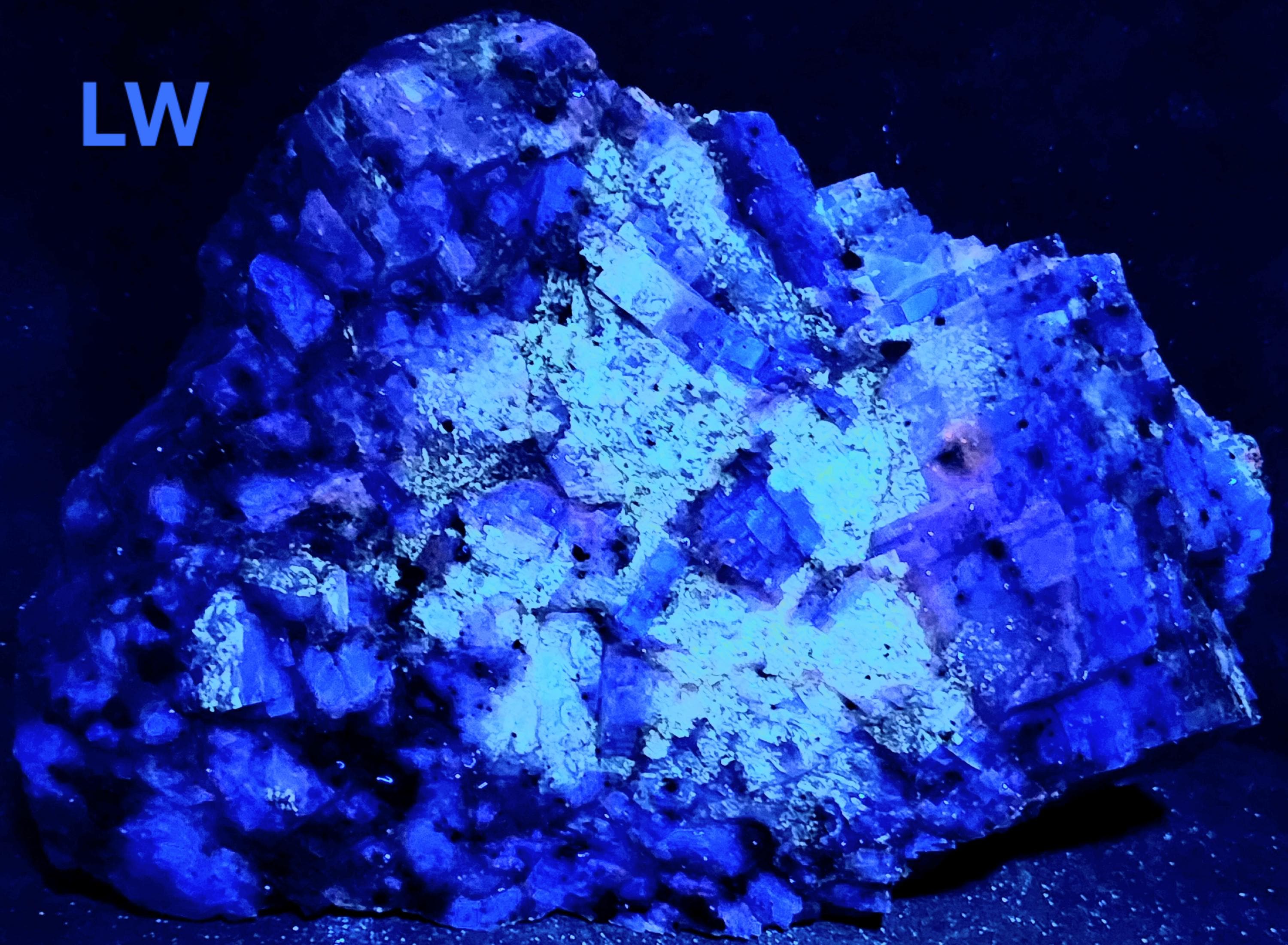 Under Midwave UV Fluorescent Light the Calcite is Bright Blue & Pink/Red. Under Longwave UV it's Similar, but the Colors are Deeper and a Bit Less Bright. The Bright Deep Blue was Overpowering the Red Highlights, so the LW Pics Don't Capture the Red Well, and it Looks Much Better in Person! SW UV shows a Bright Pink/Red, and a Few Specks of Green Willemite Too! There is also an Unidentified Mineral that Shows Bright Yellow-White Under MW & LW UV - Likely a Carbonate Mineral of Some Kind.