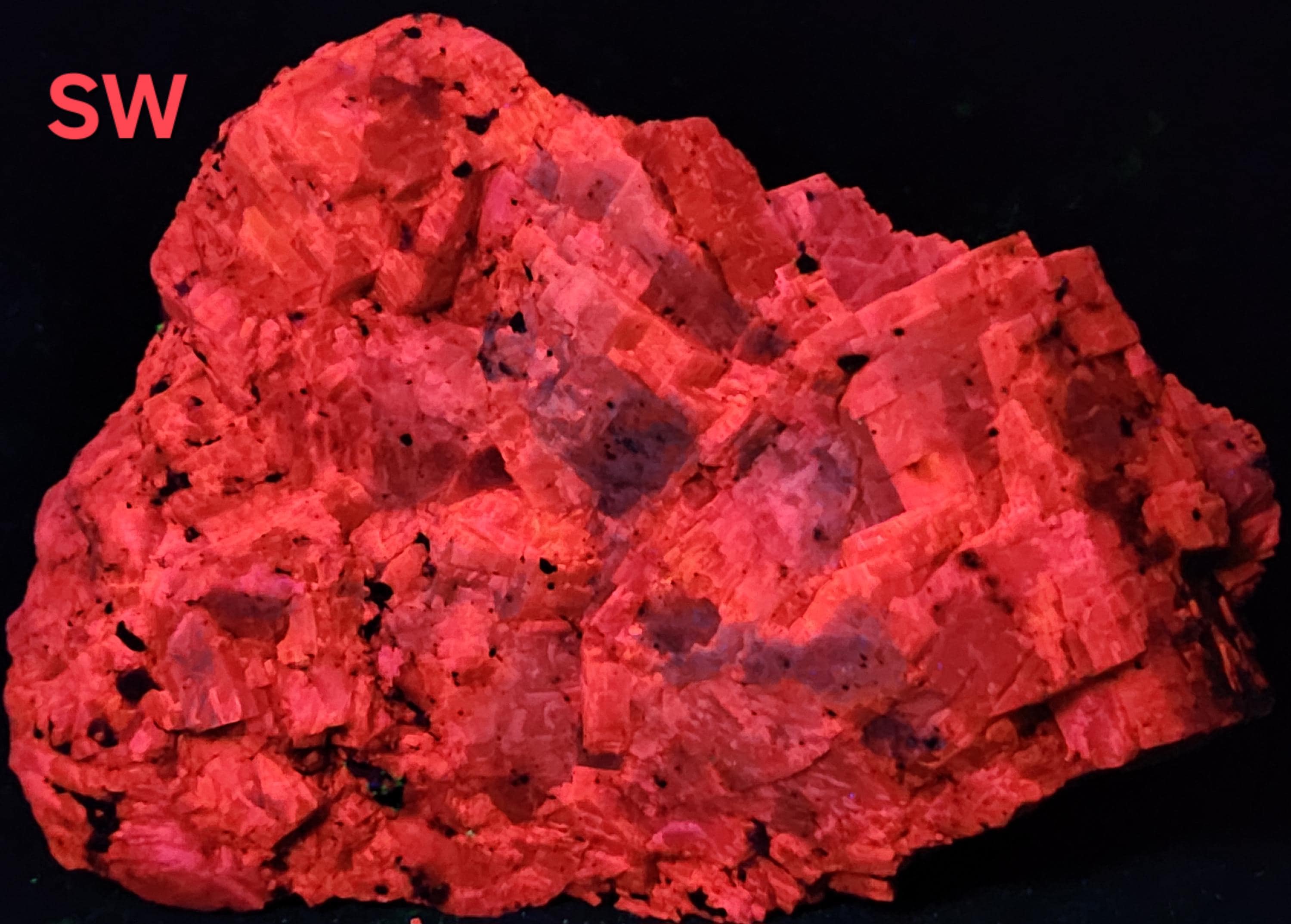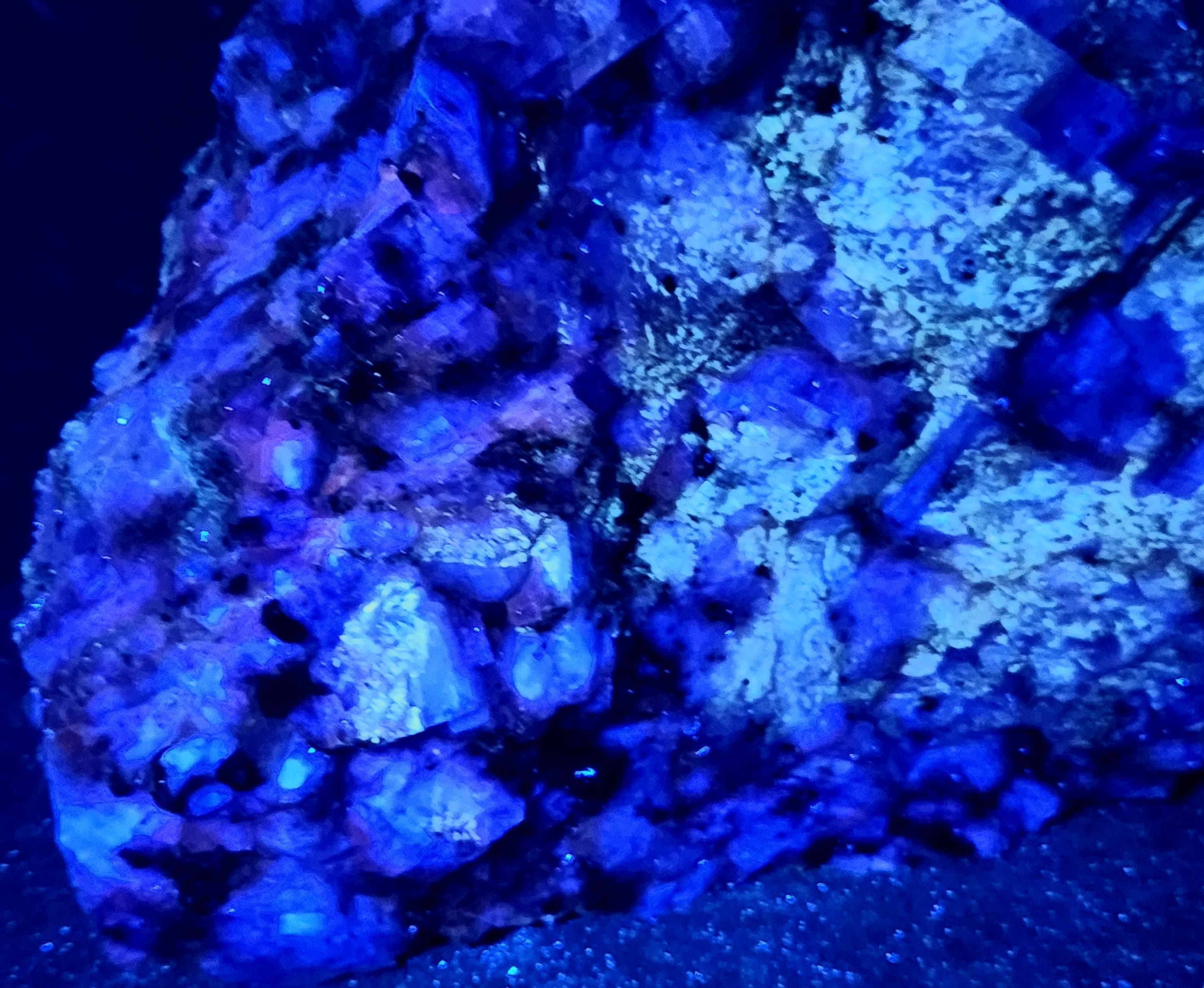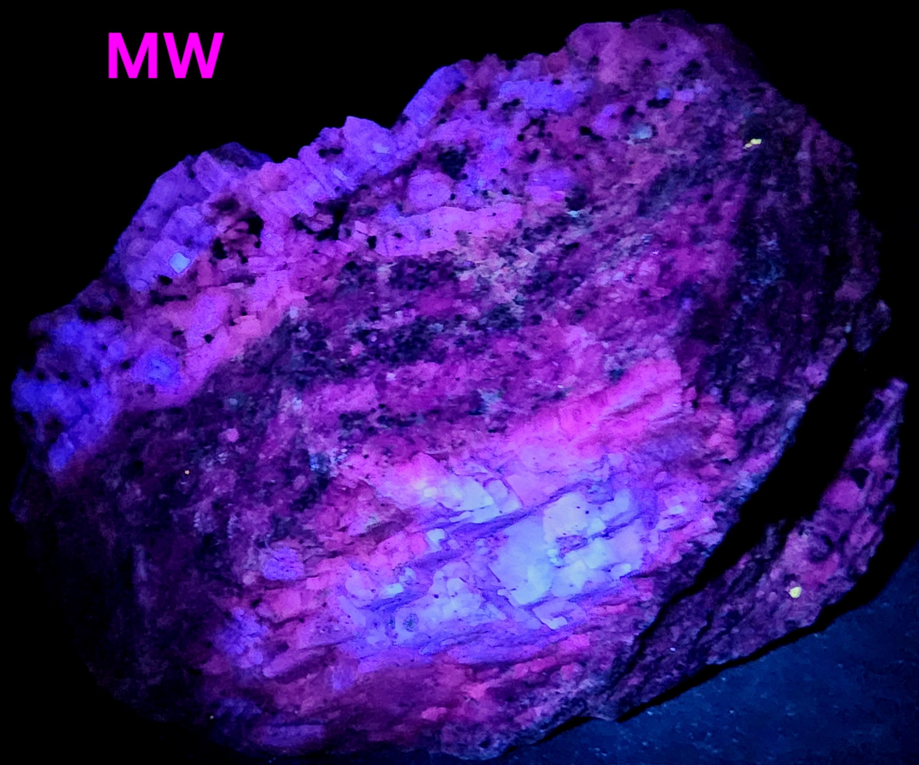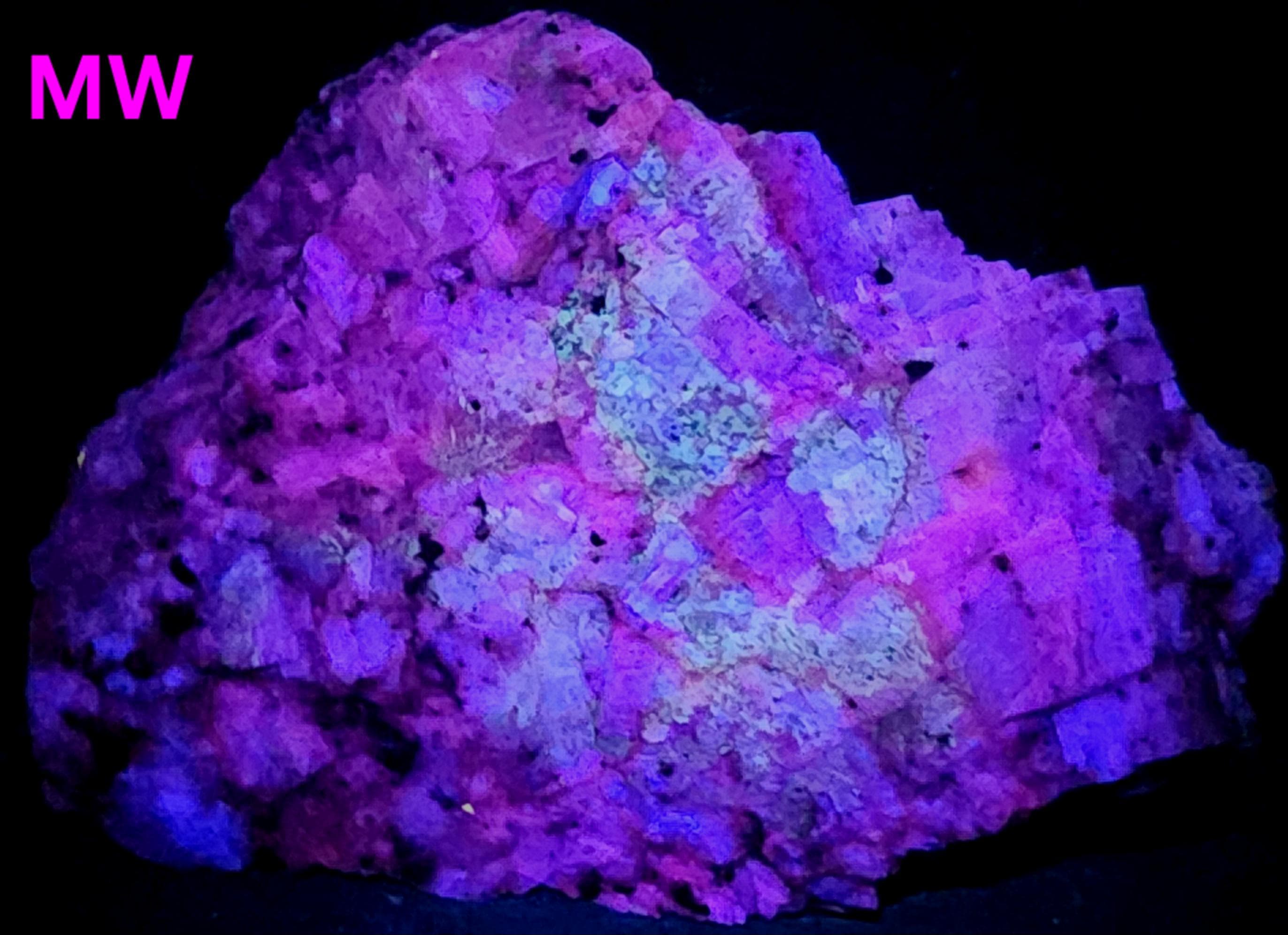 Under Midwave UV Fluorescent Light the Calcite is Bright Blue & Pink/Red. Under Longwave UV it's Similar, but the Colors are Deeper and a Bit Less Bright. The Bright Deep Blue was Overpowering the Red Highlights, so the LW Pics Don't Capture the Red Well, and it Looks Much Better in Person! SW UV shows a Bright Pink/Red, and a Few Specks of Green Willemite Too! There is also an Unidentified Mineral that Shows Bright Yellow-White Under MW & LW UV - Likely a Carbonate Mineral of Some Kind.