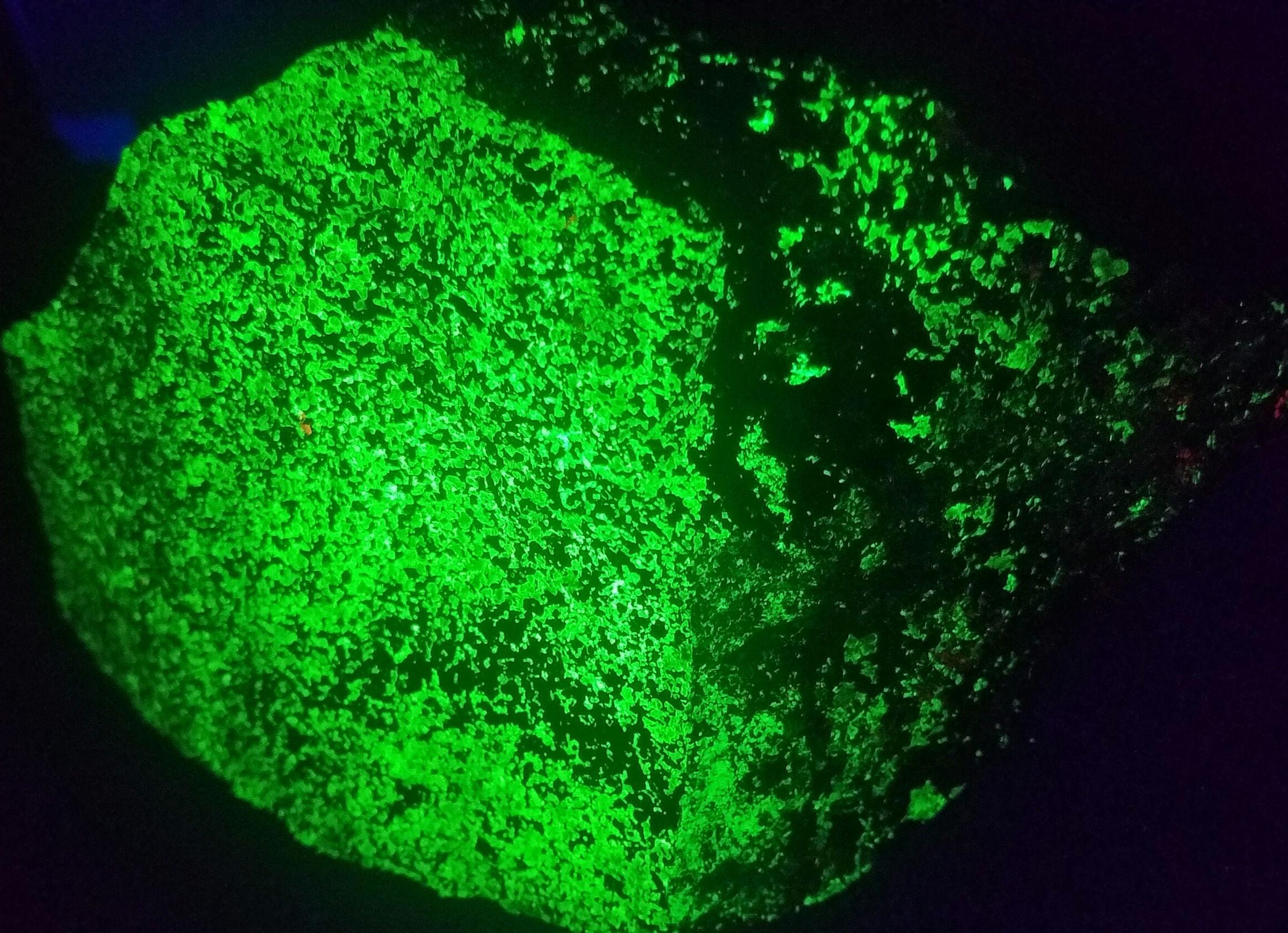 Fluorescent Willemite (Bright Green SW & Duller Green LW + SW Phosphorescent) & Minor Calcite (Bright Red/Orange SW)